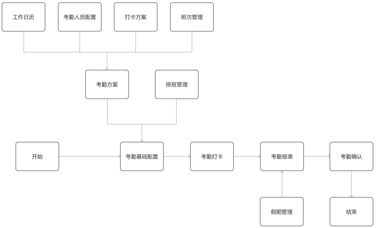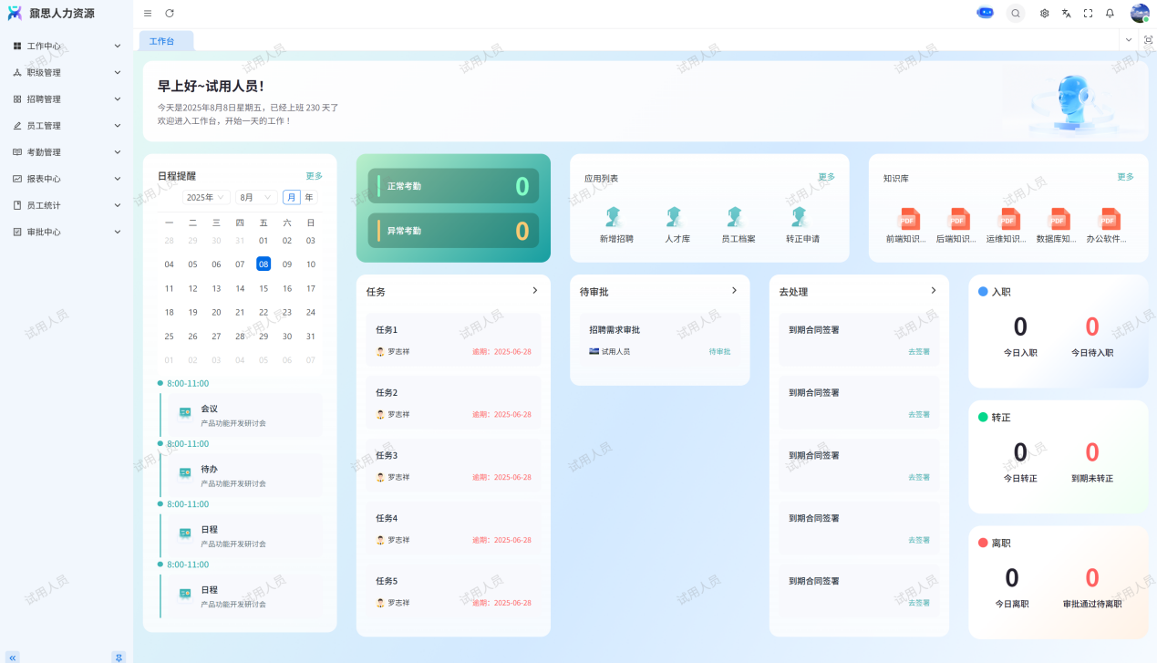 1\.文档作用及基础操作说明 1\.1文档作用 本文旨在为HR管理员、部门负责人及普通员工提供一套标准化的系统操作指南。通过清晰阐述各功能模块的使用方法、操作流程及注意事项,帮助用户快速掌握系统操作技巧,提高人力资源事务处理效率(如员工信息管理、考勤管理、排班调度等),同时确保数据操作的规范性,降低因操作不当引发的错误风险。本手册适用于系统的日常使用、新员工入职及问题排查时的参考依据。 1\.2适用人群 1\.企业人力资源管理者 2\.公司高层及决策者 3\.各部门管理人员与普通员工 1\.3系统登录   1\.4界面布局 系统默认采用 “水平导航栏\+左侧菜单栏\+主内容区” 的混合布局,可点击顶部导航栏的“布局设置”图标,选择所需布局即可实时切换。各区域功能如下: 水平导航栏:包含系统logo、用户信息(头像/姓名)、消息通知(如审批提醒)、退出登录按钮,以及功能模块分类(如“招聘管理”“员工管理”“考勤管理”等)。 左侧菜单栏:用于展示各功能模块下的子菜单项(如 “招聘管理” 下包含“招聘需求”“候选人”“人才库”),支持折叠/展开以优化操作体验。 主内容区:展示当前操作的具体页面(如员工档案详情、统计报表),包含数据表格、操作按钮(新增/编辑/删除)、筛选条件(日期/部门/状态)及辅助工具(导出/预览),界面风格简洁。 1\.5功能操作 1\.5\.1框架功能 系统核心功能围绕HR全流程管理设计,主要模块及核心功能如下: 1\.职级管理:构建薪酬职级体系,涵盖序列、职级、职等、薪资定义,明确各岗位层级与晋升路径,助力员工职业发展规划。 2\.招聘管理:整合招聘需求,集中管理简历筛选、面试安排及录用决策等流程,储备人才资源。 3\.员工管理:涵盖员工档案创建、信息维护(含关键信息的健康度)、入职、转正、离职等异动业务流程处理。 4\.考勤管理:包含工作日历、班次管理、打卡方案、异常处理、考勤报表、排班管理等模块,为薪资核算提供依据。 1\.5\.2基础功能 1\.5\.2\.1组织架构配置 明确公司/部门组织层级结构,为岗位提供“所属部门”维度(例如市场专员”岗位归属于“市场部”组织下)。 操作路径:【鼐思企管】租户平台→【组织管理】→【组织档案】→【新增组织】 1\.5\.2\.2岗位信息配置 岗位作为连接“组织”与“岗位等级”的中间层,需明确岗位与组织的归属关系,以及岗位所对应的岗位等级(例如“市场专员”岗位属于“员工级”)。 操作路径:【鼐思企管】租户平台→【组织管理】→【岗位管理】→【岗位等级】→【新增岗位等级】→【岗位管理】→【新增岗位信息】 1\.5\.2\.3审批流程配置 在HR系统中,部分业务涉及审批流程。为确保各项业务能够顺利流转,应根据实际业务需求,提前配置对应的审批流程。 操作路径:【鼐思企管】租户平台→【工作流程】→【流程管理】 (1)复用审批流程模型:【模型模板】→【复用模型】 (2)设计审批流程:【流程模型】→【设计流程】→【发布流程】 1\.5\.2\.4薪酬职级体系配置 搭建公司统一的职级框架,明确岗位序列分类、职级划分以及对应的职等关系,为薪酬体系提供“序列\-职级\-职等”的关联基础。在此职级体系基础上,制定相应的薪资标准,同时为员工信息管理提供数据支持。 操作路径:【鼐思人力资源】系统→【职级管理】→【薪酬职级体系】 1\.5\.2\.5员工规则设置 员工设置模块是支撑员工关键业务(转正、调薪和合同)规范化运行的基础,需提前完成业务规则定义与模板数据准备,确保后续业务流程自动调用预设规则和模板,从而提升工作效率。 业务规则:通过预设转正、调薪、合同管理的规则逻辑,实现业务流程的标准化触发(如自动提醒、通用新人计划)、条件限制(如调薪申请条件)及时间判定(如转正延期时间)。 模版设置:提前维护合同、协议、员工证明的标准模版,确保在合同签订、员工档案管理业务中直接调用预设模版。 其他(祝福业务配置):通过系统自动触发生日、入职周年、节日祝福,增强员工归属感,相关配置内容需提前设定模版。 操作路径:【鼐思人力资源】系统→【员工管理】→【员工设置】 1\.5\.2\.6考勤基础数据设置 在使用考勤打卡功能之前,需先完成考勤方案的设置及基础规则的数据配置,方可启用打卡功能。 操作路径:【鼐思人力资源】系统→【考勤管理】→【考勤设置】 1\.6业务功能描述 1\.6\.1招聘业务流程 招聘业务流程是从招聘需求发起至新员工正式入职的全链条管理过程,整体可概括为:需求部门提交招聘需求并经审核通过后,由HR 部门发布岗位信息并收集简历,HR与需求部门共同确定面试候选人。候选人经多轮面试(初面、复面、终面)评估后,HR 完成背景调查并沟通录用细节,随后发起录用入职申请,经审核通过后向候选人发放正式 offer;候选人确认接受后,HR 统筹推进入职流程,包括材料收集、信息登记、入职引导及资源配置,形成 “需求发起 \- 简历筛选 \- 面试评估 \- offer 发放 \- 入职办理” 的完整闭环。  1\.6\.2考勤业务流程 考勤管理模块通过整合考勤设置、规则配置、记录追踪、假期管理、异常处理、报表生成及结果确认功能,构建全流程的员工出勤管理体系。 考勤设置作为管理基础,通过定义工作日历、打卡方案等关键要素搭建起考勤方案框架,并结合排班管理和班次管理灵活适配多种工作模式;考勤规则明确了全