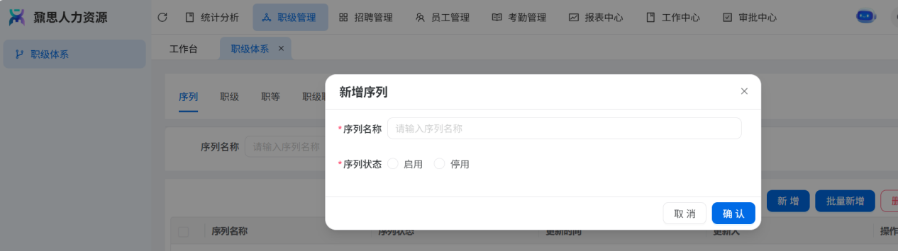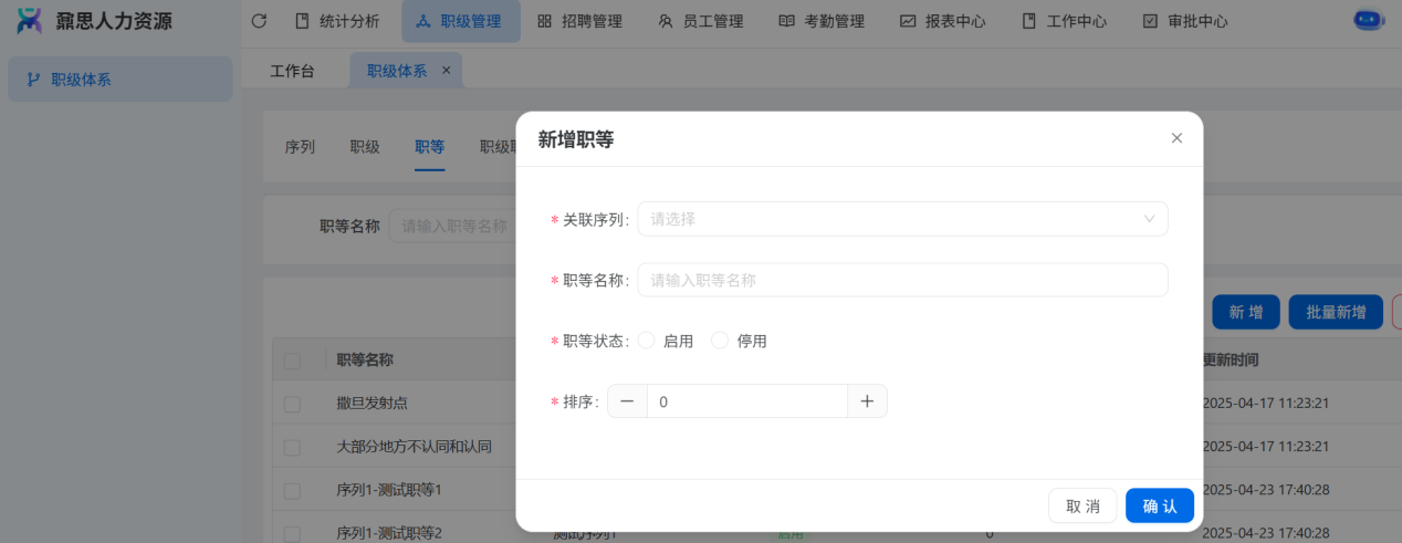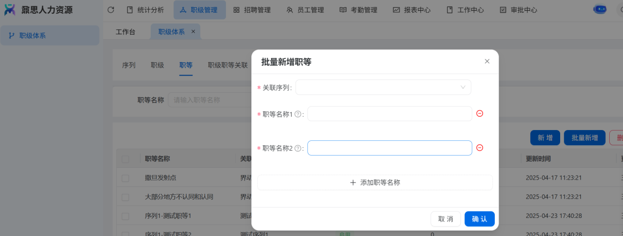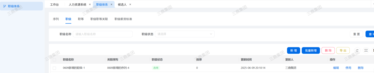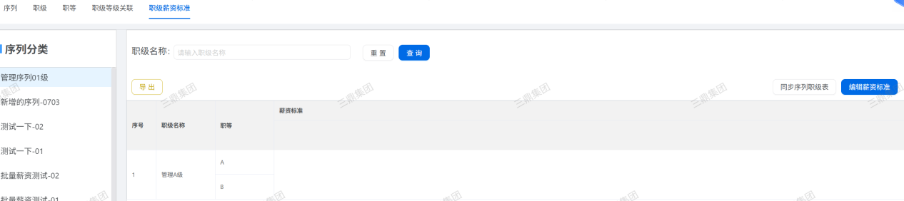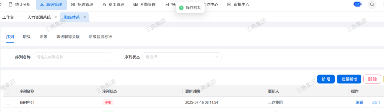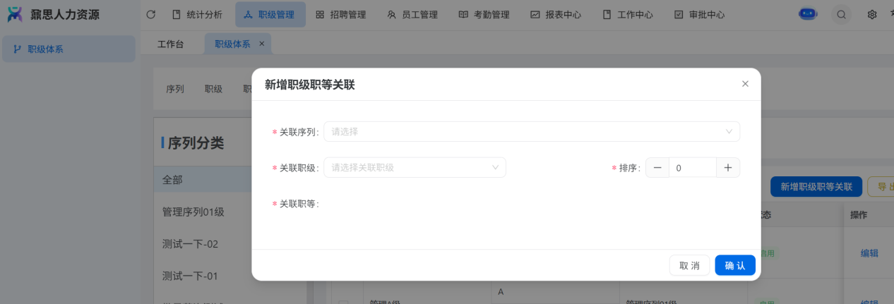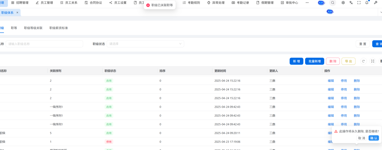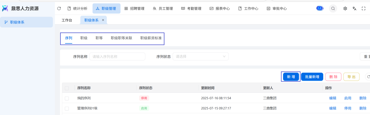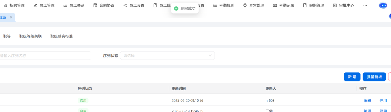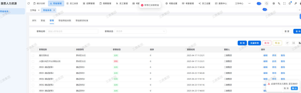 2\.职级管理 职级体系通过整合序列、职级和职等信息,构建起标准化的员工职业发展通道,同时为薪酬核算提供等级依据,保障薪酬分配的公平性与合理性。 序列:作为职级体系的基础分类,序列依据员工的岗位性质、工作内容和职业发展方向进行划分(如管理序列、技术序列、职能序列等),不同序列对应各自独立的职业发展路径,为职级和职等的设置提供了分类框架。 职级:在同一序列内,职级代表员工的岗位层级和能力水平,反映其在该序列中的纵向发展阶段。职级的设定与序列紧密关联,不同序列的职级名称和层级数量可根据实际需求差异化配置。 职等:职等用于平衡不同职级之间的岗位价值,同一职等可对应同一序列中的多个不同职级。 2\.1序列 2\.1\.1新增序列 点击“职级管理\-薪酬职级体系\-序列”进入序列信息管理界面。 添加序列信息的方式有两种:①点击“新增”按钮逐条添加,②点击“批量新增”进行批量添加。    2\.1\.2停用/启用序列 停用:系统停止执行该序列,序列状态变为“停用”。  启用:系统执行该序列,序列状态变为“启用”。  2\.1\.3删除序列 未绑定职级信息的序列可以删除,已绑定职级信息的序列不可删除。   2\.2职级 2\.2\.1新增职级 点击“职级管理\-薪酬职级体系\-职级”进入职级信息管理界面。 添加职级信息的方式有两种:①点击“新增”按钮逐条添加,②点击“批量新增”进行批量添加(需绑定对应的序列)   2\.2\.2停用/启用职级 停用:系统停止执行该职级。  启用:系统执行该职级。  2\.2\.3删除职级 职级若未绑定职等信息可以删除,若已关联职等信息的职级不可删除。   2\.3职等 2\.3\.1新增职等 点击“职级管理\-薪酬职级体系\-职等”进入职等信息管理界面。 添加职等信息的方式有两种:①点击“新增”按钮逐条添加,②点击“批量新增”进行批量添加。   2\.3\.2停用/启用职等 停用:系统停止执行该职等。  启用:系统执行该职等  2\.3\.3删除职等 未关联职级信息的职等可以删除,已关联职级信息的职等则不可删除。   2\.4职级职等关联 2\.4\.1新增职级职等 点击“职级管理\-薪酬职级体系\-职级职等关联”,进入职级职等关联数据界面。新增职级职等:选择对应的序列、职级和职等数据,完成关联操作。  2\.4\.2编辑职级职等 点击“编辑”按钮,可调整序列、职级与职等之间的关联信息。  2\.4\.3删除关联数据 点击“删除”按钮并确认后,该关联的序列、职级及职等数据将失效。  2\.5职级薪资标准 2\.5\.1同步序列职级表 点击“同步序列职级表”按钮以更新序列职级及职等信息。  2\.5\.2编辑薪资标准 选择“序列”,点击“编辑薪资标准”,为不同组织设置对应的职级职等薪资定义。