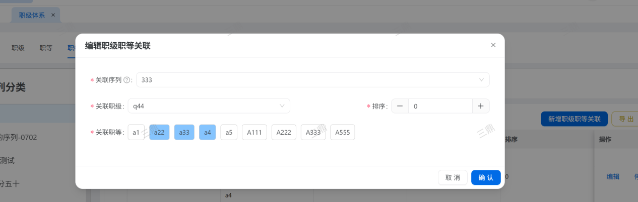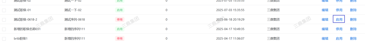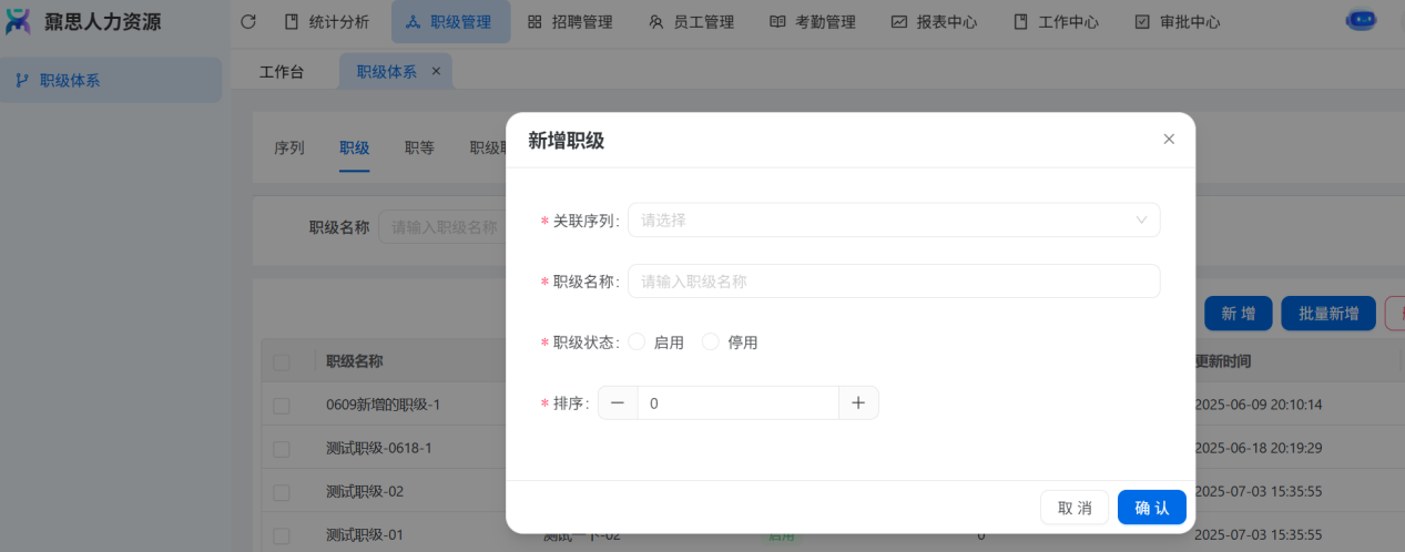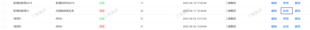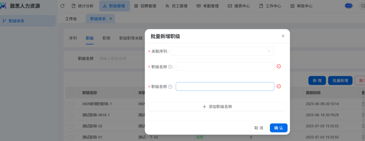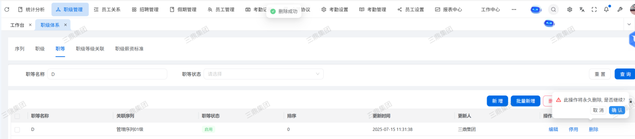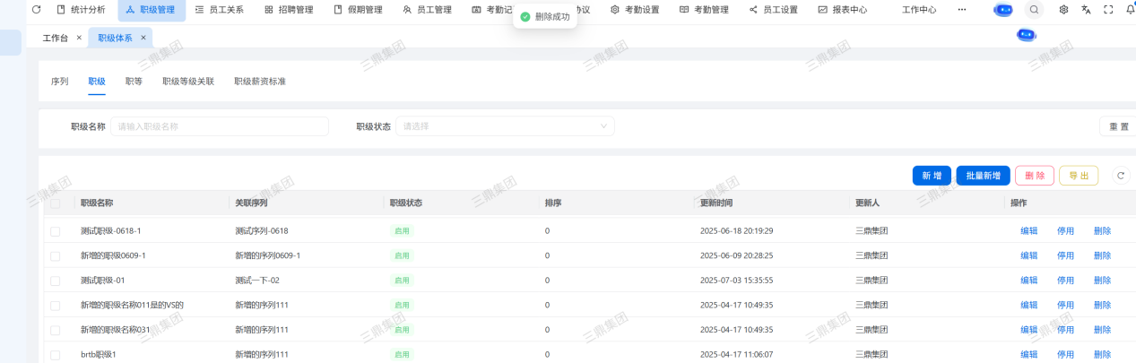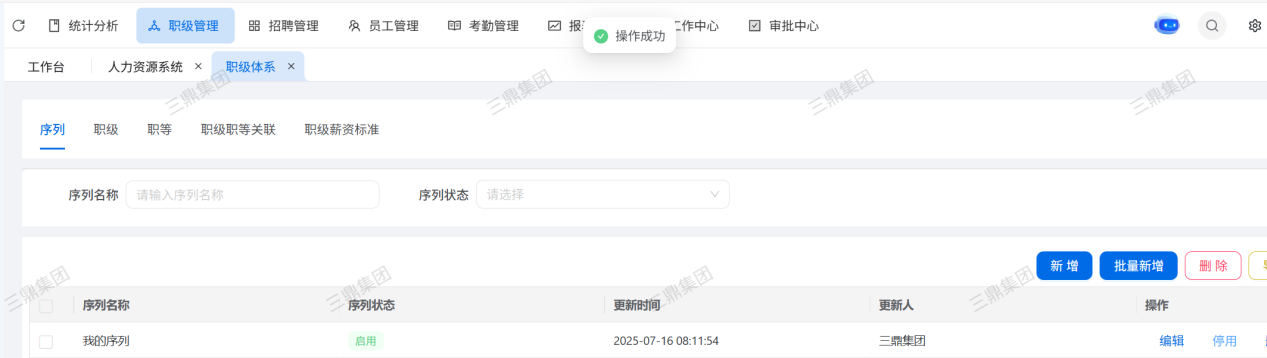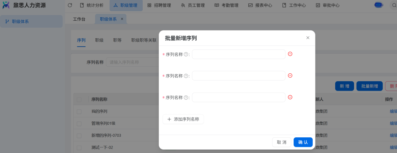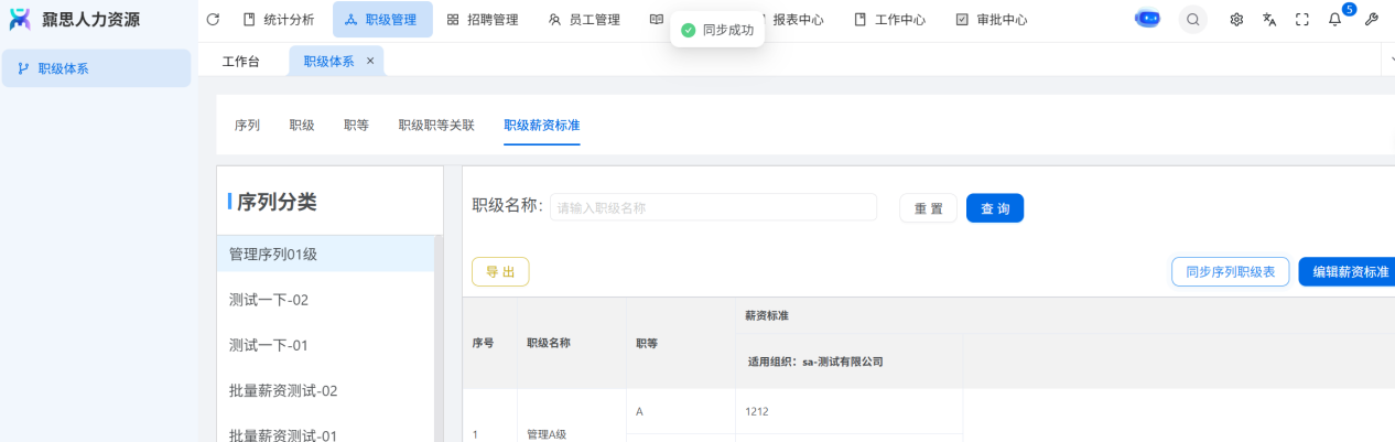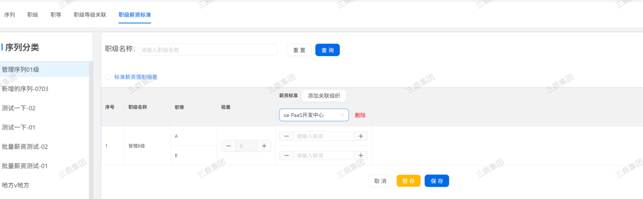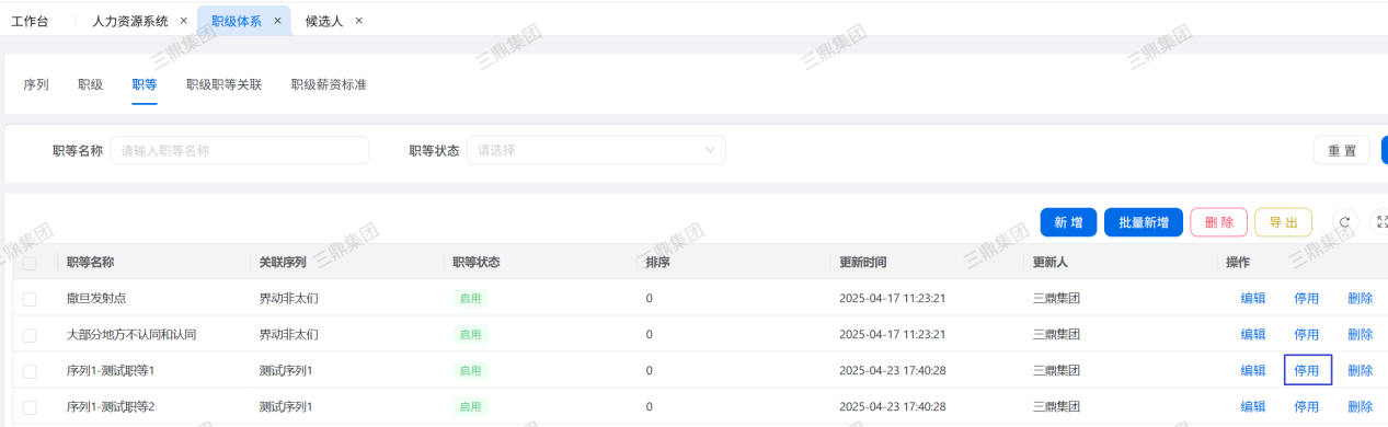 2\.职级管理 职级体系通过整合序列、职级和职等信息,构建起标准化的员工职业发展通道,同时为薪酬核算提供等级依据,保障薪酬分配的公平性与合理性。 序列:作为职级体系的基础分类,序列依据员工的岗位性质、工作内容和职业发展方向进行划分(如管理序列、技术序列、职能序列等),不同序列对应各自独立的职业发展路径,为职级和职等的设置提供了分类框架。 职级:在同一序列内,职级代表员工的岗位层级和能力水平,反映其在该序列中的纵向发展阶段。职级的设定与序列紧密关联,不同序列的职级名称和层级数量可根据实际需求差异化配置。 职等:职等用于平衡不同职级之间的岗位价值,同一职等可对应同一序列中的多个不同职级。 2\.1序列 2\.1\.1新增序列 点击“职级管理\-薪酬职级体系\-序列”进入序列信息管理界面。 添加序列信息的方式有两种:①点击“新增”按钮逐条添加,②点击“批量新增”进行批量添加。    2\.1\.2停用/启用序列 停用:系统停止执行该序列,序列状态变为“停用”。  启用:系统执行该序列,序列状态变为“启用”。  2\.1\.3删除序列 未绑定职级信息的序列可以删除,已绑定职级信息的序列不可删除。   2\.2职级 2\.2\.1新增职级 点击“职级管理\-薪酬职级体系\-职级”进入职级信息管理界面。 添加职级信息的方式有两种:①点击“新增”按钮逐条添加,②点击“批量新增”进行批量添加(需绑定对应的序列)   2\.2\.2停用/启用职级 停用:系统停止执行该职级。  启用:系统执行该职级。  2\.2\.3删除职级 职级若未绑定职等信息可以删除,若已关联职等信息的职级不可删除。   2\.3职等 2\.3\.1新增职等 点击“职级管理\-薪酬职级体系\-职等”进入职等信息管理界面。 添加职等信息的方式有两种:①点击“新增”按钮逐条添加,②点击“批量新增”进行批量添加。   2\.3\.2停用/启用职等 停用:系统停止执行该职等。  启用:系统执行该职等  2\.3\.3删除职等 未关联职级信息的职等可以删除,已关联职级信息的职等则不可删除。   2\.4职级职等关联 2\.4\.1新增职级职等 点击“职级管理\-薪酬职级体系\-职级职等关联”,进入职级职等关联数据界面。新增职级职等:选择对应的序列、职级和职等数据,完成关联操作。  2\.4\.2编辑职级职等 点击“编辑”按钮,可调整序列、职级与职等之间的关联信息。  2\.4\.3删除关联数据 点击“删除”按钮并确认后,该关联的序列、职级及职等数据将失效。  2\.5职级薪资标准 2\.5\.1同步序列职级表 点击“同步序列职级表”按钮以更新序列职级及职等信息。  2\.5\.2编辑薪资标准 选择“序列”,点击“编辑薪资标准”,为不同组织设置对应的职级职等薪资定义。