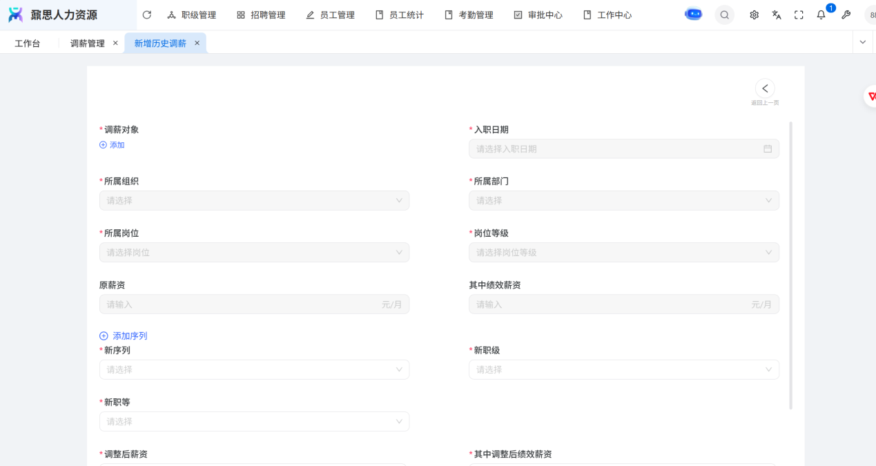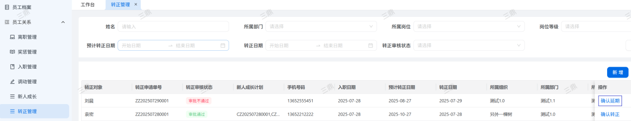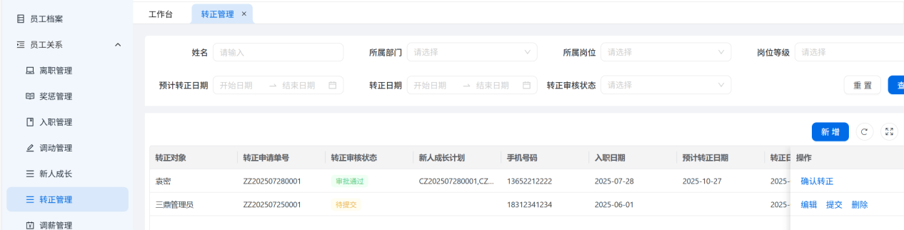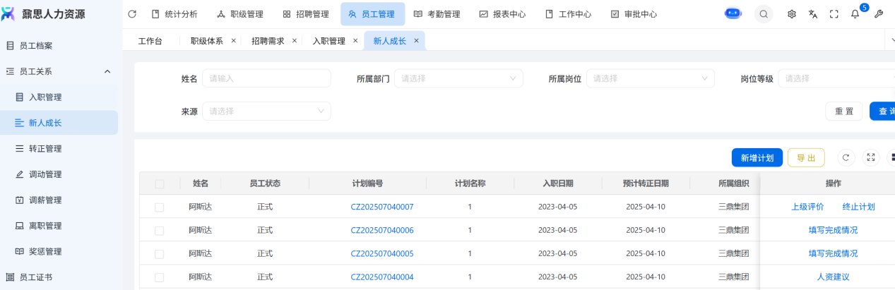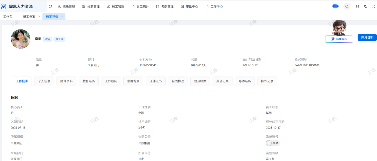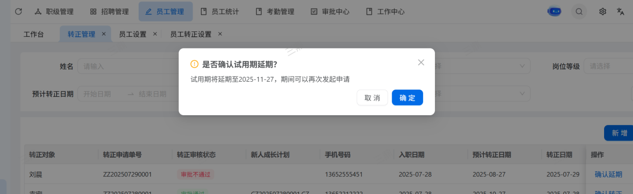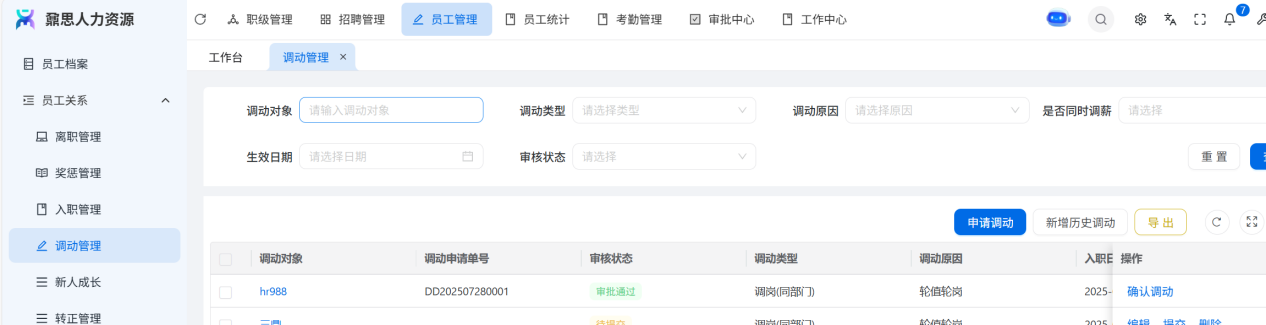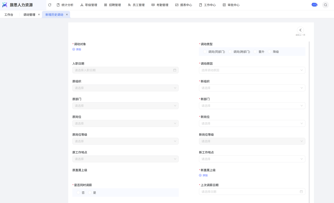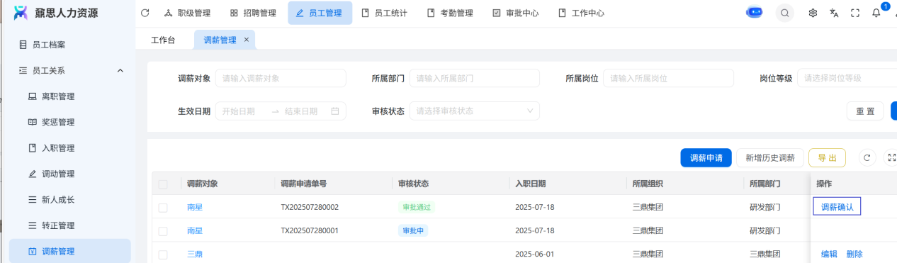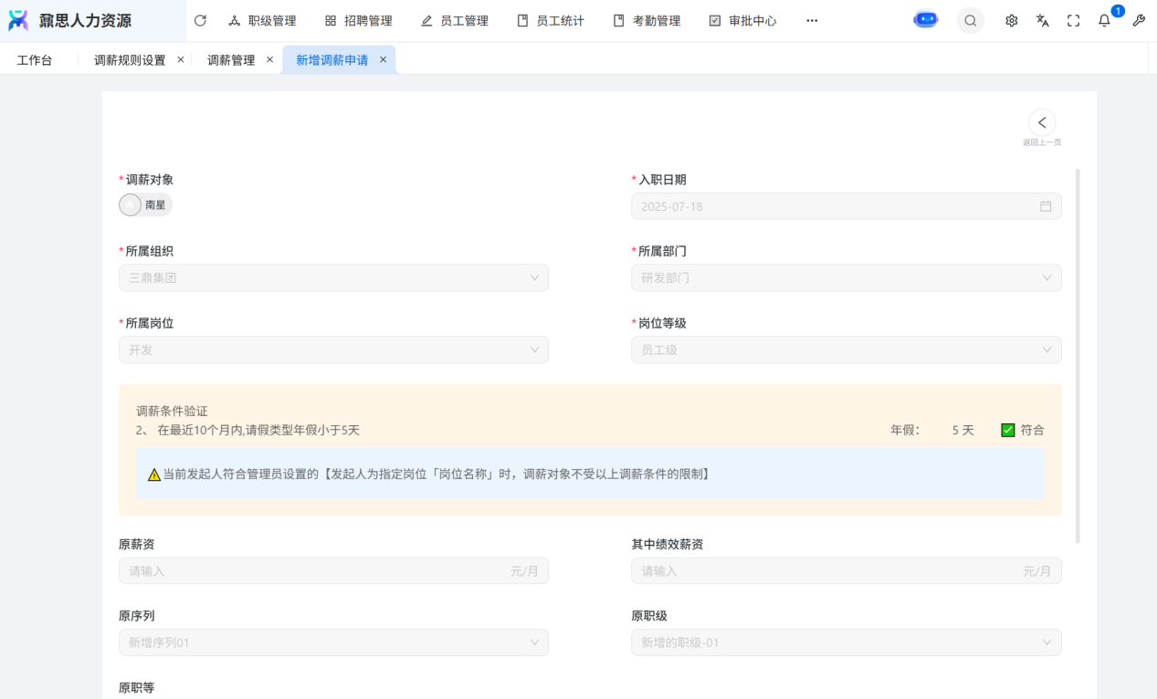 4\.员工管理 员工管理是企业对员工从入职到离职的全生命周期相关事务进行系统化、全面管理的核心模块,涵盖员工档案、入职管理、新人成长、转正管理、调动管理、调薪管理、离职管理、奖惩管理、员工证件管理、员工关怀、合同协议以及员工设置等多个子模块。各子模块之间紧密关联、协同运作,旨在实现员工管理的规范化与信息化,提高管理效率,确保员工信息的准确性和完整性。 4\.1员工档案 员工档案是员工管理的基础,主要功能包括员工基本信息的录入、存储、查询和修改。系统可记录员工的工作信息、个人信息、教育背景、工作经历、家庭成员情况及证件证书等内容,为企业构建全面、准确的员工信息库。这不仅为各项员工管理工作提供重要依据,也便于管理员及时掌握员工的基本情况,为人力资源决策提供有力支持。 在【入职管理】模块完成入职确认操作后,系统将在【员工档案】列表中自动生成对应的员工档案信息。 4\.1\.1新增档案 在新增员工档案数据时,点击“新增”按钮并填写相关档案信息,系统将自动生成对应的员工档案记录。   4\.1\.2查看员工档案 点击员工姓名,进入员工档案详情页面进行查阅。   4\.1\.3开具证明 在员工档案页面,可以为员工开具适用的证明文件。   4\.1\.4办理异常离职 在员工档案页面,有相应权限的用户可点击“办理异常离职”按钮,为员工办理异常离职业务。   4\.2员工关系 4\.2\.1入职管理 【候选人】模块完成确认录用后,系统将在【入职管理】列表中自动生成待入职记录。  4\.2\.1\.1新增入职人员 在新增待入职人员数据时,点击“新增”按钮并填写人员信息后,即可生成对应的待入职记录。   4\.2\.1\.2填写入职登记表 待入职人员需要登记基本信息,可通过以下两种方式完成:①向待入职人员发送入职登记表,由其自行填写;②由有权限的用户直接代为填写,直至完成信息登记。 向待入职人员发送入职登记表。  代为填写入职登记表。  4\.2\.1\.3调整入职日期 可为待入职人员调整入职日期,点击“调整入职日期”按钮并填写相关信息即可完成操作。  4\.2\.1\.4确认入职 点击“确认入职”按钮并填写相关信息,完成填写后,入职状态将从“待入职”变更为“已入职”。   4\.2\.1\.5取消入职 点击“取消入职”按钮并填写取消入职原因,完成填写后,入职状态将从“待入职”变更为“取消入职”。  4\.2\.1\.6指派导师 点击“指派导师”按钮,即可指定导师负责相应业务的跟进工作。   4\.2\.1\.7更换导师 如导师发生变更,可点击“更换导师”按钮进行调整。  4\.2\.2新人成长 【入职管理】模块完成入职确认后,系统将在【新人成长】列表中自动生成新员工的通用成长计划(通用计划在“员工设置\-转正设置\-新人成长”中进行配置)  4\.2\.2\.1新增成长计划 可根据实际情况在通用计划的基础上灵活新增成长计划,点击“新增计划”按钮,选择新员工并填写计划任务信息后,即可生成个性化的成长任务,同时可以通过“复制其他计划”按钮,复制他人的新人计划作为参考。  4\.2\.2\.2填写新人计划信息 根据新人计划内设定的阶段性步骤,逐步填写计划信息,内容包括:新员工填写计划完成情况、导师评价、直属上级评价及人力资源中心建议。   4\.2\.2\.3终止计划 根据实际需求,导师及直属上级有权终止新人计划,计划终止后系统将自动停止后续相关业务流程。  4\.2\.3转正管理 4\.2\.3\.1转正申请 员工试用期即将结束且已完成新人成长计划(若有)时,有权限的用户可通过系统发起员工转正申请,上传相关的转正材料,并根据员工信息及试用期间的表现情况,完善转正信息后提交审批;审核人需登录系统,前往【审批中心】完成转正审批。  4\.2\.3\.2确认转正 转正审批通过后,员工本人(即转正对象)需要点击“确认转正”按钮完成确认,至此转正流程结束。由于转正涉及薪资调整,待员工确认后,【调薪管理】模块将自动生成相应的调薪记录。   4\.2\.3\.3延期转正 若转正审批未通过,有权限的用户可点击“延期转正”按钮,可根据预设的延期时间重新发起转正申请。如未设置延期时间,则默认延期1个月(默认延期时间在“员工设置\-转正设置\-转正申请”中进行配置)   4\.2\.4调动管理 调动管理用于处理因企业业务调整或员工个人原因需变更岗位、部门或工作地点等情况。员工可通过系统提交调动申请,旨在实现人力资源的合理配置,满足企业各岗位的人员需求。 4\.2\.4\.1调动申请 有权限的用户可选择调动对象,完善调动信息后提交审批;审核人需登录系统,前往【审批中心】完成调动审批。    4\.2\.4\.2调动确认 调动审批通过后,员工本人(即调动对象)需完成调动确认操作,至此调动流程结束。若调动涉及薪资调整,经确认后,【调薪管理】模块将同步生成相应的调薪记录。   4\.2\.4\.3历史调动 支持记录历史调动信息,有权限的用户可在系统中新增历史调动信息(无需审批流程)  4\.2\.5调薪管理 调薪管理主要用于处理员工薪资调整相关事务,功能包括调薪申请的提交、调薪信息的记录以及生效时间等;调薪管理列表页整合了其他功能模块中涉及薪资的相关数据,包括【调薪管理】模块中的调薪申请和历史调薪记录、【调动管理】中涉及薪资调整的记录,以及【转正管理】中与调薪相关的记录。 4\.2\.5\.1调薪申请(有调薪规则) 若设置调薪规则,有权限的
