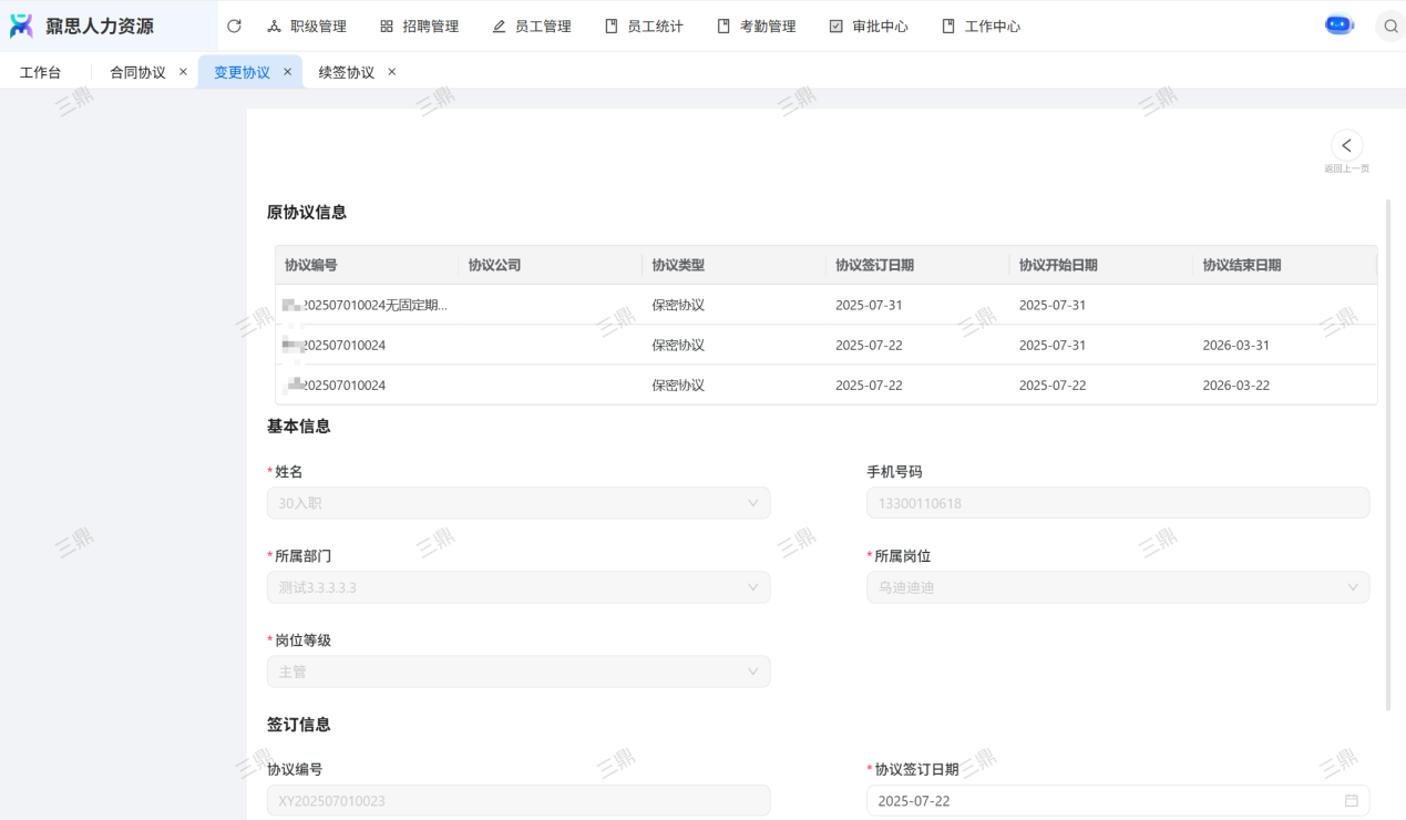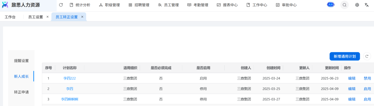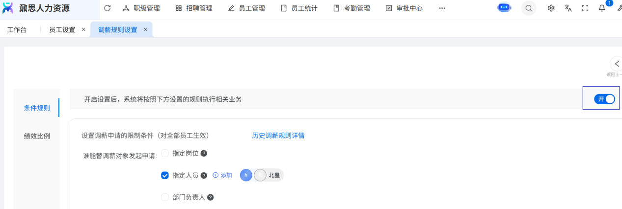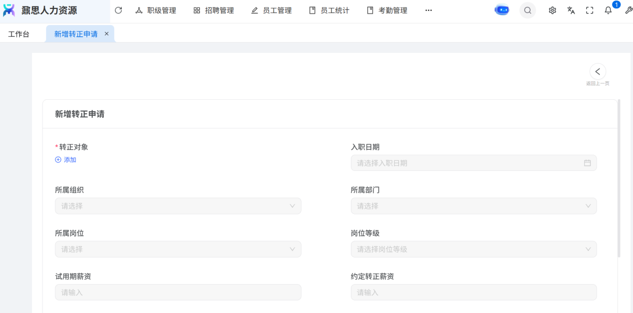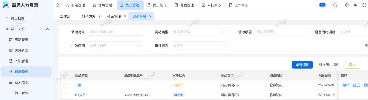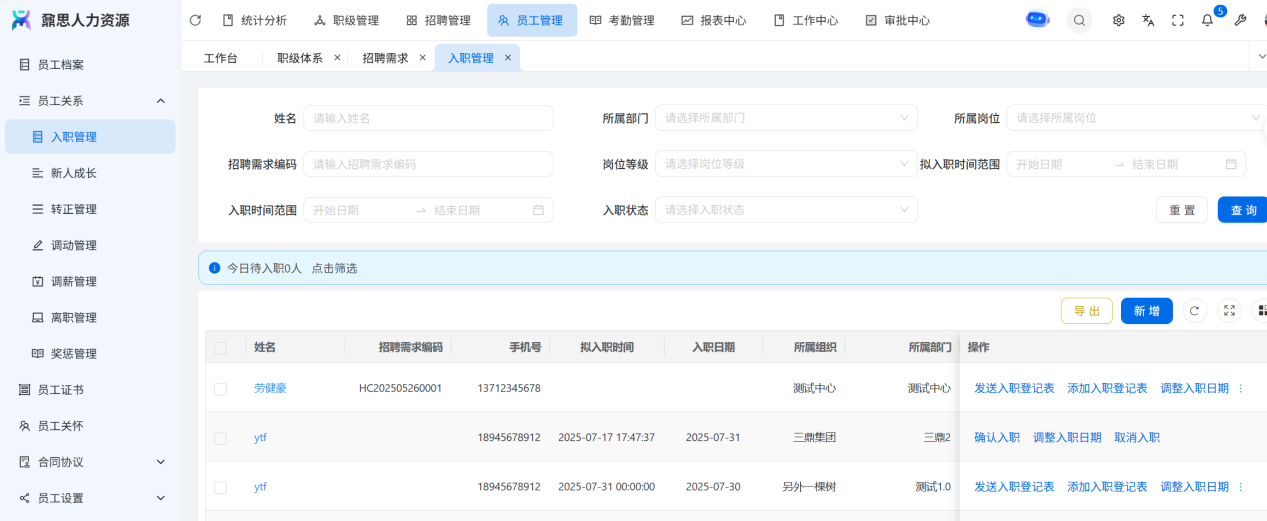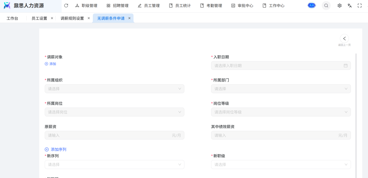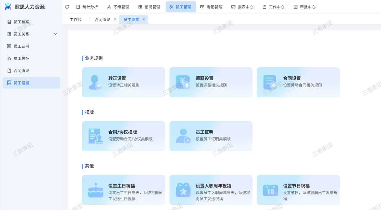 4\.员工管理 员工管理是企业对员工从入职到离职的全生命周期相关事务进行系统化、全面管理的核心模块,涵盖员工档案、入职管理、新人成长、转正管理、调动管理、调薪管理、离职管理、奖惩管理、员工证件管理、员工关怀、合同协议以及员工设置等多个子模块。各子模块之间紧密关联、协同运作,旨在实现员工管理的规范化与信息化,提高管理效率,确保员工信息的准确性和完整性。 4\.1员工档案 员工档案是员工管理的基础,主要功能包括员工基本信息的录入、存储、查询和修改。系统可记录员工的工作信息、个人信息、教育背景、工作经历、家庭成员情况及证件证书等内容,为企业构建全面、准确的员工信息库。这不仅为各项员工管理工作提供重要依据,也便于管理员及时掌握员工的基本情况,为人力资源决策提供有力支持。 在【入职管理】模块完成入职确认操作后,系统将在【员工档案】列表中自动生成对应的员工档案信息。 4\.1\.1新增档案 在新增员工档案数据时,点击“新增”按钮并填写相关档案信息,系统将自动生成对应的员工档案记录。   4\.1\.2查看员工档案 点击员工姓名,进入员工档案详情页面进行查阅。   4\.1\.3开具证明 在员工档案页面,可以为员工开具适用的证明文件。   4\.1\.4办理异常离职 在员工档案页面,有相应权限的用户可点击“办理异常离职”按钮,为员工办理异常离职业务。   4\.2员工关系 4\.2\.1入职管理 【候选人】模块完成确认录用后,系统将在【入职管理】列表中自动生成待入职记录。  4\.2\.1\.1新增入职人员 在新增待入职人员数据时,点击“新增”按钮并填写人员信息后,即可生成对应的待入职记录。   4\.2\.1\.2填写入职登记表 待入职人员需要登记基本信息,可通过以下两种方式完成:①向待入职人员发送入职登记表,由其自行填写;②由有权限的用户直接代为填写,直至完成信息登记。 向待入职人员发送入职登记表。  代为填写入职登记表。  4\.2\.1\.3调整入职日期 可为待入职人员调整入职日期,点击“调整入职日期”按钮并填写相关信息即可完成操作。  4\.2\.1\.4确认入职 点击“确认入职”按钮并填写相关信息,完成填写后,入职状态将从“待入职”变更为“已入职”。   4\.2\.1\.5取消入职 点击“取消入职”按钮并填写取消入职原因,完成填写后,入职状态将从“待入职”变更为“取消入职”。  4\.2\.1\.6指派导师 点击“指派导师”按钮,即可指定导师负责相应业务的跟进工作。   4\.2\.1\.7更换导师 如导师发生变更,可点击“更换导师”按钮进行调整。  4\.2\.2新人成长 【入职管理】模块完成入职确认后,系统将在【新人成长】列表中自动生成新员工的通用成长计划(通用计划在“员工设置\-转正设置\-新人成长”中进行配置)  4\.2\.2\.1新增成长计划 可根据实际情况在通用计划的基础上灵活新增成长计划,点击“新增计划”按钮,选择新员工并填写计划任务信息后,即可生成个性化的成长任务,同时可以通过“复制其他计划”按钮,复制他人的新人计划作为参考。  4\.2\.2\.2填写新人计划信息 根据新人计划内设定的阶段性步骤,逐步填写计划信息,内容包括:新员工填写计划完成情况、导师评价、直属上级评价及人力资源中心建议。   4\.2\.2\.3终止计划 根据实际需求,导师及直属上级有权终止新人计划,计划终止后系统将自动停止后续相关业务流程。  4\.2\.3转正管理 4\.2\.3\.1转正申请 员工试用期即将结束且已完成新人成长计划(若有)时,有权限的用户可通过系统发起员工转正申请,上传相关的转正材料,并根据员工信息及试用期间的表现情况,完善转正信息后提交审批;审核人需登录系统,前往【审批中心】完成转正审批。  4\.2\.3\.2确认转正 转正审批通过后,员工本人(即转正对象)需要点击“确认转正”按钮完成确认,至此转正流程结束。由于转正涉及薪资调整,待员工确认后,【调薪管理】模块将自动生成相应的调薪记录。   4\.2\.3\.3延期转正 若转正审批未通过,有权限的用户可点击“延期转正”按钮,可根据预设的延期时间重新发起转正申请。如未设置延期时间,则默认延期1个月(默认延期时间在“员工设置\-转正设置\-转正申请”中进行配置)   4\.2\.4调动管理 调动管理用于处理因企业业务调整或员工个人原因需变更岗位、部门或工作地点等情况。员工可通过系统提交调动申请,旨在实现人力资源的合理配置,满足企业各岗位的人员需求。 4\.2\.4\.1调动申请 有权限的用户可选择调动对象,完善调动信息后提交审批;审核人需登录系统,前往【审批中心】完成调动审批。    4\.2\.4\.2调动确认 调动审批通过后,员工本人(即调动对象)需完成调动确认操作,至此调动流程结束。若调动涉及薪资调整,经确认后,【调薪管理】模块将同步生成相应的调薪记录。   4\.2\.4\.3历史调动 支持记录历史调动信息,有权限的用户可在系统中新增历史调动信息(无需审批流程)  4\.2\.5调薪管理 调薪管理主要用于处理员工薪资调整相关事务,功能包括调薪申请的提交、调薪信息的记录以及生效时间等;调薪管理列表页整合了其他功能模块中涉及薪资的相关数据,包括【调薪管理】模块中的调薪申请和历史调薪记录、【调动管理】中涉及薪资调整的记录,以及【转正管理】中与调薪相关的记录。 4\.2\.5\.1调薪申请(有调薪规则) 若设置调薪规则,有权限的