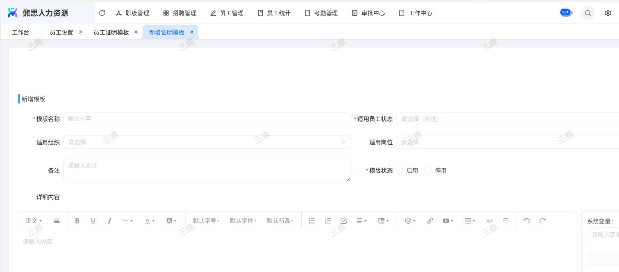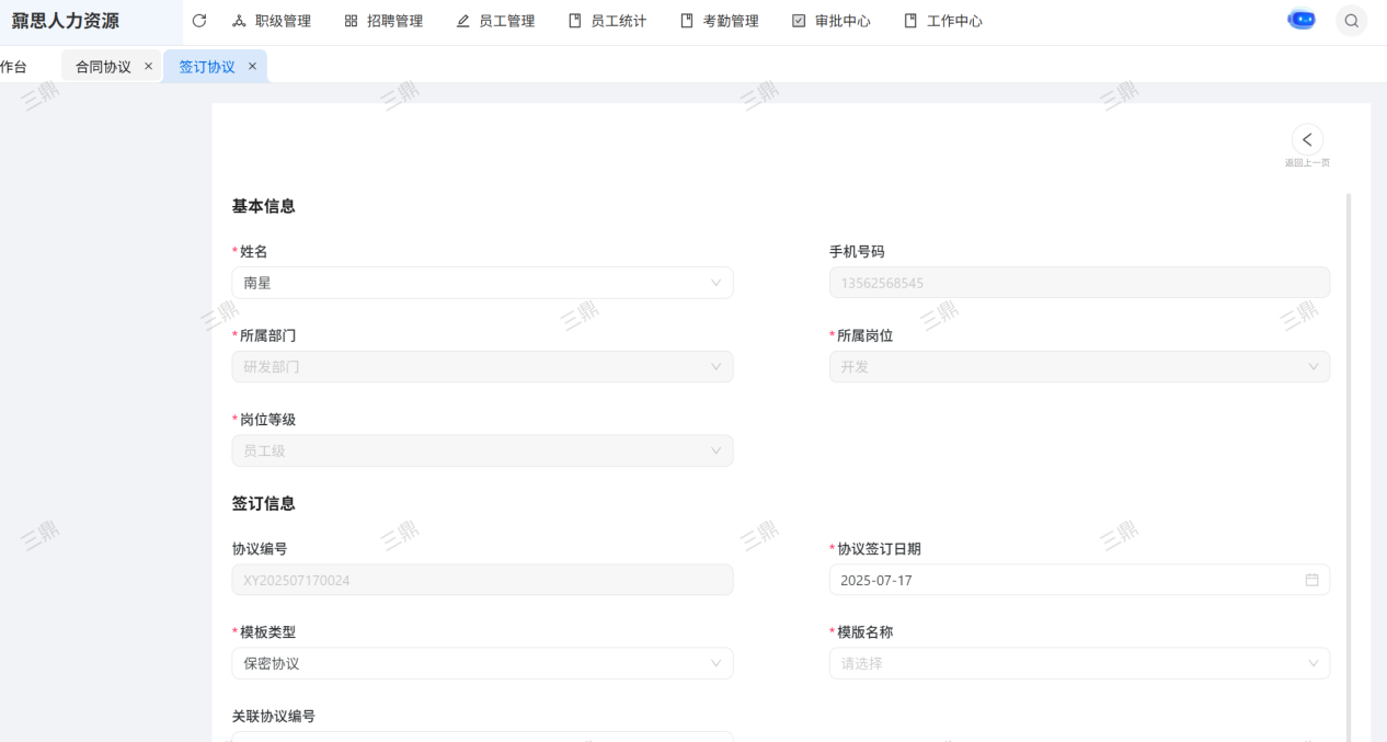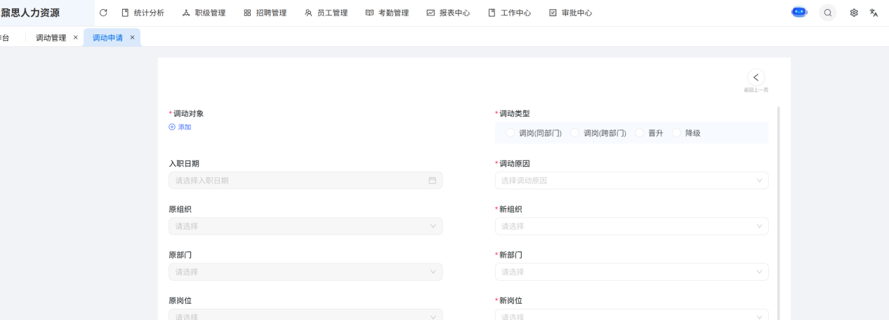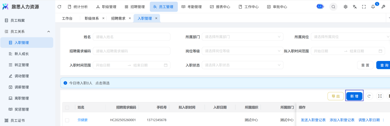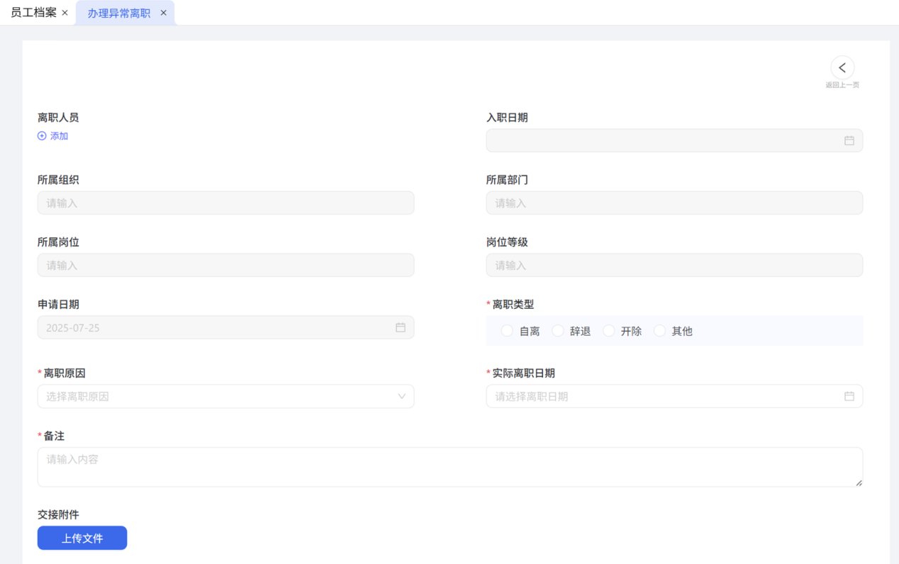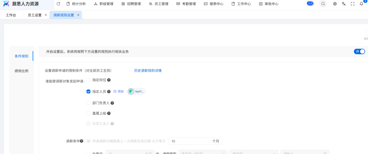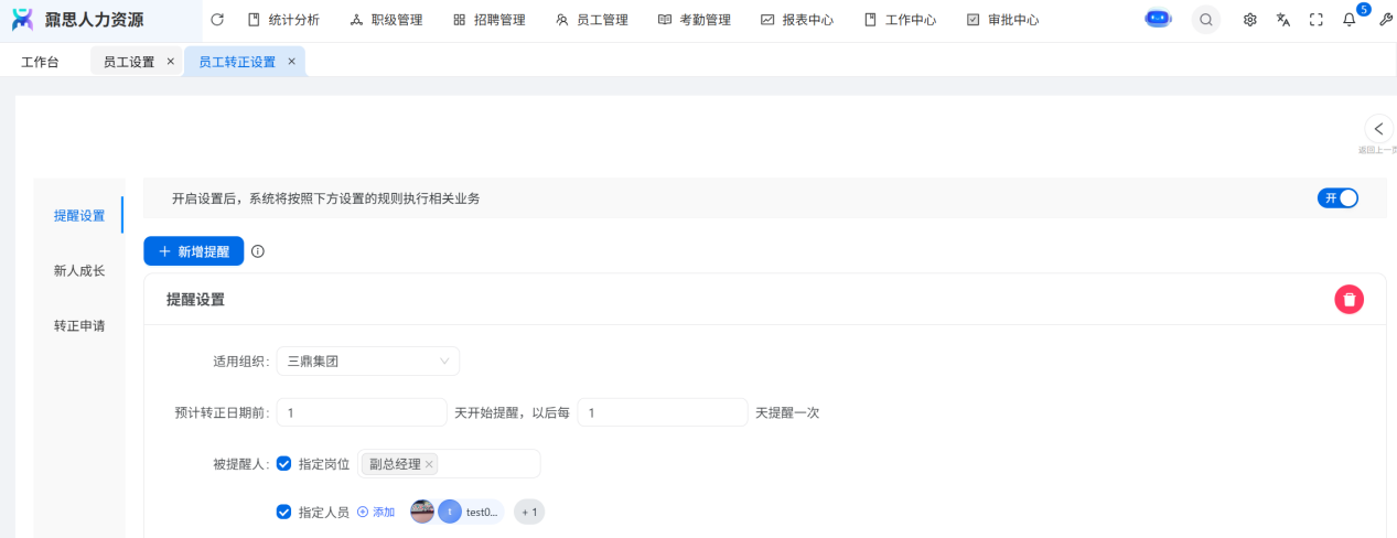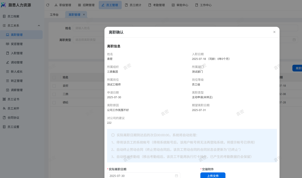 4\.员工管理 员工管理是企业对员工从入职到离职的全生命周期相关事务进行系统化、全面管理的核心模块,涵盖员工档案、入职管理、新人成长、转正管理、调动管理、调薪管理、离职管理、奖惩管理、员工证件管理、员工关怀、合同协议以及员工设置等多个子模块。各子模块之间紧密关联、协同运作,旨在实现员工管理的规范化与信息化,提高管理效率,确保员工信息的准确性和完整性。 4\.1员工档案 员工档案是员工管理的基础,主要功能包括员工基本信息的录入、存储、查询和修改。系统可记录员工的工作信息、个人信息、教育背景、工作经历、家庭成员情况及证件证书等内容,为企业构建全面、准确的员工信息库。这不仅为各项员工管理工作提供重要依据,也便于管理员及时掌握员工的基本情况,为人力资源决策提供有力支持。 在【入职管理】模块完成入职确认操作后,系统将在【员工档案】列表中自动生成对应的员工档案信息。 4\.1\.1新增档案 在新增员工档案数据时,点击“新增”按钮并填写相关档案信息,系统将自动生成对应的员工档案记录。   4\.1\.2查看员工档案 点击员工姓名,进入员工档案详情页面进行查阅。   4\.1\.3开具证明 在员工档案页面,可以为员工开具适用的证明文件。   4\.1\.4办理异常离职 在员工档案页面,有相应权限的用户可点击“办理异常离职”按钮,为员工办理异常离职业务。   4\.2员工关系 4\.2\.1入职管理 【候选人】模块完成确认录用后,系统将在【入职管理】列表中自动生成待入职记录。  4\.2\.1\.1新增入职人员 在新增待入职人员数据时,点击“新增”按钮并填写人员信息后,即可生成对应的待入职记录。   4\.2\.1\.2填写入职登记表 待入职人员需要登记基本信息,可通过以下两种方式完成:①向待入职人员发送入职登记表,由其自行填写;②由有权限的用户直接代为填写,直至完成信息登记。 向待入职人员发送入职登记表。  代为填写入职登记表。  4\.2\.1\.3调整入职日期 可为待入职人员调整入职日期,点击“调整入职日期”按钮并填写相关信息即可完成操作。  4\.2\.1\.4确认入职 点击“确认入职”按钮并填写相关信息,完成填写后,入职状态将从“待入职”变更为“已入职”。   4\.2\.1\.5取消入职 点击“取消入职”按钮并填写取消入职原因,完成填写后,入职状态将从“待入职”变更为“取消入职”。  4\.2\.1\.6指派导师 点击“指派导师”按钮,即可指定导师负责相应业务的跟进工作。   4\.2\.1\.7更换导师 如导师发生变更,可点击“更换导师”按钮进行调整。  4\.2\.2新人成长 【入职管理】模块完成入职确认后,系统将在【新人成长】列表中自动生成新员工的通用成长计划(通用计划在“员工设置\-转正设置\-新人成长”中进行配置)  4\.2\.2\.1新增成长计划 可根据实际情况在通用计划的基础上灵活新增成长计划,点击“新增计划”按钮,选择新员工并填写计划任务信息后,即可生成个性化的成长任务,同时可以通过“复制其他计划”按钮,复制他人的新人计划作为参考。  4\.2\.2\.2填写新人计划信息 根据新人计划内设定的阶段性步骤,逐步填写计划信息,内容包括:新员工填写计划完成情况、导师评价、直属上级评价及人力资源中心建议。   4\.2\.2\.3终止计划 根据实际需求,导师及直属上级有权终止新人计划,计划终止后系统将自动停止后续相关业务流程。  4\.2\.3转正管理 4\.2\.3\.1转正申请 员工试用期即将结束且已完成新人成长计划(若有)时,有权限的用户可通过系统发起员工转正申请,上传相关的转正材料,并根据员工信息及试用期间的表现情况,完善转正信息后提交审批;审核人需登录系统,前往【审批中心】完成转正审批。  4\.2\.3\.2确认转正 转正审批通过后,员工本人(即转正对象)需要点击“确认转正”按钮完成确认,至此转正流程结束。由于转正涉及薪资调整,待员工确认后,【调薪管理】模块将自动生成相应的调薪记录。   4\.2\.3\.3延期转正 若转正审批未通过,有权限的用户可点击“延期转正”按钮,可根据预设的延期时间重新发起转正申请。如未设置延期时间,则默认延期1个月(默认延期时间在“员工设置\-转正设置\-转正申请”中进行配置)   4\.2\.4调动管理 调动管理用于处理因企业业务调整或员工个人原因需变更岗位、部门或工作地点等情况。员工可通过系统提交调动申请,旨在实现人力资源的合理配置,满足企业各岗位的人员需求。 4\.2\.4\.1调动申请 有权限的用户可选择调动对象,完善调动信息后提交审批;审核人需登录系统,前往【审批中心】完成调动审批。    4\.2\.4\.2调动确认 调动审批通过后,员工本人(即调动对象)需完成调动确认操作,至此调动流程结束。若调动涉及薪资调整,经确认后,【调薪管理】模块将同步生成相应的调薪记录。   4\.2\.4\.3历史调动 支持记录历史调动信息,有权限的用户可在系统中新增历史调动信息(无需审批流程)  4\.2\.5调薪管理 调薪管理主要用于处理员工薪资调整相关事务,功能包括调薪申请的提交、调薪信息的记录以及生效时间等;调薪管理列表页整合了其他功能模块中涉及薪资的相关数据,包括【调薪管理】模块中的调薪申请和历史调薪记录、【调动管理】中涉及薪资调整的记录,以及【转正管理】中与调薪相关的记录。 4\.2\.5\.1调薪申请(有调薪规则) 若设置调薪规则,有权限的