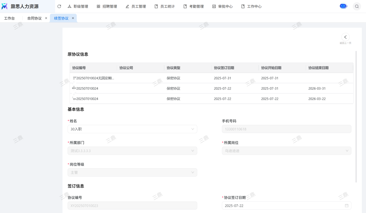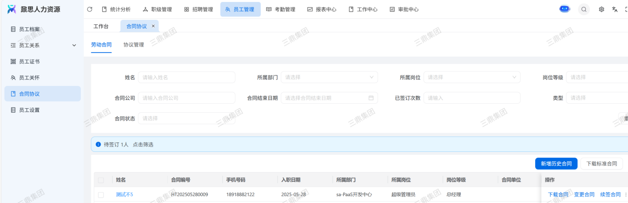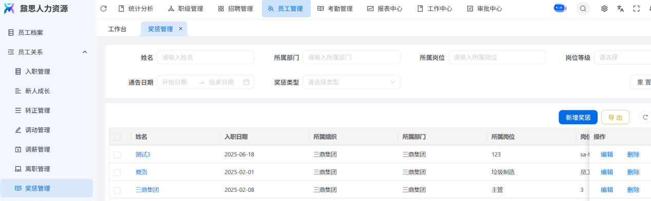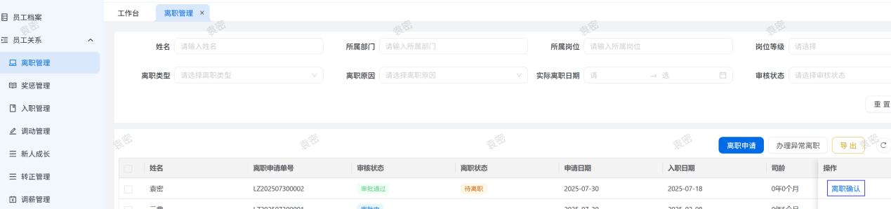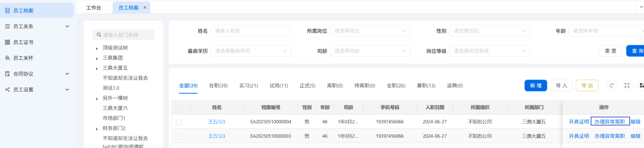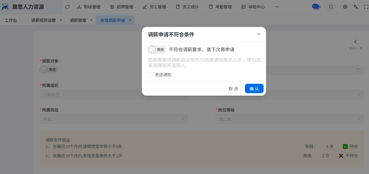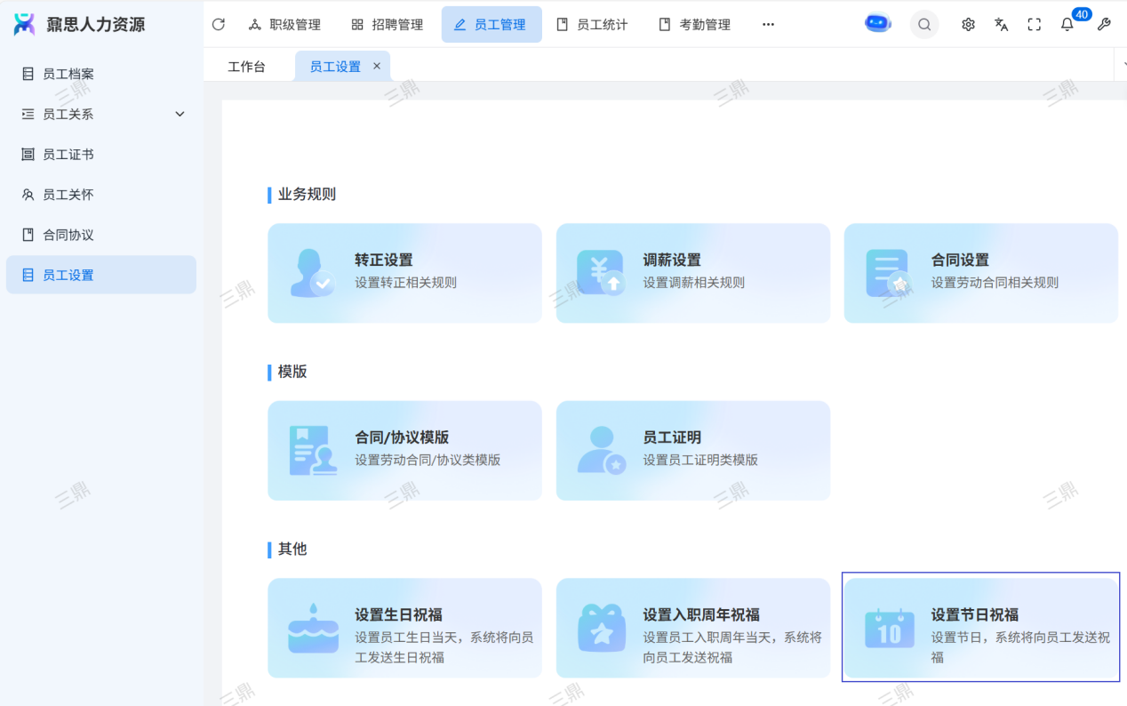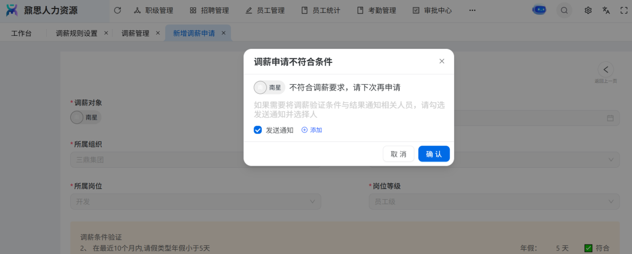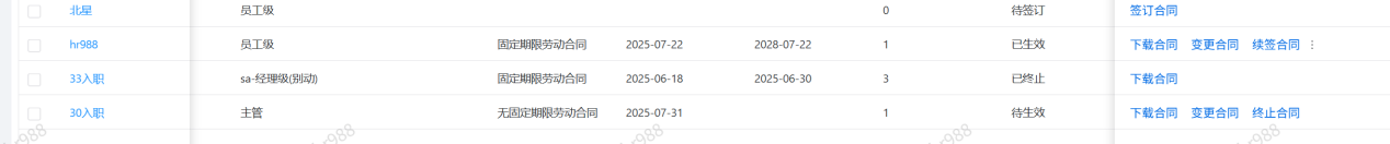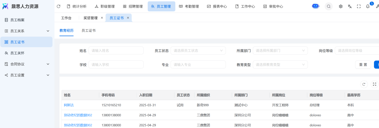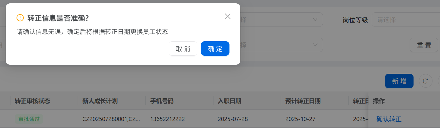 4\.员工管理 员工管理是企业对员工从入职到离职的全生命周期相关事务进行系统化、全面管理的核心模块,涵盖员工档案、入职管理、新人成长、转正管理、调动管理、调薪管理、离职管理、奖惩管理、员工证件管理、员工关怀、合同协议以及员工设置等多个子模块。各子模块之间紧密关联、协同运作,旨在实现员工管理的规范化与信息化,提高管理效率,确保员工信息的准确性和完整性。 4\.1员工档案 员工档案是员工管理的基础,主要功能包括员工基本信息的录入、存储、查询和修改。系统可记录员工的工作信息、个人信息、教育背景、工作经历、家庭成员情况及证件证书等内容,为企业构建全面、准确的员工信息库。这不仅为各项员工管理工作提供重要依据,也便于管理员及时掌握员工的基本情况,为人力资源决策提供有力支持。 在【入职管理】模块完成入职确认操作后,系统将在【员工档案】列表中自动生成对应的员工档案信息。 4\.1\.1新增档案 在新增员工档案数据时,点击“新增”按钮并填写相关档案信息,系统将自动生成对应的员工档案记录。   4\.1\.2查看员工档案 点击员工姓名,进入员工档案详情页面进行查阅。   4\.1\.3开具证明 在员工档案页面,可以为员工开具适用的证明文件。   4\.1\.4办理异常离职 在员工档案页面,有相应权限的用户可点击“办理异常离职”按钮,为员工办理异常离职业务。   4\.2员工关系 4\.2\.1入职管理 【候选人】模块完成确认录用后,系统将在【入职管理】列表中自动生成待入职记录。  4\.2\.1\.1新增入职人员 在新增待入职人员数据时,点击“新增”按钮并填写人员信息后,即可生成对应的待入职记录。   4\.2\.1\.2填写入职登记表 待入职人员需要登记基本信息,可通过以下两种方式完成:①向待入职人员发送入职登记表,由其自行填写;②由有权限的用户直接代为填写,直至完成信息登记。 向待入职人员发送入职登记表。  代为填写入职登记表。  4\.2\.1\.3调整入职日期 可为待入职人员调整入职日期,点击“调整入职日期”按钮并填写相关信息即可完成操作。  4\.2\.1\.4确认入职 点击“确认入职”按钮并填写相关信息,完成填写后,入职状态将从“待入职”变更为“已入职”。   4\.2\.1\.5取消入职 点击“取消入职”按钮并填写取消入职原因,完成填写后,入职状态将从“待入职”变更为“取消入职”。  4\.2\.1\.6指派导师 点击“指派导师”按钮,即可指定导师负责相应业务的跟进工作。   4\.2\.1\.7更换导师 如导师发生变更,可点击“更换导师”按钮进行调整。  4\.2\.2新人成长 【入职管理】模块完成入职确认后,系统将在【新人成长】列表中自动生成新员工的通用成长计划(通用计划在“员工设置\-转正设置\-新人成长”中进行配置)  4\.2\.2\.1新增成长计划 可根据实际情况在通用计划的基础上灵活新增成长计划,点击“新增计划”按钮,选择新员工并填写计划任务信息后,即可生成个性化的成长任务,同时可以通过“复制其他计划”按钮,复制他人的新人计划作为参考。  4\.2\.2\.2填写新人计划信息 根据新人计划内设定的阶段性步骤,逐步填写计划信息,内容包括:新员工填写计划完成情况、导师评价、直属上级评价及人力资源中心建议。   4\.2\.2\.3终止计划 根据实际需求,导师及直属上级有权终止新人计划,计划终止后系统将自动停止后续相关业务流程。  4\.2\.3转正管理 4\.2\.3\.1转正申请 员工试用期即将结束且已完成新人成长计划(若有)时,有权限的用户可通过系统发起员工转正申请,上传相关的转正材料,并根据员工信息及试用期间的表现情况,完善转正信息后提交审批;审核人需登录系统,前往【审批中心】完成转正审批。  4\.2\.3\.2确认转正 转正审批通过后,员工本人(即转正对象)需要点击“确认转正”按钮完成确认,至此转正流程结束。由于转正涉及薪资调整,待员工确认后,【调薪管理】模块将自动生成相应的调薪记录。   4\.2\.3\.3延期转正 若转正审批未通过,有权限的用户可点击“延期转正”按钮,可根据预设的延期时间重新发起转正申请。如未设置延期时间,则默认延期1个月(默认延期时间在“员工设置\-转正设置\-转正申请”中进行配置)   4\.2\.4调动管理 调动管理用于处理因企业业务调整或员工个人原因需变更岗位、部门或工作地点等情况。员工可通过系统提交调动申请,旨在实现人力资源的合理配置,满足企业各岗位的人员需求。 4\.2\.4\.1调动申请 有权限的用户可选择调动对象,完善调动信息后提交审批;审核人需登录系统,前往【审批中心】完成调动审批。    4\.2\.4\.2调动确认 调动审批通过后,员工本人(即调动对象)需完成调动确认操作,至此调动流程结束。若调动涉及薪资调整,经确认后,【调薪管理】模块将同步生成相应的调薪记录。   4\.2\.4\.3历史调动 支持记录历史调动信息,有权限的用户可在系统中新增历史调动信息(无需审批流程)  4\.2\.5调薪管理 调薪管理主要用于处理员工薪资调整相关事务,功能包括调薪申请的提交、调薪信息的记录以及生效时间等;调薪管理列表页整合了其他功能模块中涉及薪资的相关数据,包括【调薪管理】模块中的调薪申请和历史调薪记录、【调动管理】中涉及薪资调整的记录,以及【转正管理】中与调薪相关的记录。 4\.2\.5\.1调薪申请(有调薪规则) 若设置调薪规则,有权限的