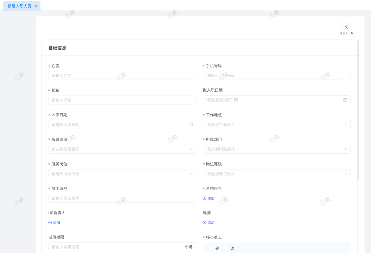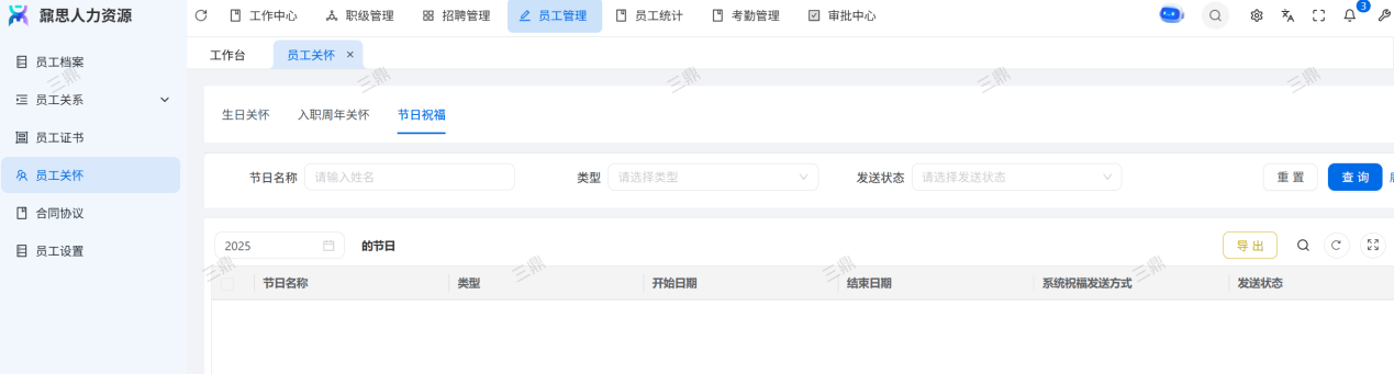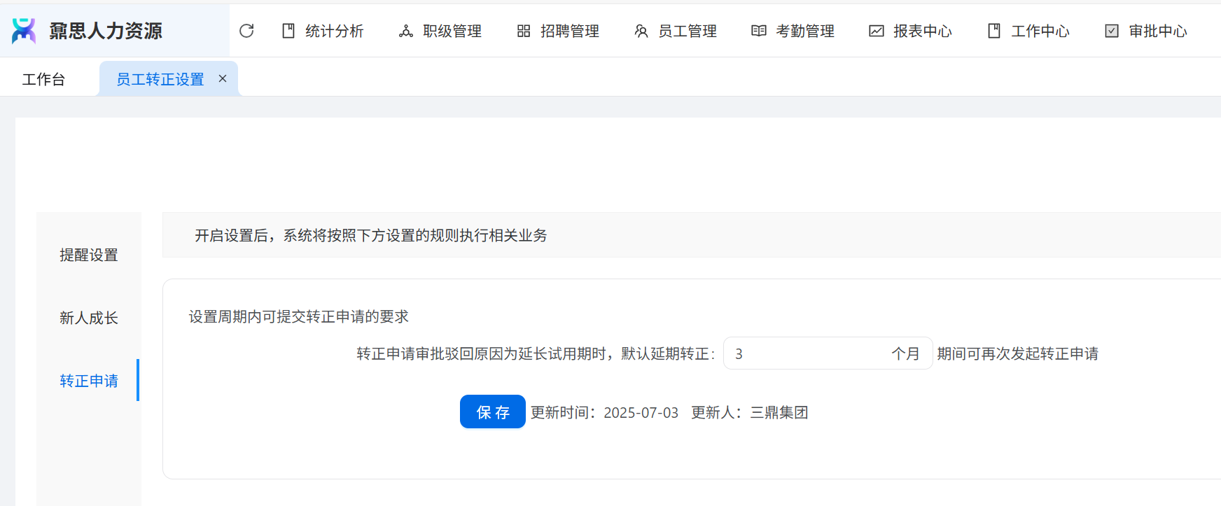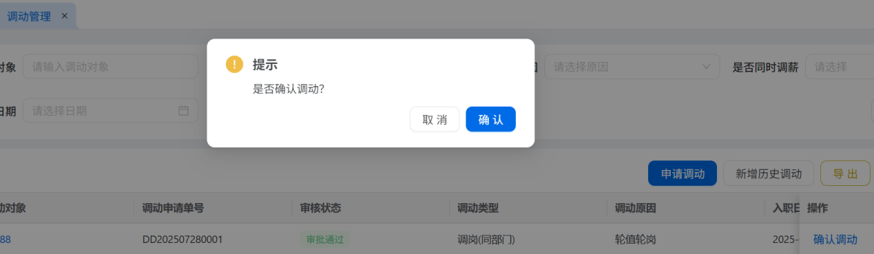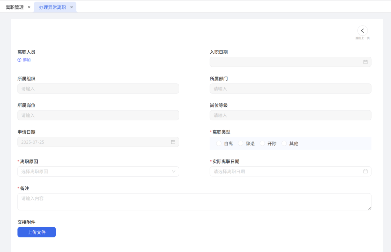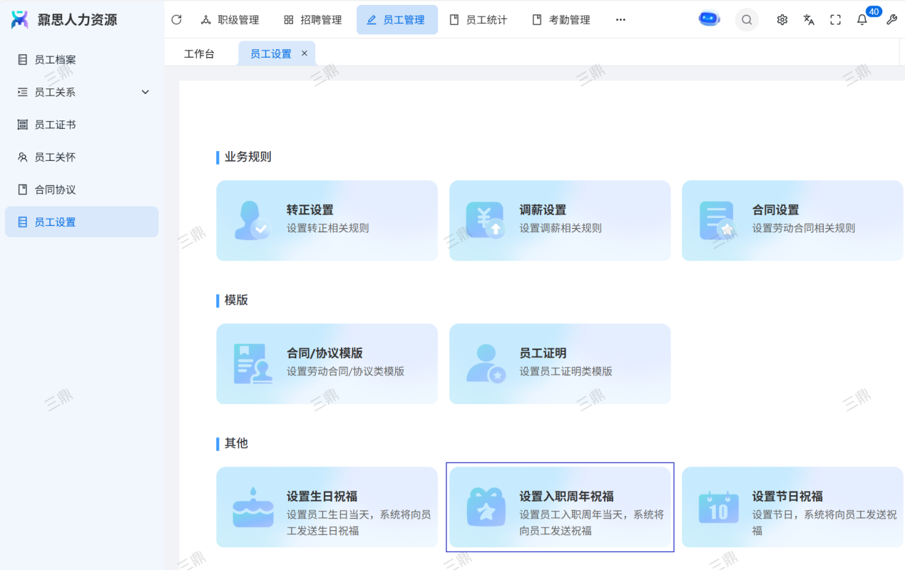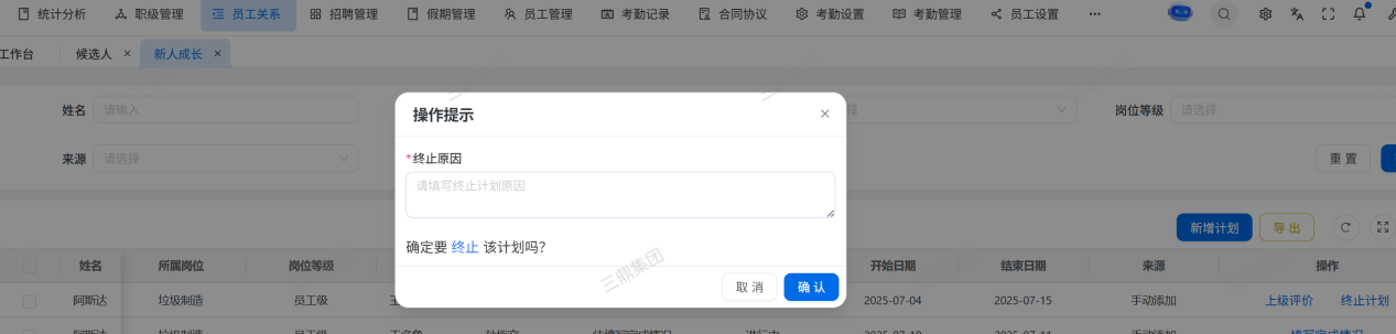 4\.员工管理 员工管理是企业对员工从入职到离职的全生命周期相关事务进行系统化、全面管理的核心模块,涵盖员工档案、入职管理、新人成长、转正管理、调动管理、调薪管理、离职管理、奖惩管理、员工证件管理、员工关怀、合同协议以及员工设置等多个子模块。各子模块之间紧密关联、协同运作,旨在实现员工管理的规范化与信息化,提高管理效率,确保员工信息的准确性和完整性。 4\.1员工档案 员工档案是员工管理的基础,主要功能包括员工基本信息的录入、存储、查询和修改。系统可记录员工的工作信息、个人信息、教育背景、工作经历、家庭成员情况及证件证书等内容,为企业构建全面、准确的员工信息库。这不仅为各项员工管理工作提供重要依据,也便于管理员及时掌握员工的基本情况,为人力资源决策提供有力支持。 在【入职管理】模块完成入职确认操作后,系统将在【员工档案】列表中自动生成对应的员工档案信息。 4\.1\.1新增档案 在新增员工档案数据时,点击“新增”按钮并填写相关档案信息,系统将自动生成对应的员工档案记录。   4\.1\.2查看员工档案 点击员工姓名,进入员工档案详情页面进行查阅。   4\.1\.3开具证明 在员工档案页面,可以为员工开具适用的证明文件。   4\.1\.4办理异常离职 在员工档案页面,有相应权限的用户可点击“办理异常离职”按钮,为员工办理异常离职业务。   4\.2员工关系 4\.2\.1入职管理 【候选人】模块完成确认录用后,系统将在【入职管理】列表中自动生成待入职记录。  4\.2\.1\.1新增入职人员 在新增待入职人员数据时,点击“新增”按钮并填写人员信息后,即可生成对应的待入职记录。   4\.2\.1\.2填写入职登记表 待入职人员需要登记基本信息,可通过以下两种方式完成:①向待入职人员发送入职登记表,由其自行填写;②由有权限的用户直接代为填写,直至完成信息登记。 向待入职人员发送入职登记表。  代为填写入职登记表。  4\.2\.1\.3调整入职日期 可为待入职人员调整入职日期,点击“调整入职日期”按钮并填写相关信息即可完成操作。  4\.2\.1\.4确认入职 点击“确认入职”按钮并填写相关信息,完成填写后,入职状态将从“待入职”变更为“已入职”。   4\.2\.1\.5取消入职 点击“取消入职”按钮并填写取消入职原因,完成填写后,入职状态将从“待入职”变更为“取消入职”。  4\.2\.1\.6指派导师 点击“指派导师”按钮,即可指定导师负责相应业务的跟进工作。   4\.2\.1\.7更换导师 如导师发生变更,可点击“更换导师”按钮进行调整。  4\.2\.2新人成长 【入职管理】模块完成入职确认后,系统将在【新人成长】列表中自动生成新员工的通用成长计划(通用计划在“员工设置\-转正设置\-新人成长”中进行配置)  4\.2\.2\.1新增成长计划 可根据实际情况在通用计划的基础上灵活新增成长计划,点击“新增计划”按钮,选择新员工并填写计划任务信息后,即可生成个性化的成长任务,同时可以通过“复制其他计划”按钮,复制他人的新人计划作为参考。  4\.2\.2\.2填写新人计划信息 根据新人计划内设定的阶段性步骤,逐步填写计划信息,内容包括:新员工填写计划完成情况、导师评价、直属上级评价及人力资源中心建议。   4\.2\.2\.3终止计划 根据实际需求,导师及直属上级有权终止新人计划,计划终止后系统将自动停止后续相关业务流程。  4\.2\.3转正管理 4\.2\.3\.1转正申请 员工试用期即将结束且已完成新人成长计划(若有)时,有权限的用户可通过系统发起员工转正申请,上传相关的转正材料,并根据员工信息及试用期间的表现情况,完善转正信息后提交审批;审核人需登录系统,前往【审批中心】完成转正审批。  4\.2\.3\.2确认转正 转正审批通过后,员工本人(即转正对象)需要点击“确认转正”按钮完成确认,至此转正流程结束。由于转正涉及薪资调整,待员工确认后,【调薪管理】模块将自动生成相应的调薪记录。   4\.2\.3\.3延期转正 若转正审批未通过,有权限的用户可点击“延期转正”按钮,可根据预设的延期时间重新发起转正申请。如未设置延期时间,则默认延期1个月(默认延期时间在“员工设置\-转正设置\-转正申请”中进行配置)   4\.2\.4调动管理 调动管理用于处理因企业业务调整或员工个人原因需变更岗位、部门或工作地点等情况。员工可通过系统提交调动申请,旨在实现人力资源的合理配置,满足企业各岗位的人员需求。 4\.2\.4\.1调动申请 有权限的用户可选择调动对象,完善调动信息后提交审批;审核人需登录系统,前往【审批中心】完成调动审批。    4\.2\.4\.2调动确认 调动审批通过后,员工本人(即调动对象)需完成调动确认操作,至此调动流程结束。若调动涉及薪资调整,经确认后,【调薪管理】模块将同步生成相应的调薪记录。   4\.2\.4\.3历史调动 支持记录历史调动信息,有权限的用户可在系统中新增历史调动信息(无需审批流程)  4\.2\.5调薪管理 调薪管理主要用于处理员工薪资调整相关事务,功能包括调薪申请的提交、调薪信息的记录以及生效时间等;调薪管理列表页整合了其他功能模块中涉及薪资的相关数据,包括【调薪管理】模块中的调薪申请和历史调薪记录、【调动管理】中涉及薪资调整的记录,以及【转正管理】中与调薪相关的记录。 4\.2\.5\.1调薪申请(有调薪规则) 若设置调薪规则,有权限的