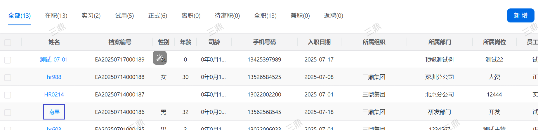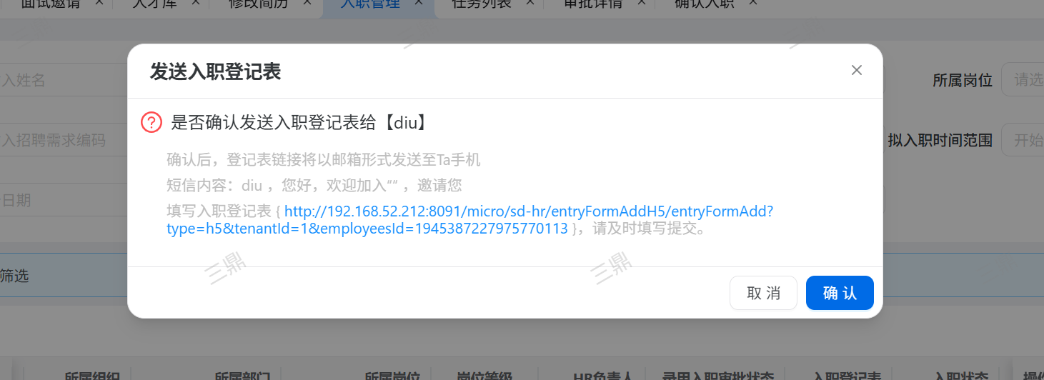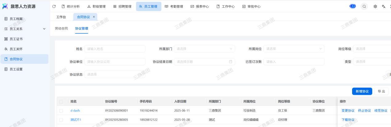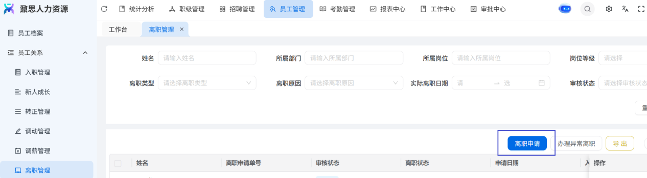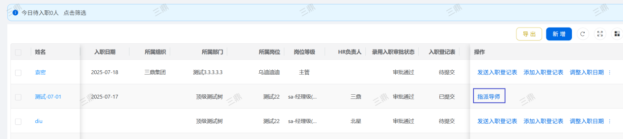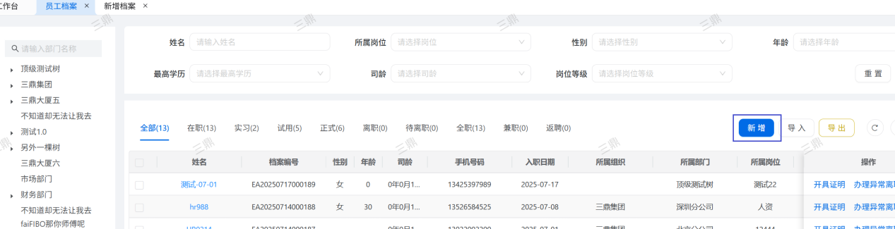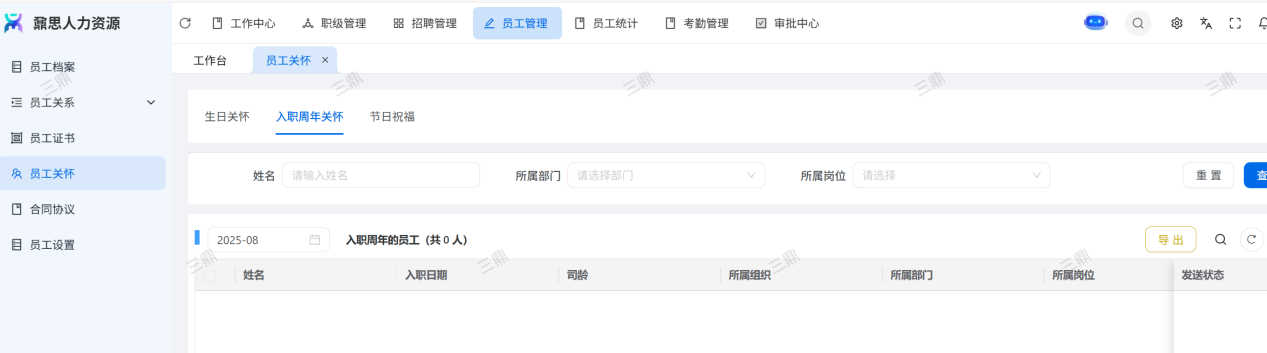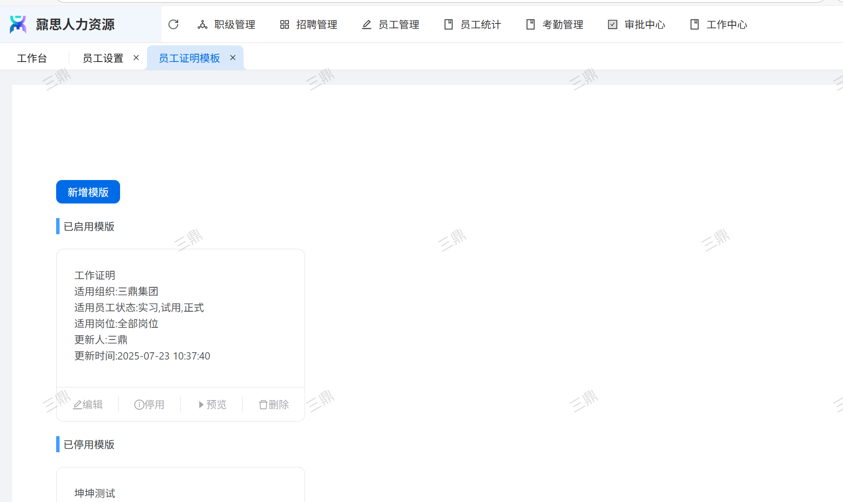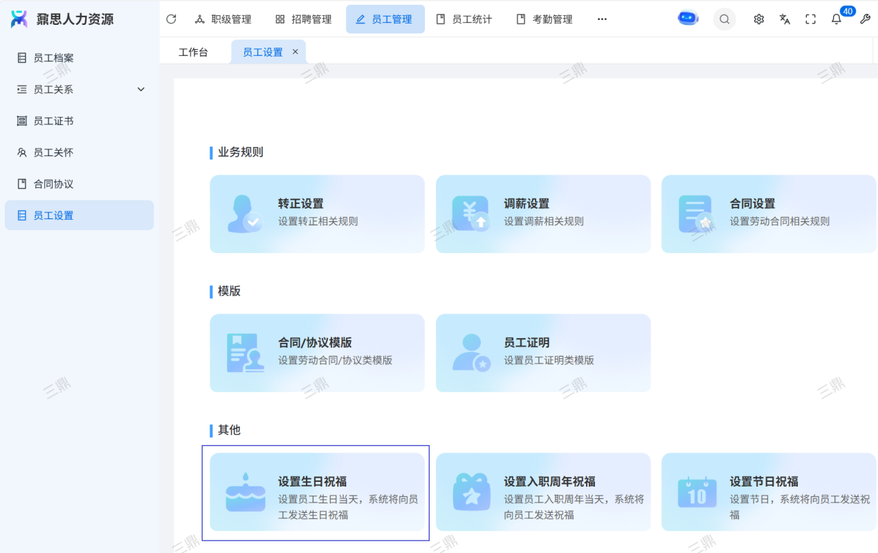 4\.员工管理 员工管理是企业对员工从入职到离职的全生命周期相关事务进行系统化、全面管理的核心模块,涵盖员工档案、入职管理、新人成长、转正管理、调动管理、调薪管理、离职管理、奖惩管理、员工证件管理、员工关怀、合同协议以及员工设置等多个子模块。各子模块之间紧密关联、协同运作,旨在实现员工管理的规范化与信息化,提高管理效率,确保员工信息的准确性和完整性。 4\.1员工档案 员工档案是员工管理的基础,主要功能包括员工基本信息的录入、存储、查询和修改。系统可记录员工的工作信息、个人信息、教育背景、工作经历、家庭成员情况及证件证书等内容,为企业构建全面、准确的员工信息库。这不仅为各项员工管理工作提供重要依据,也便于管理员及时掌握员工的基本情况,为人力资源决策提供有力支持。 在【入职管理】模块完成入职确认操作后,系统将在【员工档案】列表中自动生成对应的员工档案信息。 4\.1\.1新增档案 在新增员工档案数据时,点击“新增”按钮并填写相关档案信息,系统将自动生成对应的员工档案记录。   4\.1\.2查看员工档案 点击员工姓名,进入员工档案详情页面进行查阅。   4\.1\.3开具证明 在员工档案页面,可以为员工开具适用的证明文件。   4\.1\.4办理异常离职 在员工档案页面,有相应权限的用户可点击“办理异常离职”按钮,为员工办理异常离职业务。   4\.2员工关系 4\.2\.1入职管理 【候选人】模块完成确认录用后,系统将在【入职管理】列表中自动生成待入职记录。  4\.2\.1\.1新增入职人员 在新增待入职人员数据时,点击“新增”按钮并填写人员信息后,即可生成对应的待入职记录。   4\.2\.1\.2填写入职登记表 待入职人员需要登记基本信息,可通过以下两种方式完成:①向待入职人员发送入职登记表,由其自行填写;②由有权限的用户直接代为填写,直至完成信息登记。 向待入职人员发送入职登记表。  代为填写入职登记表。  4\.2\.1\.3调整入职日期 可为待入职人员调整入职日期,点击“调整入职日期”按钮并填写相关信息即可完成操作。  4\.2\.1\.4确认入职 点击“确认入职”按钮并填写相关信息,完成填写后,入职状态将从“待入职”变更为“已入职”。   4\.2\.1\.5取消入职 点击“取消入职”按钮并填写取消入职原因,完成填写后,入职状态将从“待入职”变更为“取消入职”。  4\.2\.1\.6指派导师 点击“指派导师”按钮,即可指定导师负责相应业务的跟进工作。   4\.2\.1\.7更换导师 如导师发生变更,可点击“更换导师”按钮进行调整。  4\.2\.2新人成长 【入职管理】模块完成入职确认后,系统将在【新人成长】列表中自动生成新员工的通用成长计划(通用计划在“员工设置\-转正设置\-新人成长”中进行配置)  4\.2\.2\.1新增成长计划 可根据实际情况在通用计划的基础上灵活新增成长计划,点击“新增计划”按钮,选择新员工并填写计划任务信息后,即可生成个性化的成长任务,同时可以通过“复制其他计划”按钮,复制他人的新人计划作为参考。  4\.2\.2\.2填写新人计划信息 根据新人计划内设定的阶段性步骤,逐步填写计划信息,内容包括:新员工填写计划完成情况、导师评价、直属上级评价及人力资源中心建议。   4\.2\.2\.3终止计划 根据实际需求,导师及直属上级有权终止新人计划,计划终止后系统将自动停止后续相关业务流程。  4\.2\.3转正管理 4\.2\.3\.1转正申请 员工试用期即将结束且已完成新人成长计划(若有)时,有权限的用户可通过系统发起员工转正申请,上传相关的转正材料,并根据员工信息及试用期间的表现情况,完善转正信息后提交审批;审核人需登录系统,前往【审批中心】完成转正审批。  4\.2\.3\.2确认转正 转正审批通过后,员工本人(即转正对象)需要点击“确认转正”按钮完成确认,至此转正流程结束。由于转正涉及薪资调整,待员工确认后,【调薪管理】模块将自动生成相应的调薪记录。   4\.2\.3\.3延期转正 若转正审批未通过,有权限的用户可点击“延期转正”按钮,可根据预设的延期时间重新发起转正申请。如未设置延期时间,则默认延期1个月(默认延期时间在“员工设置\-转正设置\-转正申请”中进行配置)   4\.2\.4调动管理 调动管理用于处理因企业业务调整或员工个人原因需变更岗位、部门或工作地点等情况。员工可通过系统提交调动申请,旨在实现人力资源的合理配置,满足企业各岗位的人员需求。 4\.2\.4\.1调动申请 有权限的用户可选择调动对象,完善调动信息后提交审批;审核人需登录系统,前往【审批中心】完成调动审批。    4\.2\.4\.2调动确认 调动审批通过后,员工本人(即调动对象)需完成调动确认操作,至此调动流程结束。若调动涉及薪资调整,经确认后,【调薪管理】模块将同步生成相应的调薪记录。   4\.2\.4\.3历史调动 支持记录历史调动信息,有权限的用户可在系统中新增历史调动信息(无需审批流程)  4\.2\.5调薪管理 调薪管理主要用于处理员工薪资调整相关事务,功能包括调薪申请的提交、调薪信息的记录以及生效时间等;调薪管理列表页整合了其他功能模块中涉及薪资的相关数据,包括【调薪管理】模块中的调薪申请和历史调薪记录、【调动管理】中涉及薪资调整的记录,以及【转正管理】中与调薪相关的记录。 4\.2\.5\.1调薪申请(有调薪规则) 若设置调薪规则,有权限的