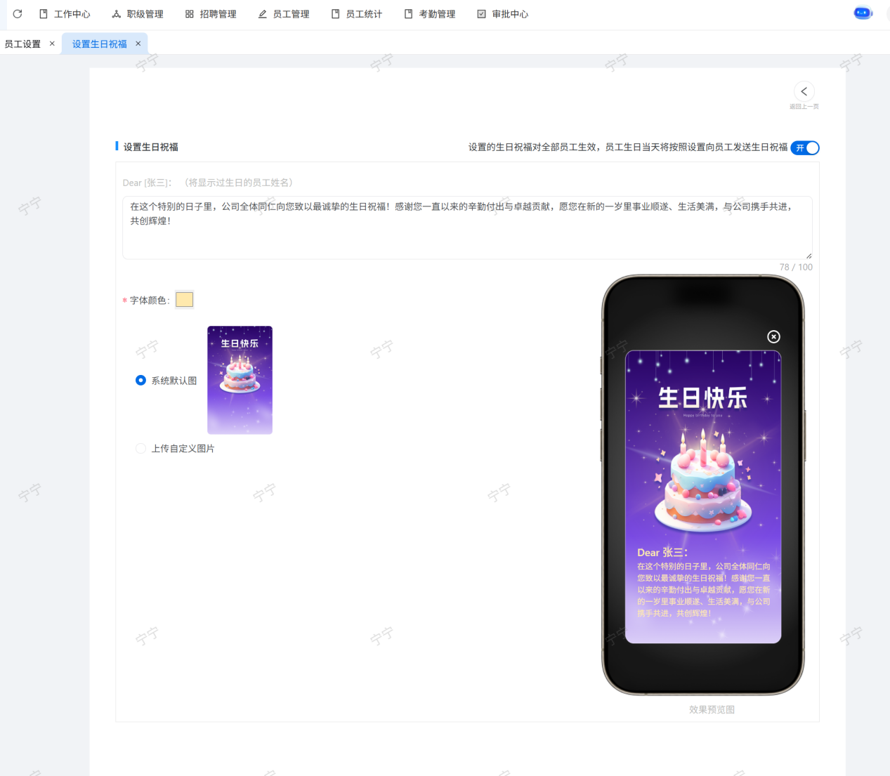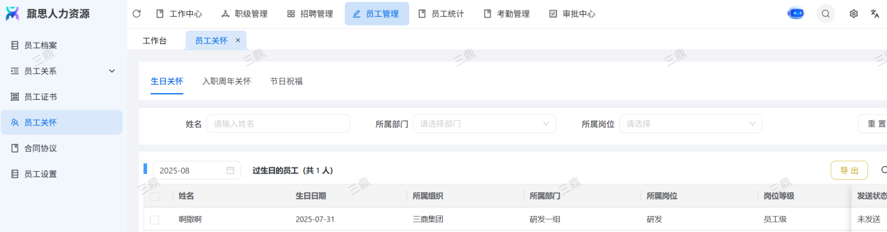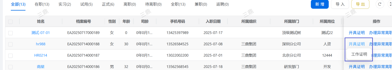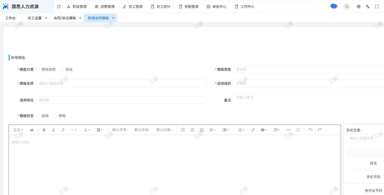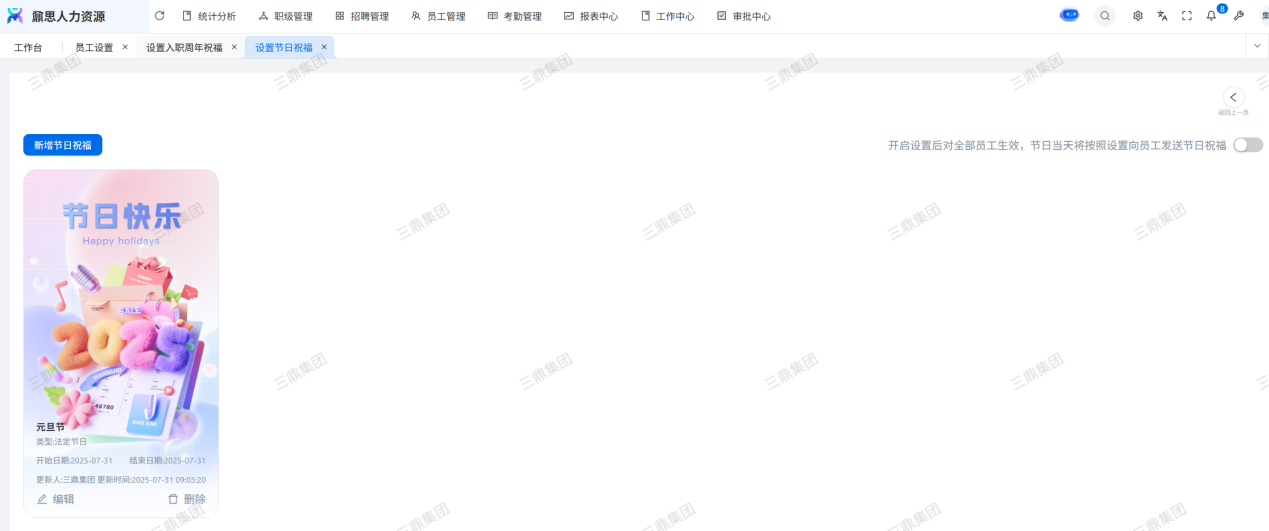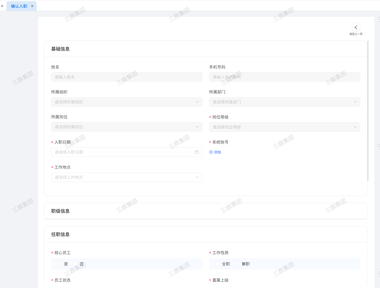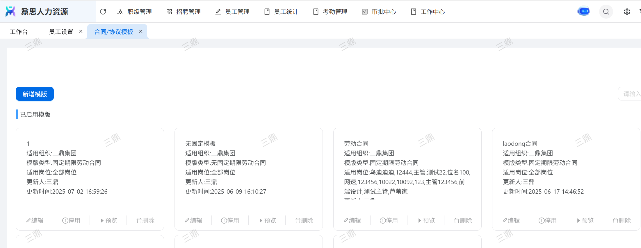 4\.员工管理 员工管理是企业对员工从入职到离职的全生命周期相关事务进行系统化、全面管理的核心模块,涵盖员工档案、入职管理、新人成长、转正管理、调动管理、调薪管理、离职管理、奖惩管理、员工证件管理、员工关怀、合同协议以及员工设置等多个子模块。各子模块之间紧密关联、协同运作,旨在实现员工管理的规范化与信息化,提高管理效率,确保员工信息的准确性和完整性。 4\.1员工档案 员工档案是员工管理的基础,主要功能包括员工基本信息的录入、存储、查询和修改。系统可记录员工的工作信息、个人信息、教育背景、工作经历、家庭成员情况及证件证书等内容,为企业构建全面、准确的员工信息库。这不仅为各项员工管理工作提供重要依据,也便于管理员及时掌握员工的基本情况,为人力资源决策提供有力支持。 在【入职管理】模块完成入职确认操作后,系统将在【员工档案】列表中自动生成对应的员工档案信息。 4\.1\.1新增档案 在新增员工档案数据时,点击“新增”按钮并填写相关档案信息,系统将自动生成对应的员工档案记录。   4\.1\.2查看员工档案 点击员工姓名,进入员工档案详情页面进行查阅。   4\.1\.3开具证明 在员工档案页面,可以为员工开具适用的证明文件。   4\.1\.4办理异常离职 在员工档案页面,有相应权限的用户可点击“办理异常离职”按钮,为员工办理异常离职业务。   4\.2员工关系 4\.2\.1入职管理 【候选人】模块完成确认录用后,系统将在【入职管理】列表中自动生成待入职记录。  4\.2\.1\.1新增入职人员 在新增待入职人员数据时,点击“新增”按钮并填写人员信息后,即可生成对应的待入职记录。   4\.2\.1\.2填写入职登记表 待入职人员需要登记基本信息,可通过以下两种方式完成:①向待入职人员发送入职登记表,由其自行填写;②由有权限的用户直接代为填写,直至完成信息登记。 向待入职人员发送入职登记表。  代为填写入职登记表。  4\.2\.1\.3调整入职日期 可为待入职人员调整入职日期,点击“调整入职日期”按钮并填写相关信息即可完成操作。  4\.2\.1\.4确认入职 点击“确认入职”按钮并填写相关信息,完成填写后,入职状态将从“待入职”变更为“已入职”。   4\.2\.1\.5取消入职 点击“取消入职”按钮并填写取消入职原因,完成填写后,入职状态将从“待入职”变更为“取消入职”。  4\.2\.1\.6指派导师 点击“指派导师”按钮,即可指定导师负责相应业务的跟进工作。   4\.2\.1\.7更换导师 如导师发生变更,可点击“更换导师”按钮进行调整。  4\.2\.2新人成长 【入职管理】模块完成入职确认后,系统将在【新人成长】列表中自动生成新员工的通用成长计划(通用计划在“员工设置\-转正设置\-新人成长”中进行配置)  4\.2\.2\.1新增成长计划 可根据实际情况在通用计划的基础上灵活新增成长计划,点击“新增计划”按钮,选择新员工并填写计划任务信息后,即可生成个性化的成长任务,同时可以通过“复制其他计划”按钮,复制他人的新人计划作为参考。  4\.2\.2\.2填写新人计划信息 根据新人计划内设定的阶段性步骤,逐步填写计划信息,内容包括:新员工填写计划完成情况、导师评价、直属上级评价及人力资源中心建议。   4\.2\.2\.3终止计划 根据实际需求,导师及直属上级有权终止新人计划,计划终止后系统将自动停止后续相关业务流程。  4\.2\.3转正管理 4\.2\.3\.1转正申请 员工试用期即将结束且已完成新人成长计划(若有)时,有权限的用户可通过系统发起员工转正申请,上传相关的转正材料,并根据员工信息及试用期间的表现情况,完善转正信息后提交审批;审核人需登录系统,前往【审批中心】完成转正审批。  4\.2\.3\.2确认转正 转正审批通过后,员工本人(即转正对象)需要点击“确认转正”按钮完成确认,至此转正流程结束。由于转正涉及薪资调整,待员工确认后,【调薪管理】模块将自动生成相应的调薪记录。   4\.2\.3\.3延期转正 若转正审批未通过,有权限的用户可点击“延期转正”按钮,可根据预设的延期时间重新发起转正申请。如未设置延期时间,则默认延期1个月(默认延期时间在“员工设置\-转正设置\-转正申请”中进行配置)   4\.2\.4调动管理 调动管理用于处理因企业业务调整或员工个人原因需变更岗位、部门或工作地点等情况。员工可通过系统提交调动申请,旨在实现人力资源的合理配置,满足企业各岗位的人员需求。 4\.2\.4\.1调动申请 有权限的用户可选择调动对象,完善调动信息后提交审批;审核人需登录系统,前往【审批中心】完成调动审批。    4\.2\.4\.2调动确认 调动审批通过后,员工本人(即调动对象)需完成调动确认操作,至此调动流程结束。若调动涉及薪资调整,经确认后,【调薪管理】模块将同步生成相应的调薪记录。   4\.2\.4\.3历史调动 支持记录历史调动信息,有权限的用户可在系统中新增历史调动信息(无需审批流程)  4\.2\.5调薪管理 调薪管理主要用于处理员工薪资调整相关事务,功能包括调薪申请的提交、调薪信息的记录以及生效时间等;调薪管理列表页整合了其他功能模块中涉及薪资的相关数据,包括【调薪管理】模块中的调薪申请和历史调薪记录、【调动管理】中涉及薪资调整的记录,以及【转正管理】中与调薪相关的记录。 4\.2\.5\.1调薪申请(有调薪规则) 若设置调薪规则,有权限的