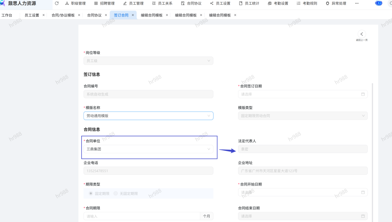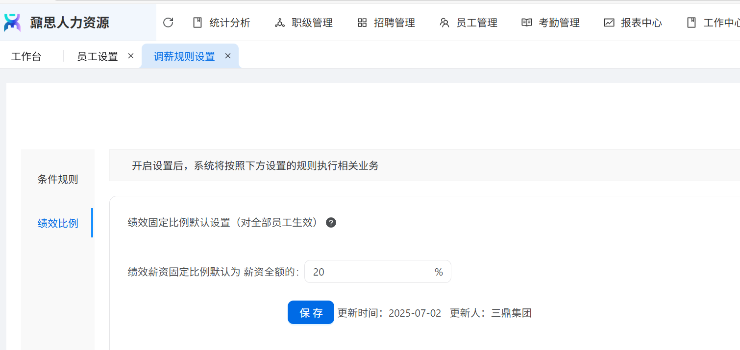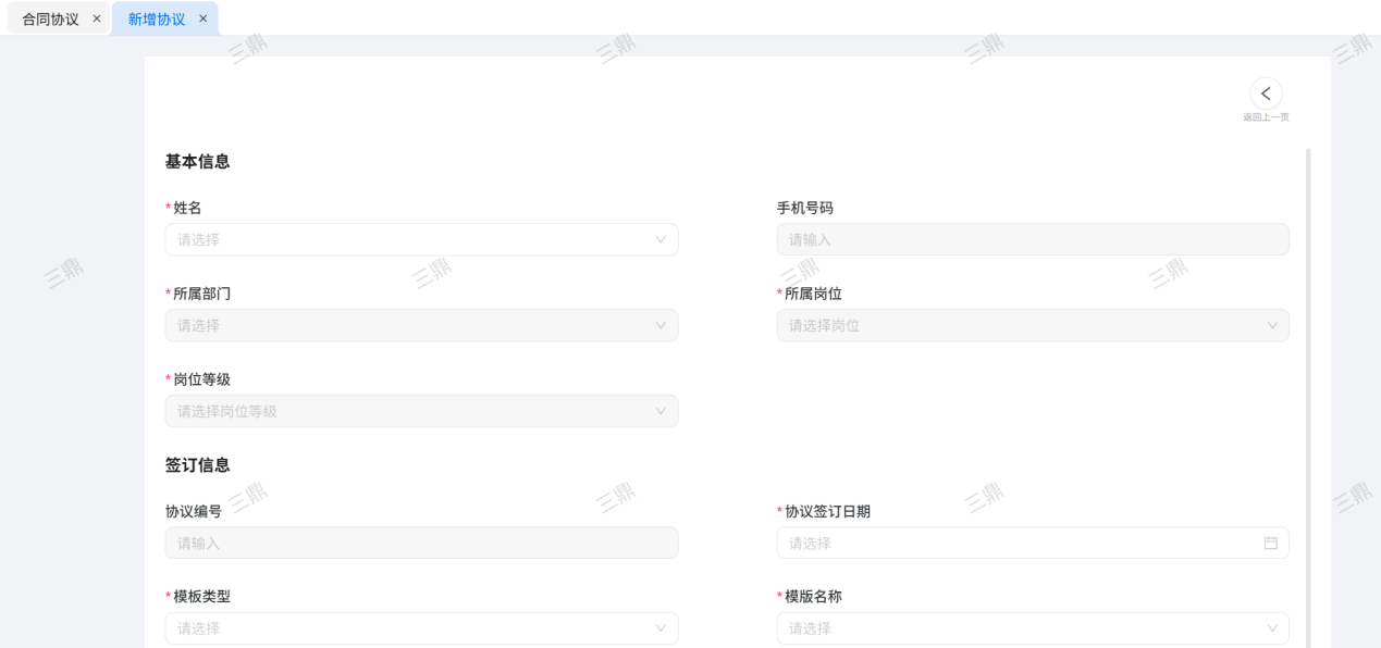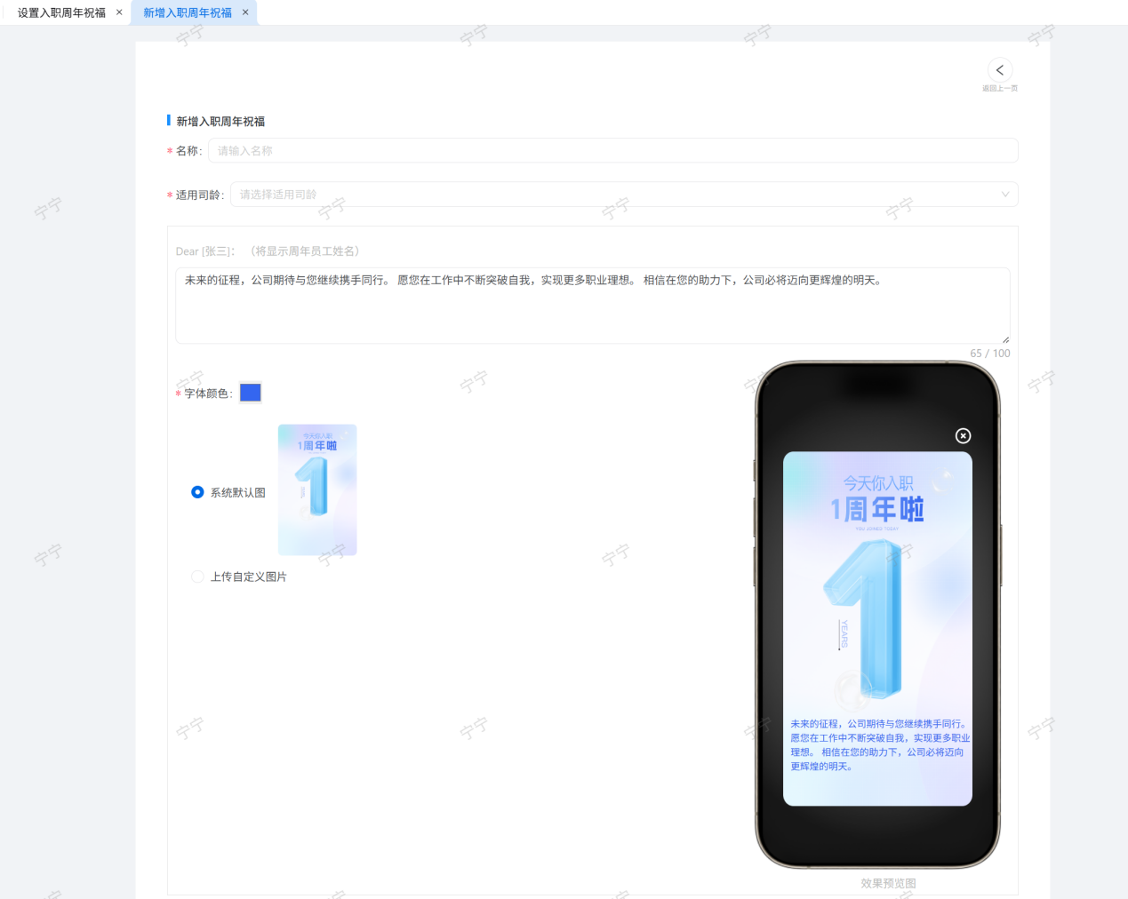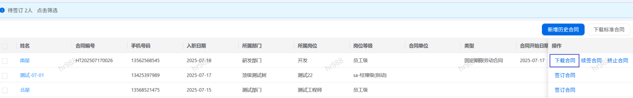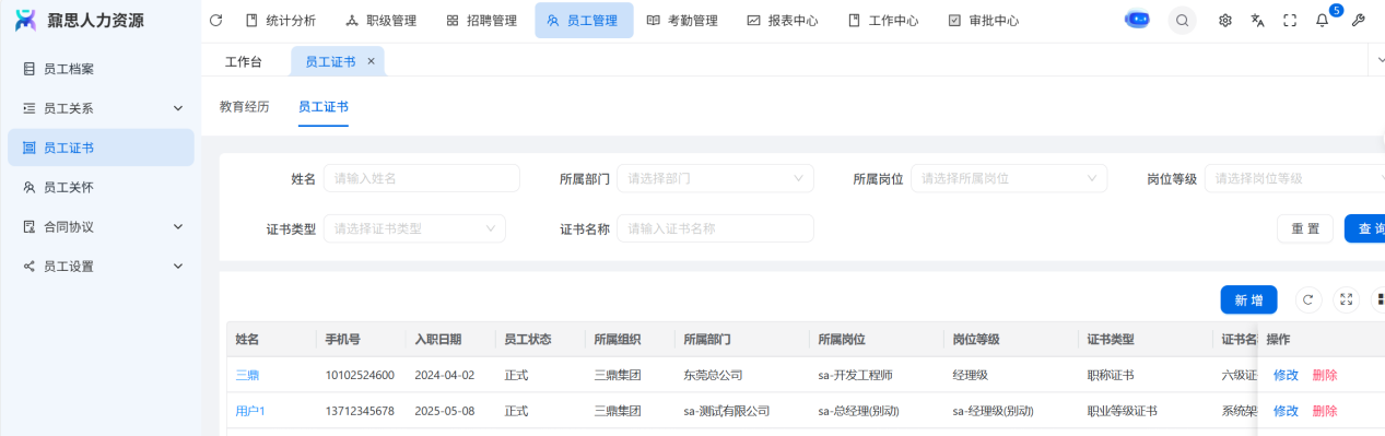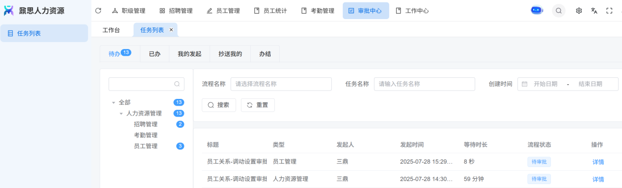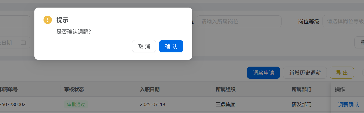 4\.员工管理 员工管理是企业对员工从入职到离职的全生命周期相关事务进行系统化、全面管理的核心模块,涵盖员工档案、入职管理、新人成长、转正管理、调动管理、调薪管理、离职管理、奖惩管理、员工证件管理、员工关怀、合同协议以及员工设置等多个子模块。各子模块之间紧密关联、协同运作,旨在实现员工管理的规范化与信息化,提高管理效率,确保员工信息的准确性和完整性。 4\.1员工档案 员工档案是员工管理的基础,主要功能包括员工基本信息的录入、存储、查询和修改。系统可记录员工的工作信息、个人信息、教育背景、工作经历、家庭成员情况及证件证书等内容,为企业构建全面、准确的员工信息库。这不仅为各项员工管理工作提供重要依据,也便于管理员及时掌握员工的基本情况,为人力资源决策提供有力支持。 在【入职管理】模块完成入职确认操作后,系统将在【员工档案】列表中自动生成对应的员工档案信息。 4\.1\.1新增档案 在新增员工档案数据时,点击“新增”按钮并填写相关档案信息,系统将自动生成对应的员工档案记录。   4\.1\.2查看员工档案 点击员工姓名,进入员工档案详情页面进行查阅。   4\.1\.3开具证明 在员工档案页面,可以为员工开具适用的证明文件。   4\.1\.4办理异常离职 在员工档案页面,有相应权限的用户可点击“办理异常离职”按钮,为员工办理异常离职业务。   4\.2员工关系 4\.2\.1入职管理 【候选人】模块完成确认录用后,系统将在【入职管理】列表中自动生成待入职记录。  4\.2\.1\.1新增入职人员 在新增待入职人员数据时,点击“新增”按钮并填写人员信息后,即可生成对应的待入职记录。   4\.2\.1\.2填写入职登记表 待入职人员需要登记基本信息,可通过以下两种方式完成:①向待入职人员发送入职登记表,由其自行填写;②由有权限的用户直接代为填写,直至完成信息登记。 向待入职人员发送入职登记表。  代为填写入职登记表。  4\.2\.1\.3调整入职日期 可为待入职人员调整入职日期,点击“调整入职日期”按钮并填写相关信息即可完成操作。  4\.2\.1\.4确认入职 点击“确认入职”按钮并填写相关信息,完成填写后,入职状态将从“待入职”变更为“已入职”。   4\.2\.1\.5取消入职 点击“取消入职”按钮并填写取消入职原因,完成填写后,入职状态将从“待入职”变更为“取消入职”。  4\.2\.1\.6指派导师 点击“指派导师”按钮,即可指定导师负责相应业务的跟进工作。   4\.2\.1\.7更换导师 如导师发生变更,可点击“更换导师”按钮进行调整。  4\.2\.2新人成长 【入职管理】模块完成入职确认后,系统将在【新人成长】列表中自动生成新员工的通用成长计划(通用计划在“员工设置\-转正设置\-新人成长”中进行配置)  4\.2\.2\.1新增成长计划 可根据实际情况在通用计划的基础上灵活新增成长计划,点击“新增计划”按钮,选择新员工并填写计划任务信息后,即可生成个性化的成长任务,同时可以通过“复制其他计划”按钮,复制他人的新人计划作为参考。  4\.2\.2\.2填写新人计划信息 根据新人计划内设定的阶段性步骤,逐步填写计划信息,内容包括:新员工填写计划完成情况、导师评价、直属上级评价及人力资源中心建议。   4\.2\.2\.3终止计划 根据实际需求,导师及直属上级有权终止新人计划,计划终止后系统将自动停止后续相关业务流程。  4\.2\.3转正管理 4\.2\.3\.1转正申请 员工试用期即将结束且已完成新人成长计划(若有)时,有权限的用户可通过系统发起员工转正申请,上传相关的转正材料,并根据员工信息及试用期间的表现情况,完善转正信息后提交审批;审核人需登录系统,前往【审批中心】完成转正审批。  4\.2\.3\.2确认转正 转正审批通过后,员工本人(即转正对象)需要点击“确认转正”按钮完成确认,至此转正流程结束。由于转正涉及薪资调整,待员工确认后,【调薪管理】模块将自动生成相应的调薪记录。   4\.2\.3\.3延期转正 若转正审批未通过,有权限的用户可点击“延期转正”按钮,可根据预设的延期时间重新发起转正申请。如未设置延期时间,则默认延期1个月(默认延期时间在“员工设置\-转正设置\-转正申请”中进行配置)   4\.2\.4调动管理 调动管理用于处理因企业业务调整或员工个人原因需变更岗位、部门或工作地点等情况。员工可通过系统提交调动申请,旨在实现人力资源的合理配置,满足企业各岗位的人员需求。 4\.2\.4\.1调动申请 有权限的用户可选择调动对象,完善调动信息后提交审批;审核人需登录系统,前往【审批中心】完成调动审批。    4\.2\.4\.2调动确认 调动审批通过后,员工本人(即调动对象)需完成调动确认操作,至此调动流程结束。若调动涉及薪资调整,经确认后,【调薪管理】模块将同步生成相应的调薪记录。   4\.2\.4\.3历史调动 支持记录历史调动信息,有权限的用户可在系统中新增历史调动信息(无需审批流程)  4\.2\.5调薪管理 调薪管理主要用于处理员工薪资调整相关事务,功能包括调薪申请的提交、调薪信息的记录以及生效时间等;调薪管理列表页整合了其他功能模块中涉及薪资的相关数据,包括【调薪管理】模块中的调薪申请和历史调薪记录、【调动管理】中涉及薪资调整的记录,以及【转正管理】中与调薪相关的记录。 4\.2\.5\.1调薪申请(有调薪规则) 若设置调薪规则,有权限的