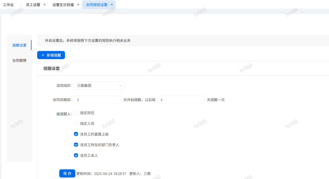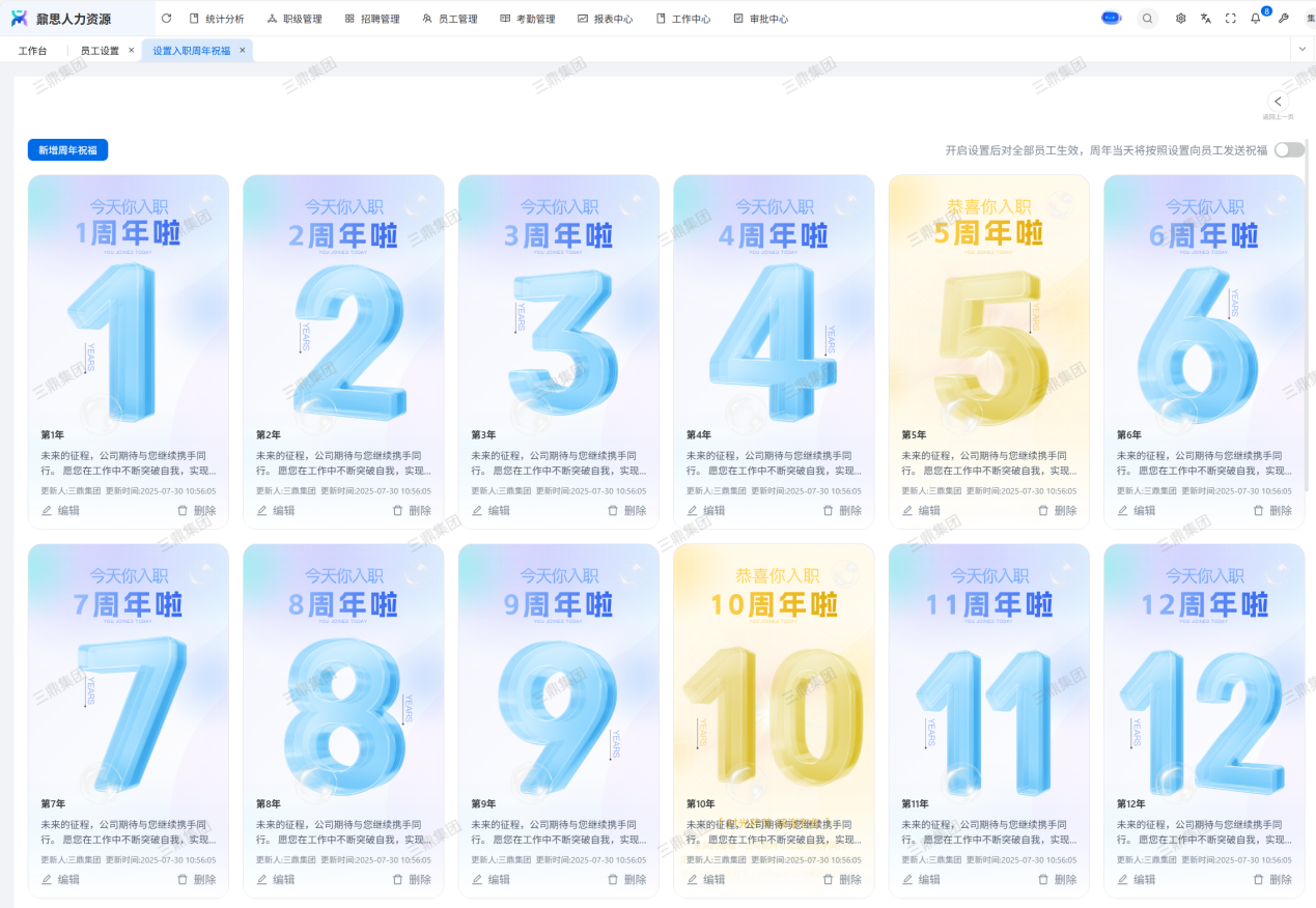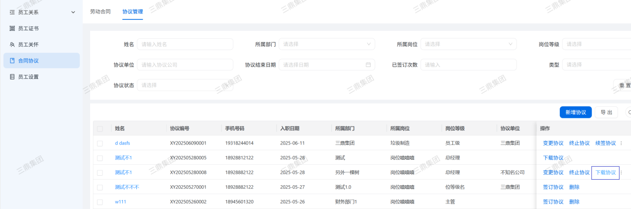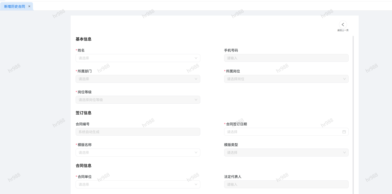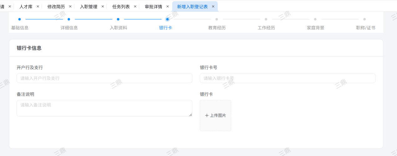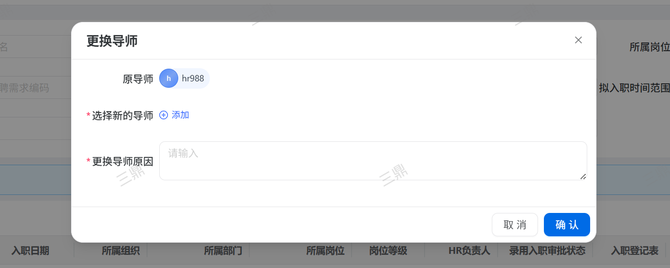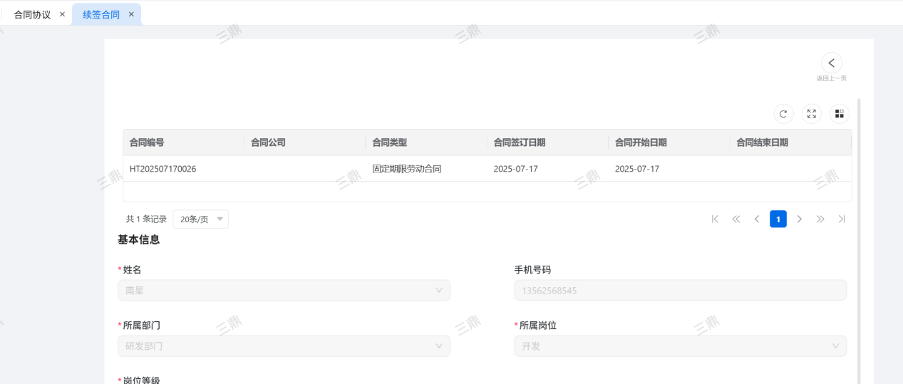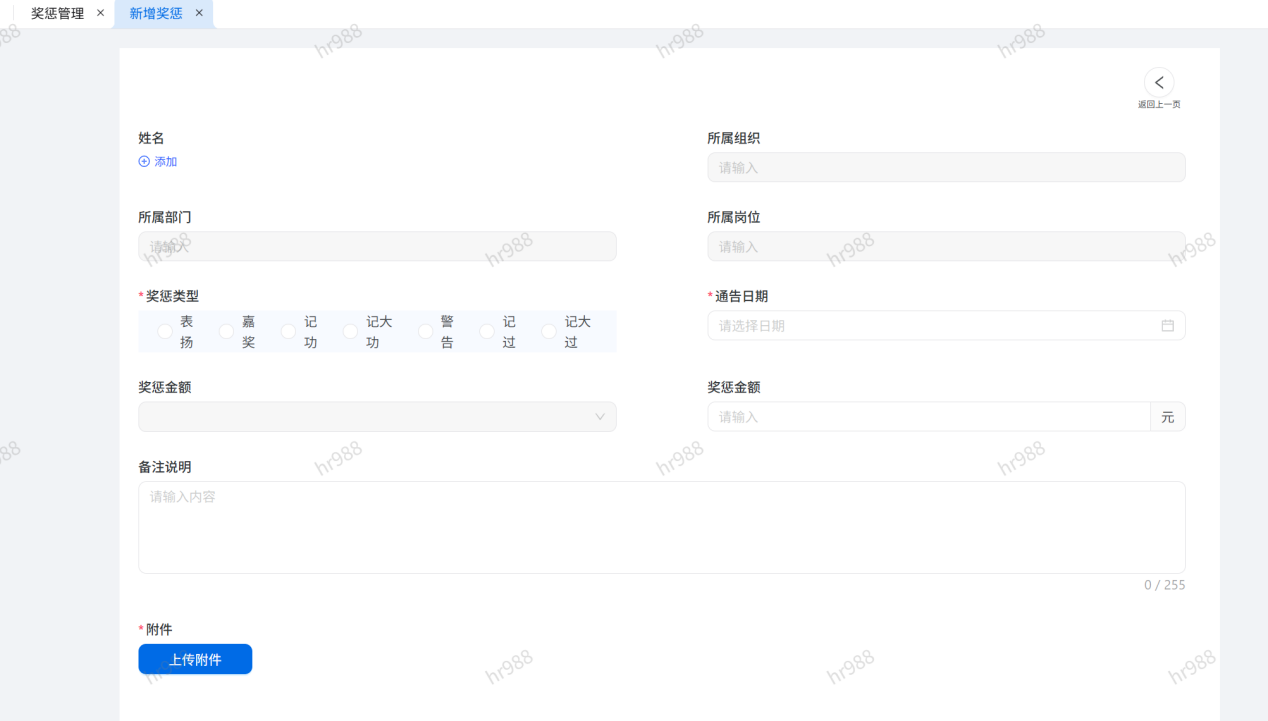 4\.员工管理 员工管理是企业对员工从入职到离职的全生命周期相关事务进行系统化、全面管理的核心模块,涵盖员工档案、入职管理、新人成长、转正管理、调动管理、调薪管理、离职管理、奖惩管理、员工证件管理、员工关怀、合同协议以及员工设置等多个子模块。各子模块之间紧密关联、协同运作,旨在实现员工管理的规范化与信息化,提高管理效率,确保员工信息的准确性和完整性。 4\.1员工档案 员工档案是员工管理的基础,主要功能包括员工基本信息的录入、存储、查询和修改。系统可记录员工的工作信息、个人信息、教育背景、工作经历、家庭成员情况及证件证书等内容,为企业构建全面、准确的员工信息库。这不仅为各项员工管理工作提供重要依据,也便于管理员及时掌握员工的基本情况,为人力资源决策提供有力支持。 在【入职管理】模块完成入职确认操作后,系统将在【员工档案】列表中自动生成对应的员工档案信息。 4\.1\.1新增档案 在新增员工档案数据时,点击“新增”按钮并填写相关档案信息,系统将自动生成对应的员工档案记录。   4\.1\.2查看员工档案 点击员工姓名,进入员工档案详情页面进行查阅。   4\.1\.3开具证明 在员工档案页面,可以为员工开具适用的证明文件。   4\.1\.4办理异常离职 在员工档案页面,有相应权限的用户可点击“办理异常离职”按钮,为员工办理异常离职业务。   4\.2员工关系 4\.2\.1入职管理 【候选人】模块完成确认录用后,系统将在【入职管理】列表中自动生成待入职记录。  4\.2\.1\.1新增入职人员 在新增待入职人员数据时,点击“新增”按钮并填写人员信息后,即可生成对应的待入职记录。   4\.2\.1\.2填写入职登记表 待入职人员需要登记基本信息,可通过以下两种方式完成:①向待入职人员发送入职登记表,由其自行填写;②由有权限的用户直接代为填写,直至完成信息登记。 向待入职人员发送入职登记表。  代为填写入职登记表。  4\.2\.1\.3调整入职日期 可为待入职人员调整入职日期,点击“调整入职日期”按钮并填写相关信息即可完成操作。  4\.2\.1\.4确认入职 点击“确认入职”按钮并填写相关信息,完成填写后,入职状态将从“待入职”变更为“已入职”。   4\.2\.1\.5取消入职 点击“取消入职”按钮并填写取消入职原因,完成填写后,入职状态将从“待入职”变更为“取消入职”。  4\.2\.1\.6指派导师 点击“指派导师”按钮,即可指定导师负责相应业务的跟进工作。   4\.2\.1\.7更换导师 如导师发生变更,可点击“更换导师”按钮进行调整。  4\.2\.2新人成长 【入职管理】模块完成入职确认后,系统将在【新人成长】列表中自动生成新员工的通用成长计划(通用计划在“员工设置\-转正设置\-新人成长”中进行配置)  4\.2\.2\.1新增成长计划 可根据实际情况在通用计划的基础上灵活新增成长计划,点击“新增计划”按钮,选择新员工并填写计划任务信息后,即可生成个性化的成长任务,同时可以通过“复制其他计划”按钮,复制他人的新人计划作为参考。  4\.2\.2\.2填写新人计划信息 根据新人计划内设定的阶段性步骤,逐步填写计划信息,内容包括:新员工填写计划完成情况、导师评价、直属上级评价及人力资源中心建议。   4\.2\.2\.3终止计划 根据实际需求,导师及直属上级有权终止新人计划,计划终止后系统将自动停止后续相关业务流程。  4\.2\.3转正管理 4\.2\.3\.1转正申请 员工试用期即将结束且已完成新人成长计划(若有)时,有权限的用户可通过系统发起员工转正申请,上传相关的转正材料,并根据员工信息及试用期间的表现情况,完善转正信息后提交审批;审核人需登录系统,前往【审批中心】完成转正审批。  4\.2\.3\.2确认转正 转正审批通过后,员工本人(即转正对象)需要点击“确认转正”按钮完成确认,至此转正流程结束。由于转正涉及薪资调整,待员工确认后,【调薪管理】模块将自动生成相应的调薪记录。   4\.2\.3\.3延期转正 若转正审批未通过,有权限的用户可点击“延期转正”按钮,可根据预设的延期时间重新发起转正申请。如未设置延期时间,则默认延期1个月(默认延期时间在“员工设置\-转正设置\-转正申请”中进行配置)   4\.2\.4调动管理 调动管理用于处理因企业业务调整或员工个人原因需变更岗位、部门或工作地点等情况。员工可通过系统提交调动申请,旨在实现人力资源的合理配置,满足企业各岗位的人员需求。 4\.2\.4\.1调动申请 有权限的用户可选择调动对象,完善调动信息后提交审批;审核人需登录系统,前往【审批中心】完成调动审批。    4\.2\.4\.2调动确认 调动审批通过后,员工本人(即调动对象)需完成调动确认操作,至此调动流程结束。若调动涉及薪资调整,经确认后,【调薪管理】模块将同步生成相应的调薪记录。   4\.2\.4\.3历史调动 支持记录历史调动信息,有权限的用户可在系统中新增历史调动信息(无需审批流程)  4\.2\.5调薪管理 调薪管理主要用于处理员工薪资调整相关事务,功能包括调薪申请的提交、调薪信息的记录以及生效时间等;调薪管理列表页整合了其他功能模块中涉及薪资的相关数据,包括【调薪管理】模块中的调薪申请和历史调薪记录、【调动管理】中涉及薪资调整的记录,以及【转正管理】中与调薪相关的记录。 4\.2\.5\.1调薪申请(有调薪规则) 若设置调薪规则,有权限的
