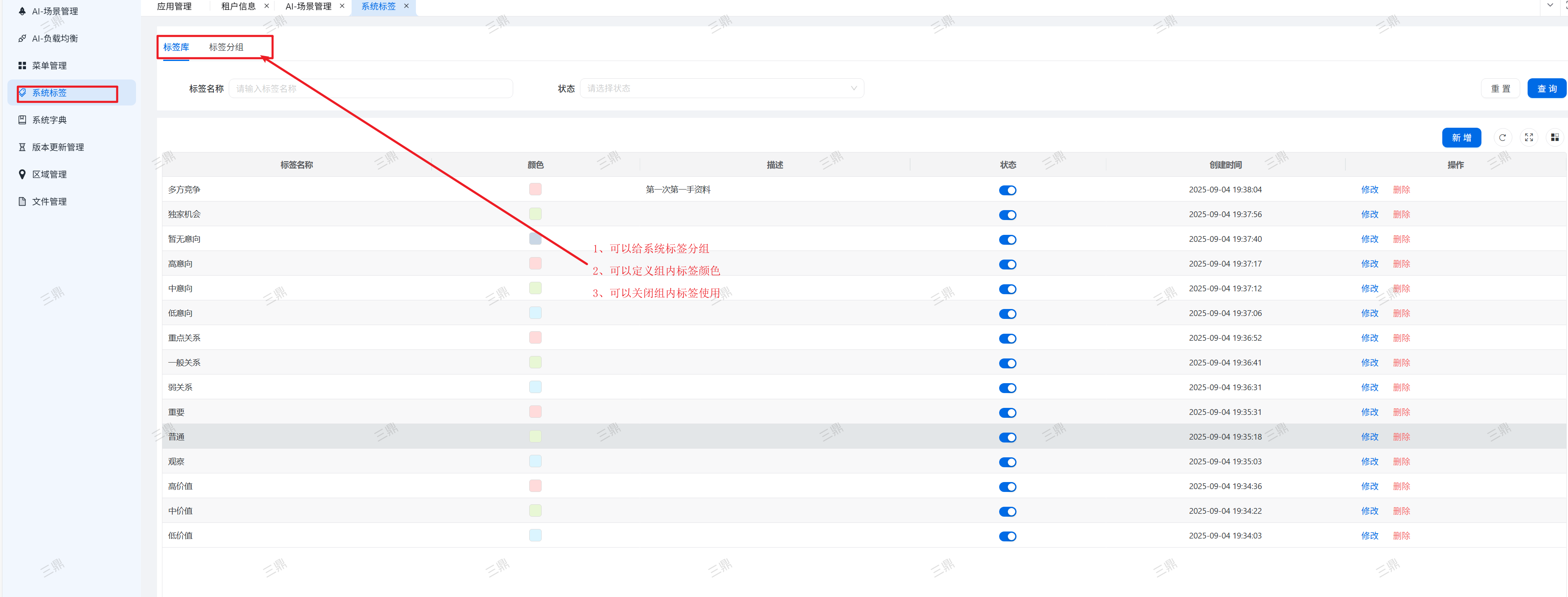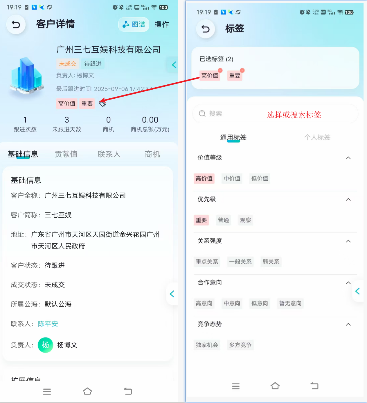 ## 功能背景 企业在管人、管事、管业务时,需要对不同对象进行快速归类和标记。然而,统一的标签库虽然保证了规范,但无法满足个别业务人员的 **个性化使用需求**。比如销售员想标记“重点拜访客户”,而这个标签对其他人可能并无意义,因此需要 **既有统一规范,又能灵活自定义** 的标签体系。 ## 目标用户 **企业管理者**:使用系统内置标签进行宏观管理和分析,快速做决策。 **销售/市场人员**:需要在客户跟进中快速识别客户属性,方便精准营销。 **人力与后勤管理人员**:在人员或供应商管理中,通过标签实现统一识别和分类。 **渠道/代理商管理人员**:需要快速区分不同级别、不同合作状态的代理商。 ## 使用场景 **销售场景**:在客户A身上打上“潜在高价值客户(系统内置标签)”,同时销售人员自己加上“需重点跟进(个人标签)”,只有本人可见。 **采购场景**:统一标签标记“核心供应商”,同时采购员自己加上“谈判难度高”标签。 **代理商场景**:统一标签“金牌代理”,个人标签“熟人介绍”,方便自己后续单独跟进 ## 市场痛点 标签体系僵化,不能兼顾企业统一与个人灵活。 个性化信息只能写在笔记或Excel中,无法在系统内沉淀。 缺乏 **权限控制**,容易导致标签泛滥、管理混乱。 ## 解决市场核心问题 **系统内置标签**:统一规范,保障企业内部数据标准化。 **多对象全覆盖**:客户、商机、联系人、供应商、代理商均支持。 **AI自动打标**:通过行为与数据特征智能生成标签,减少人工操作。 **统一管理 + 灵活扩展**:管理员可维护企业级标签库,避免重复和混乱。 **自定义专属标签**:用户可根据实际情况建立 **仅自己可见的私人标签**,高度灵活,不影响他人。 **标签权限隔离**:区分企业级标签和个人专属标签,既保证全局一致性,又兼顾个性化使用。 **高效筛选与分析**:统一标签用于全局统计与分析,个人标签则辅助个体业务管理,形成双层次价值。 ## 实例图 后台配置:  用户贴标签: