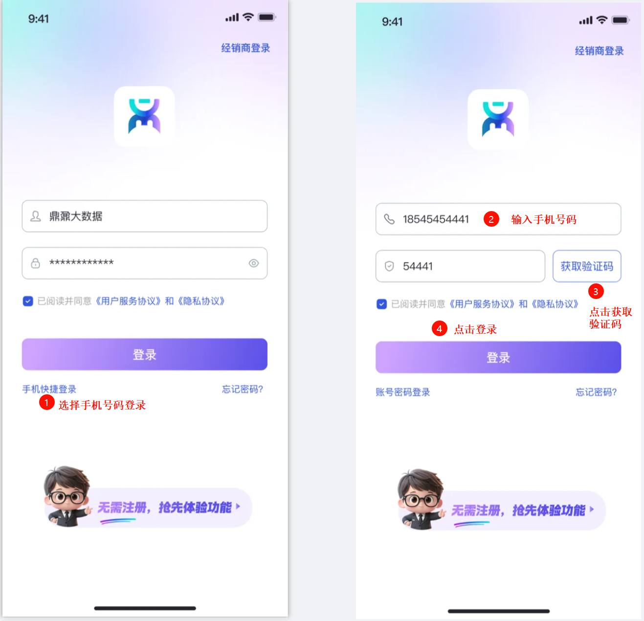 01/04:打开鼐思企管,选择手机号码登录,并输入手机号码和验证码