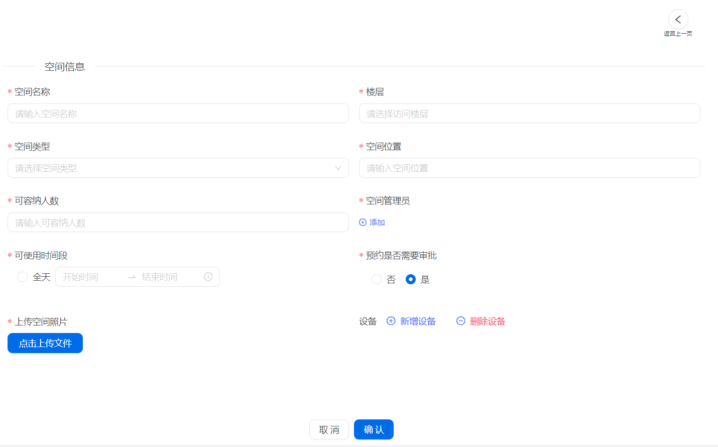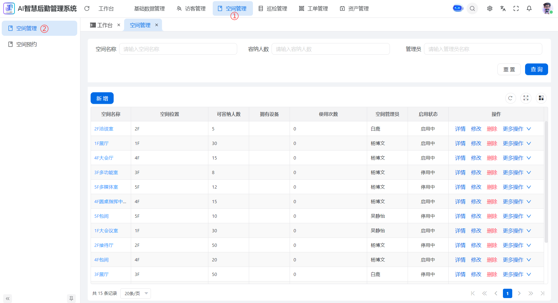#### 1. 页面概述 空间管理页面主要用于管理和查看不同空间的信息,包括空间的名称、容纳人数、位置、管理者等信息。用户可以在此页面进行新增、查询、修改和删除空间信息的操作。 #### 2. 页面布局 页面主要分为两个部分:查询条件区域和空间信息列表区域。 #### 3. 查询条件区域 在页面顶部,提供了三个查询条件输入框: - **空间名称**:输入需要查询的空间名称。 - **容纳人数**:输入需要查询的空间容纳人数。 - **管理员**:输入需要查询的空间管理员名称。 右侧有两个按钮: - **重置**:点击该按钮可以清空所有查询条件。 - **查询**:点击该按钮可以执行查询操作,显示符合条件的空间信息。 #### 4. 空间信息列表区域 查询结果以表格形式展示,表格包含以下列: - **空间名称**:空间的名称。 - **空间位置**:空间所在的位置。 - **可容纳人数**:空间可容纳的最大人数。 - **拥有设备**:空间拥有的设备情况。 - **使用次数**:空间的使用次数。 - **空间管理员**:负责管理该空间的管理员。 - **启用状态**:空间的启用状态,如启用中、停用中等。 - **操作**:对空间进行详细查看、修改、删除等操作的按钮。 在表格上方有一个“新增”按钮,点击该按钮可以跳转到新增空间信息的页面。 #### 5. 新增空间信息页面 在新增空间信息页面,用户需要填写以下信息: - **空间名称**:必填项,输入空间的名称。 - **空间类型**:必填项,选择空间的类型。 - **可容纳人数**:必填项,输入空间可容纳的最大人数。 - **可使用时间段**:必填项,选择空间的可用时间段。 - **上传空间照片**:可选,上传空间的照片。 - **楼层**:必填项,输入空间所在的楼层。 - **空间位置**:必填项,输入空间的具体位置。 - **空间管理员**:必填项,选择或输入空间的管理员。 - **预约是否需要审批**:选择是否需要对空间的预约进行审批。 页面底部有“取消”和“确认”按钮,用户可以取消操作或确认新增空间信息。
