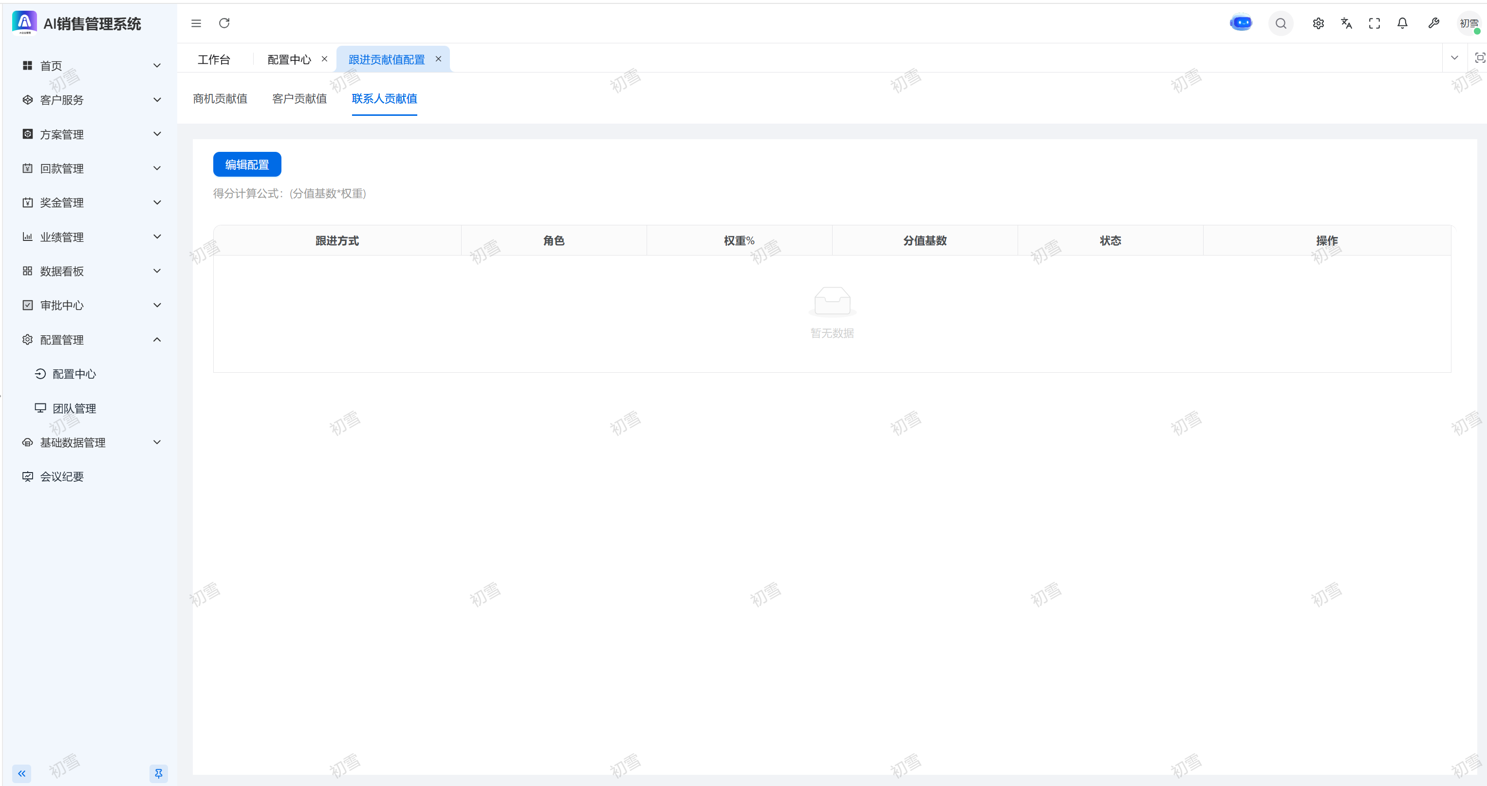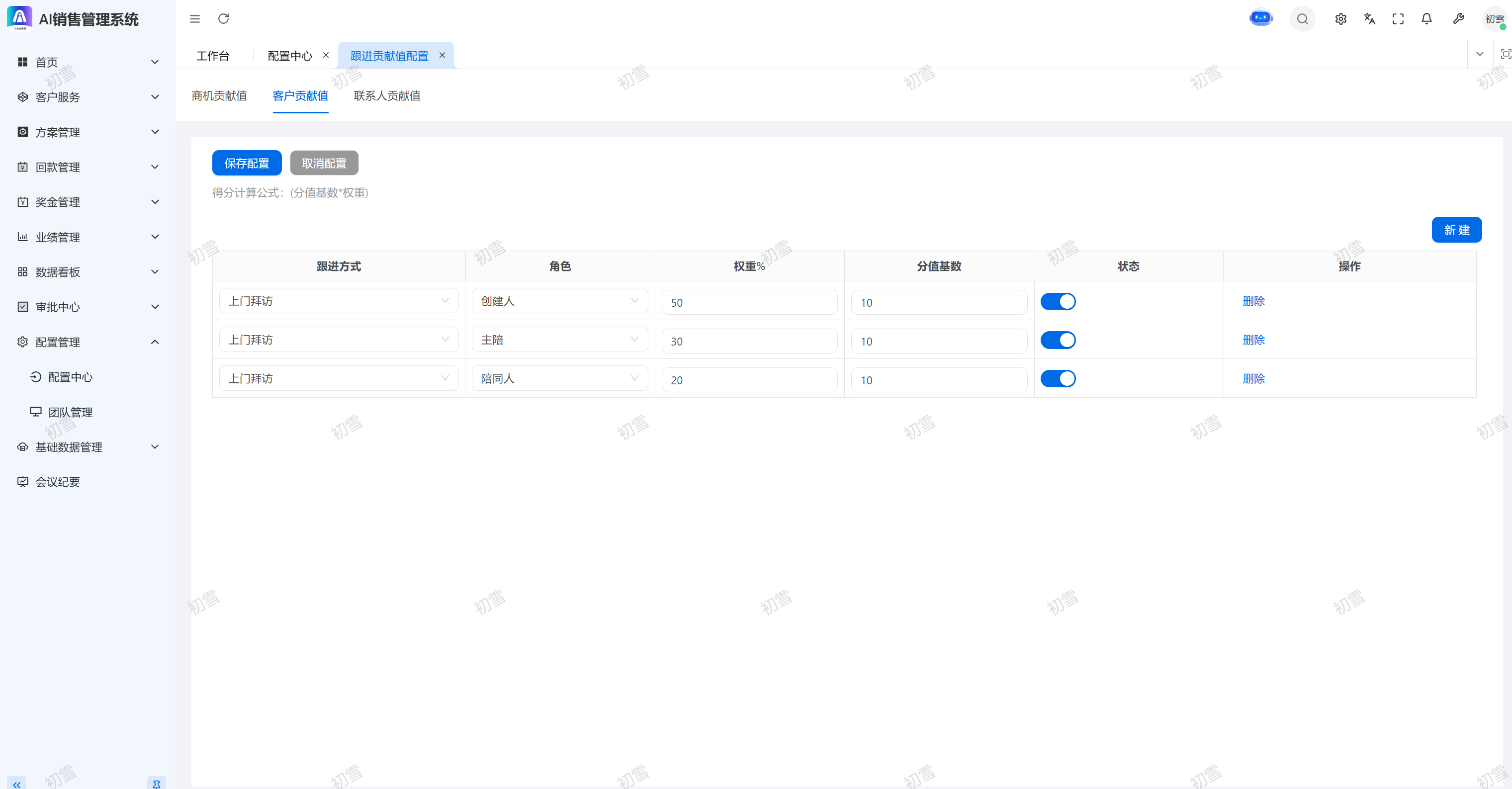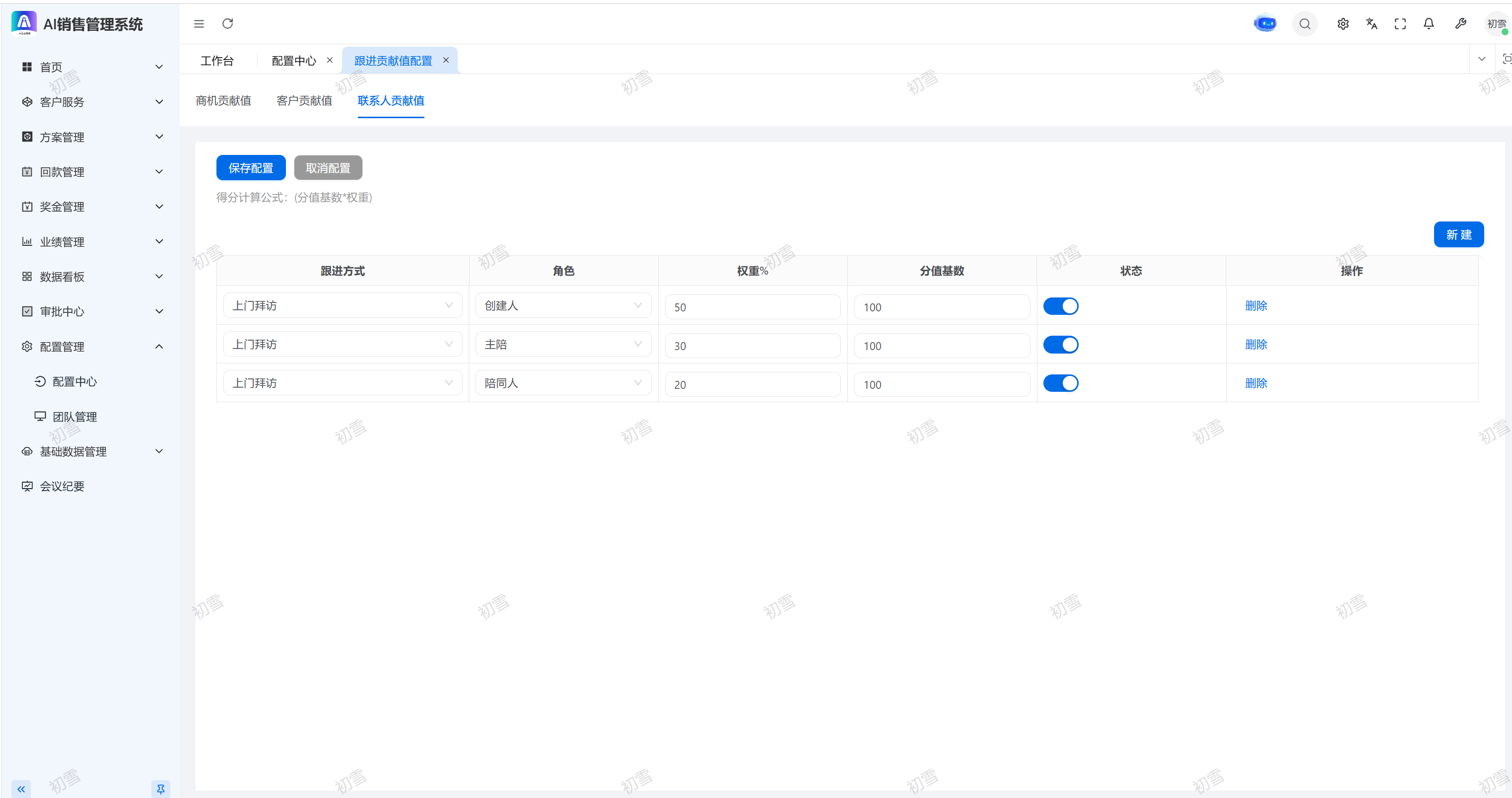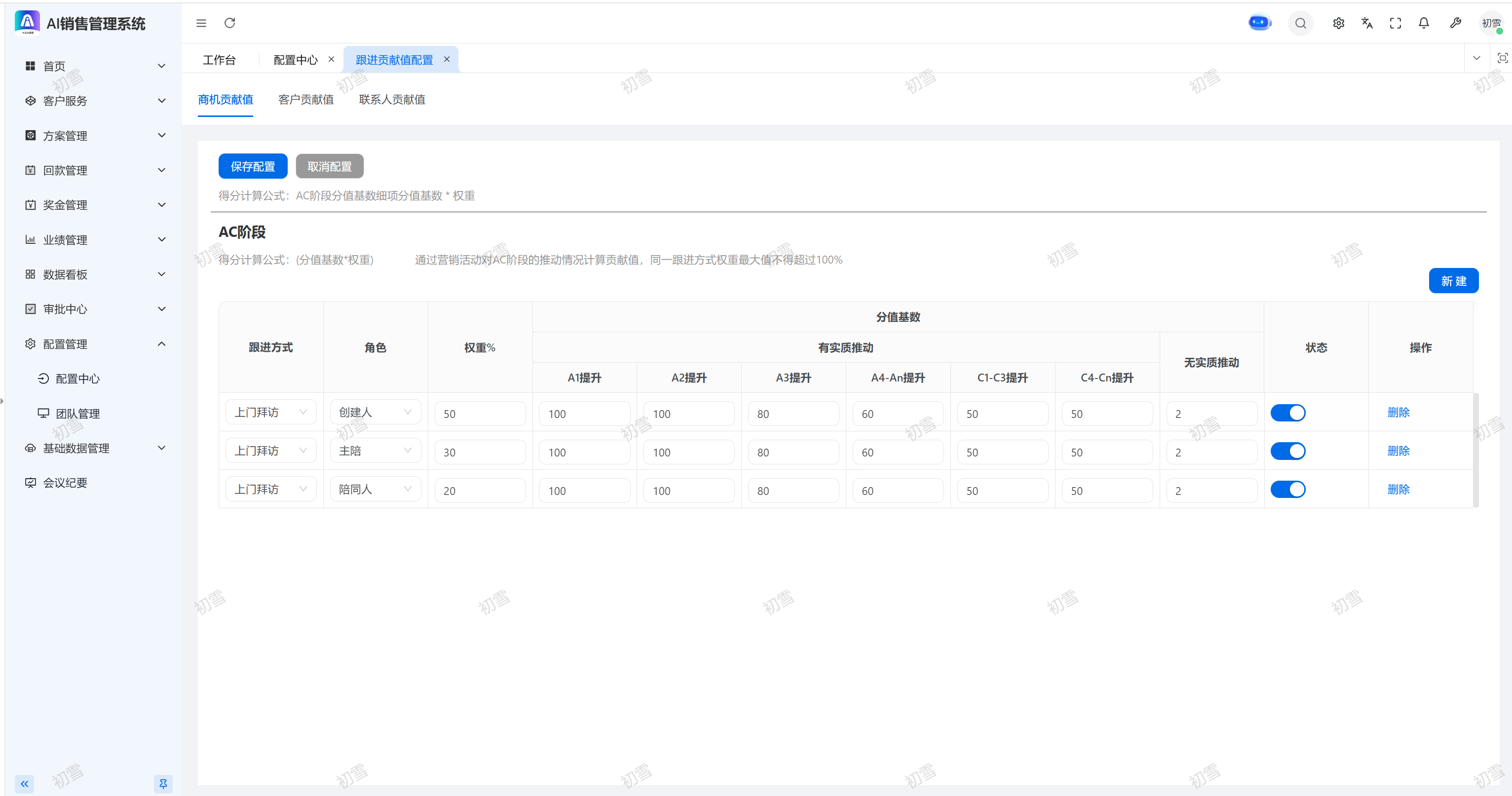 客户服务配置模块提供核心规则的自定义能力,支持企业按需灵活设定贡献值计算标准、团队角色考核机制、客户公海流转规则及商机池管理策略,实现客户/商机资源分配、团队激励与协作流程的精准化、规范化管理。