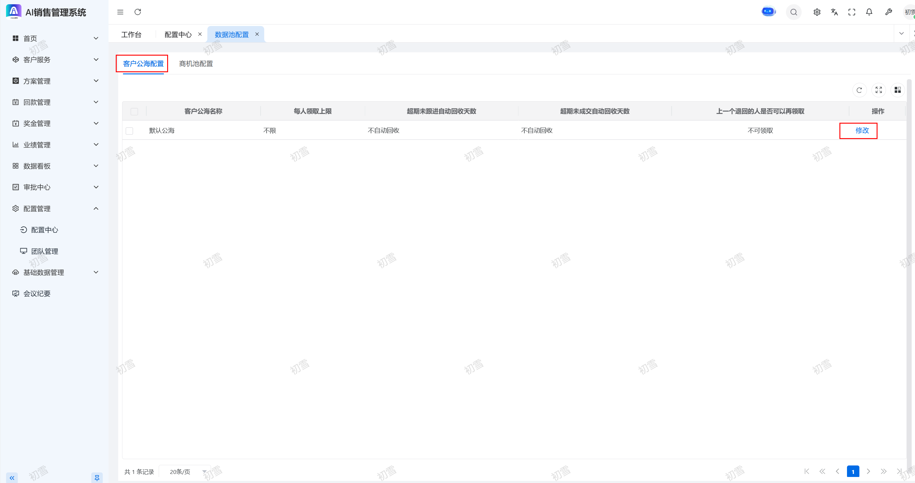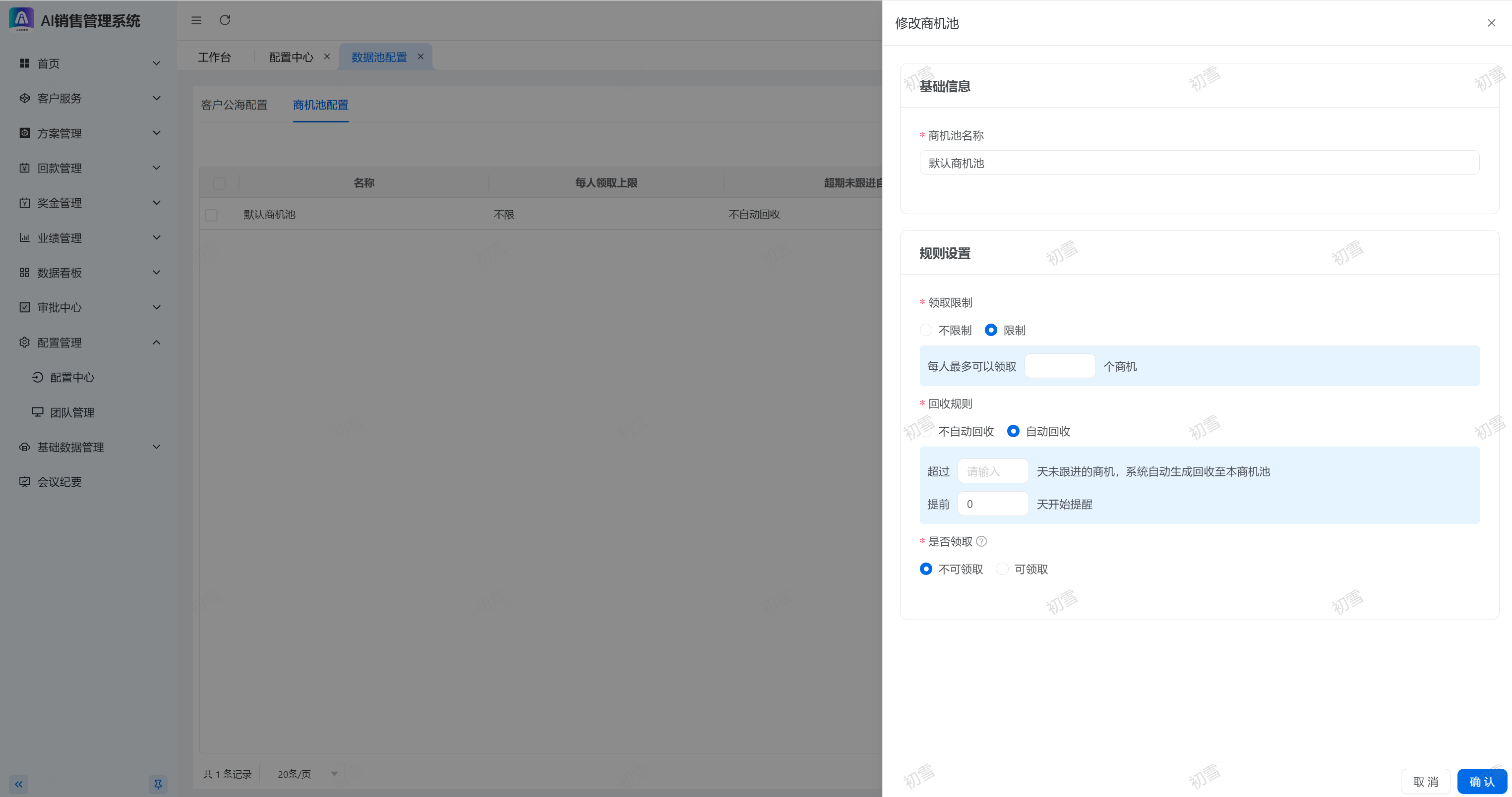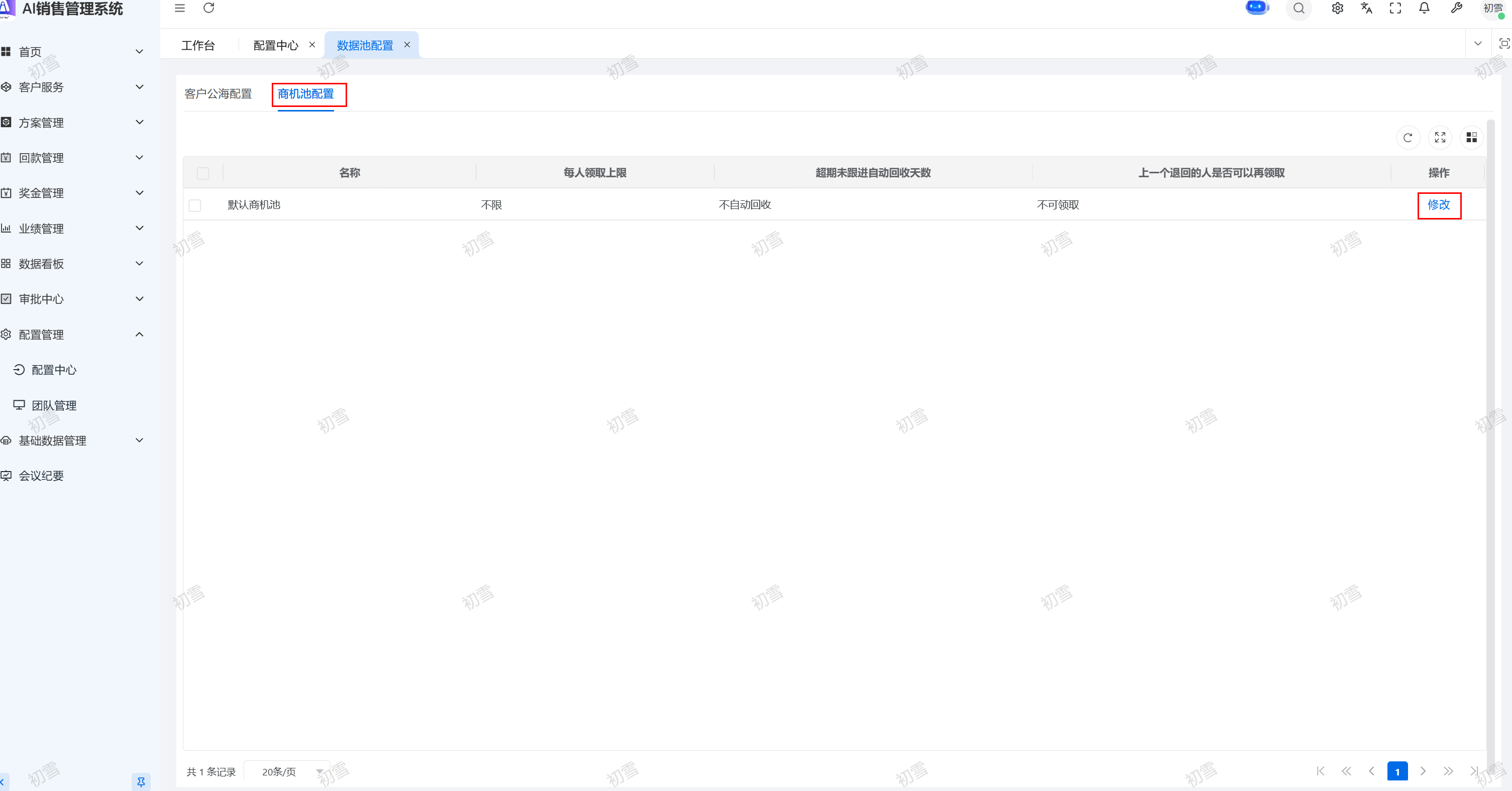 商机池配置设置入口:【电脑端】>【配置管理】>【配置中心】> 【数据池配置】> 【商机池配置】