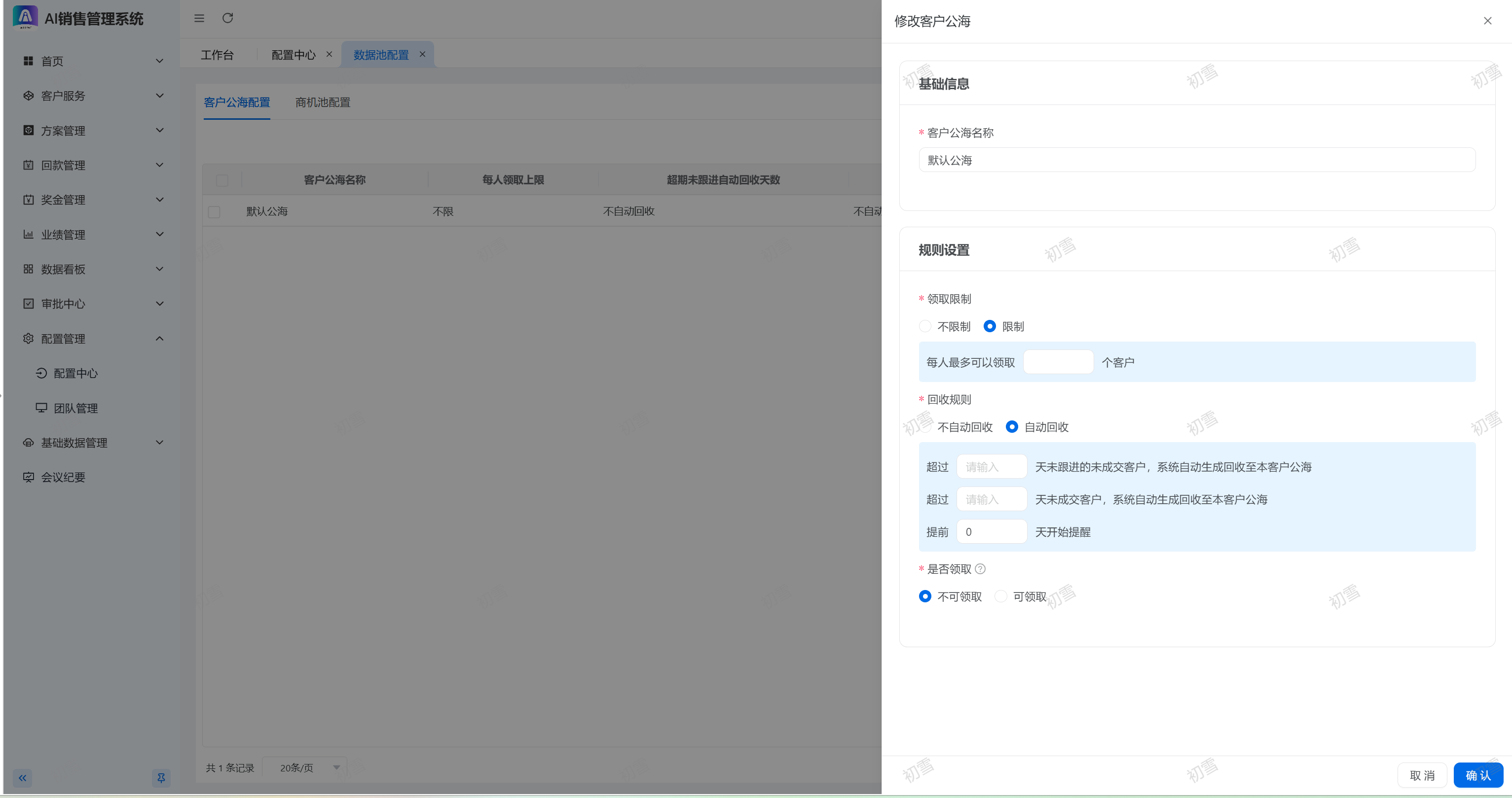 客户公海配置设置入口:【电脑端】>【配置管理】>【配置中心】> 【数据池配置】> 【客户公海配置】