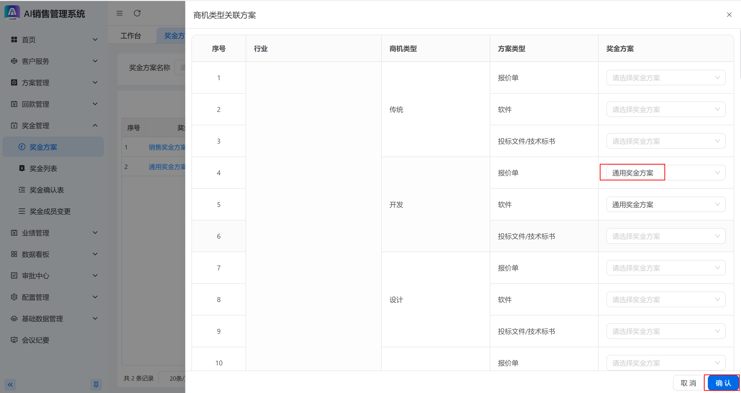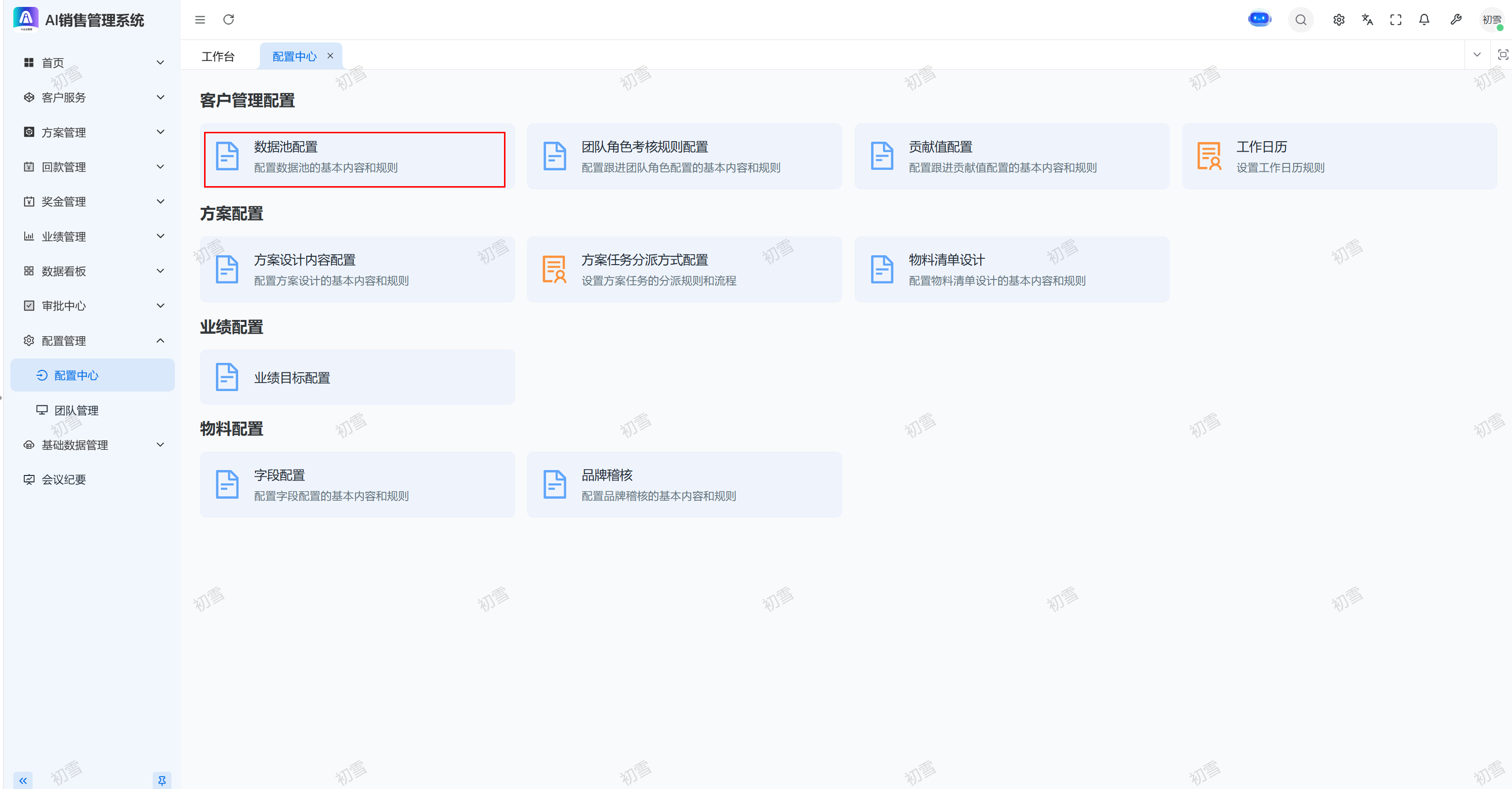 管理员在获取账号并成功登录AI销售管理系统后,开始进行按需进行奖金方案、业绩目标、方案设计及客户服务初始化配置工作。