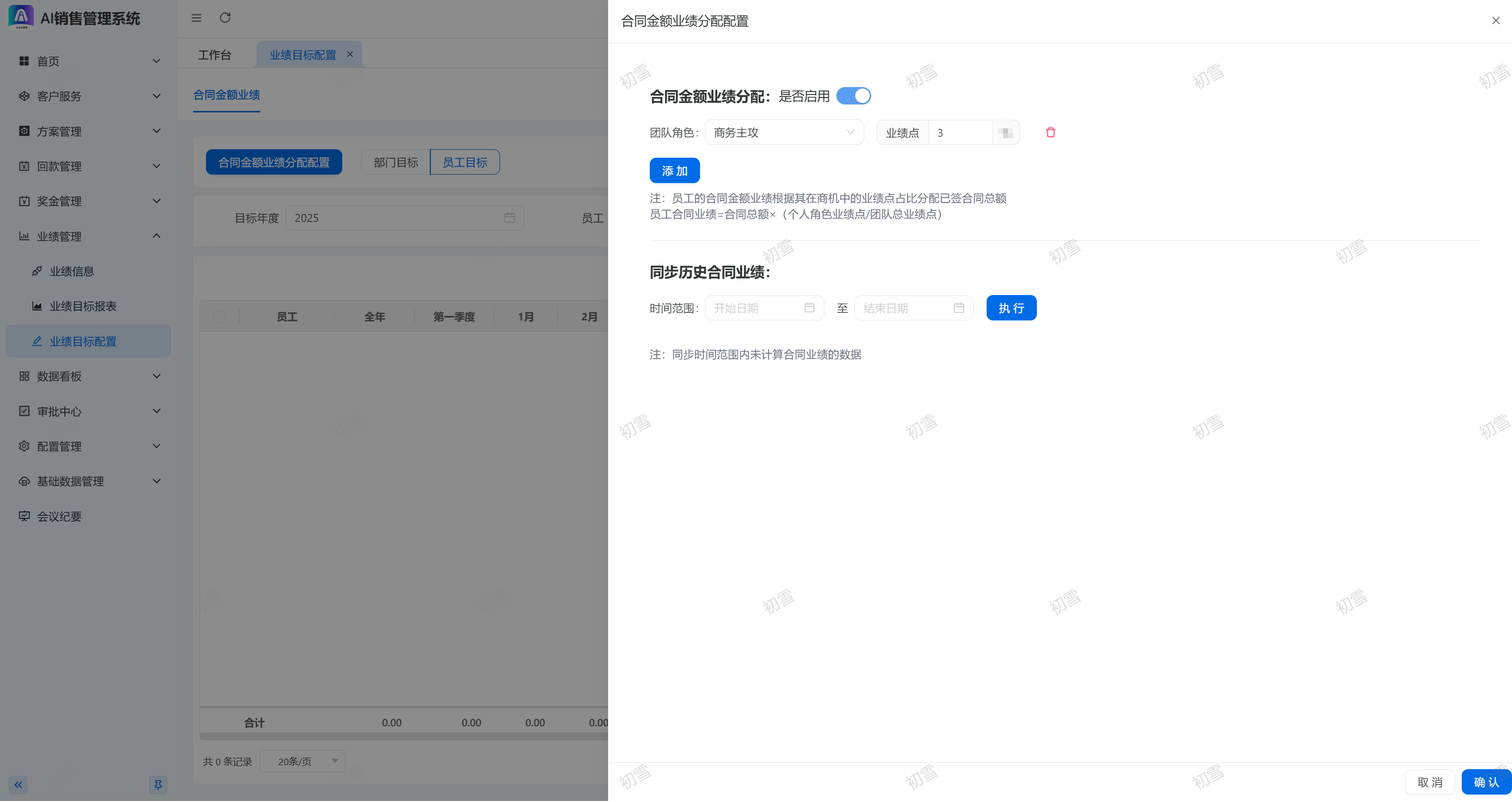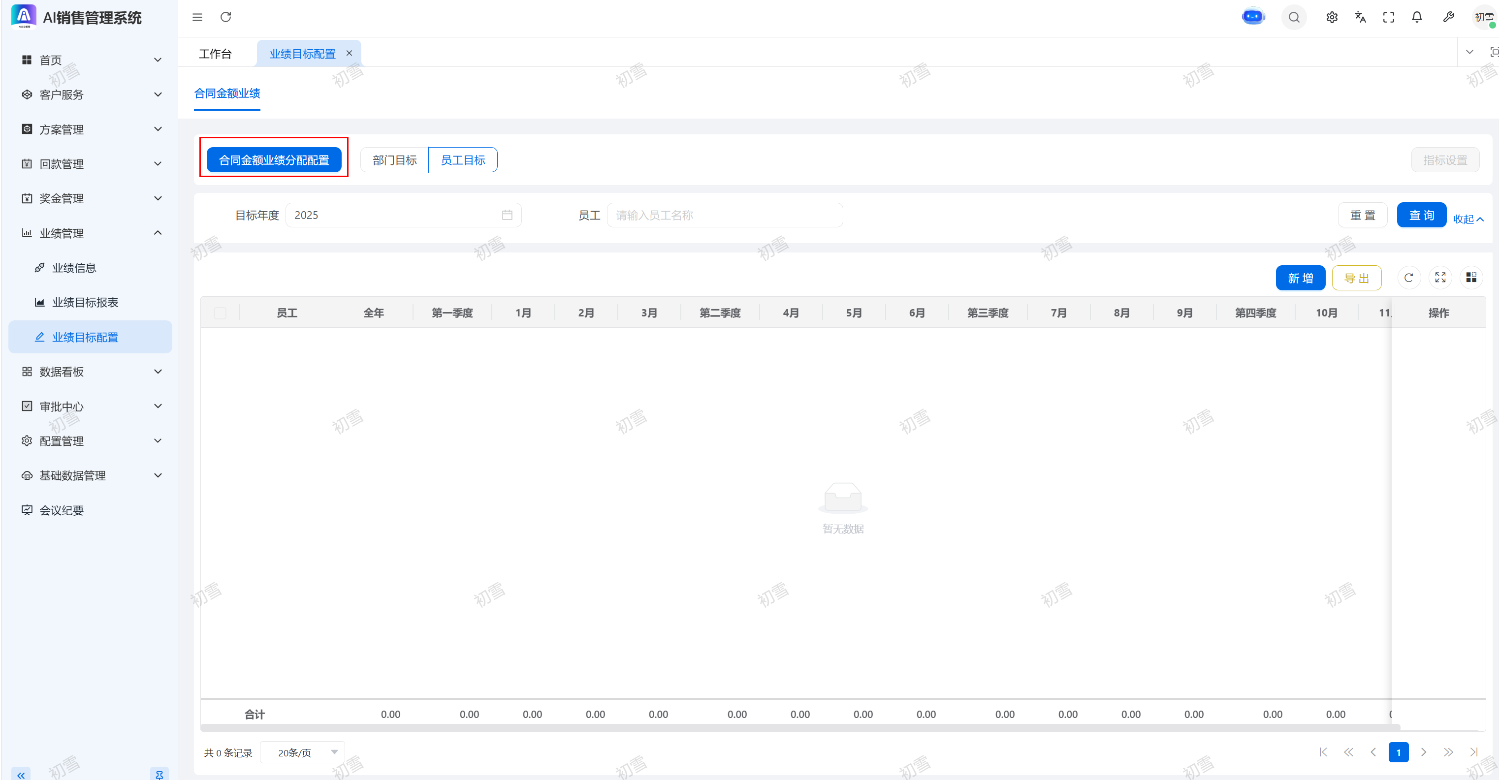 如用户需设置业绩目标,用户可在【业绩管理】-【业绩目标配置】中完成合同金额业绩配置