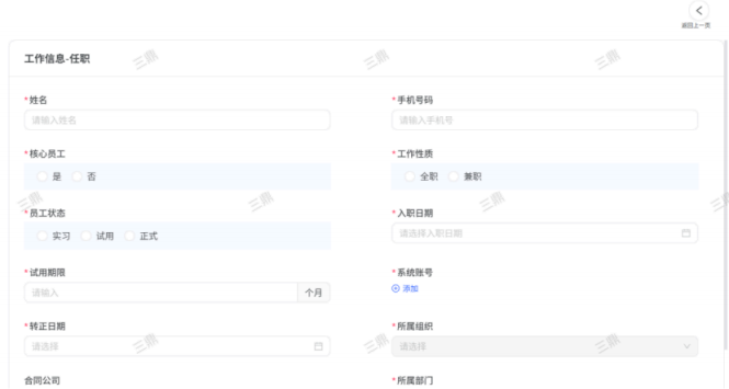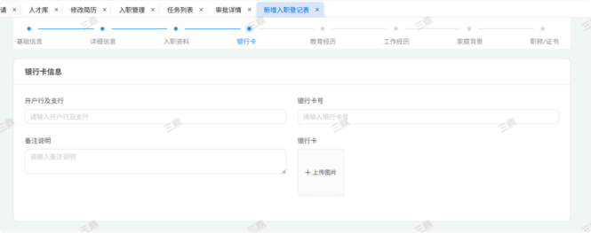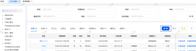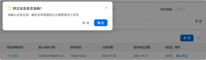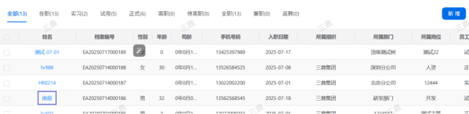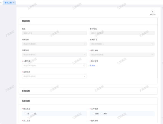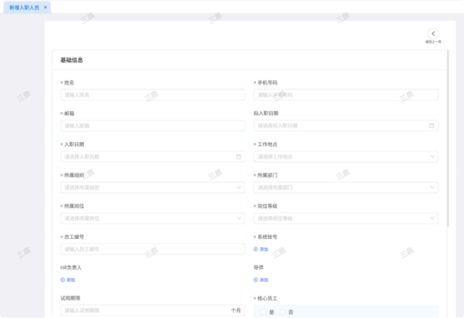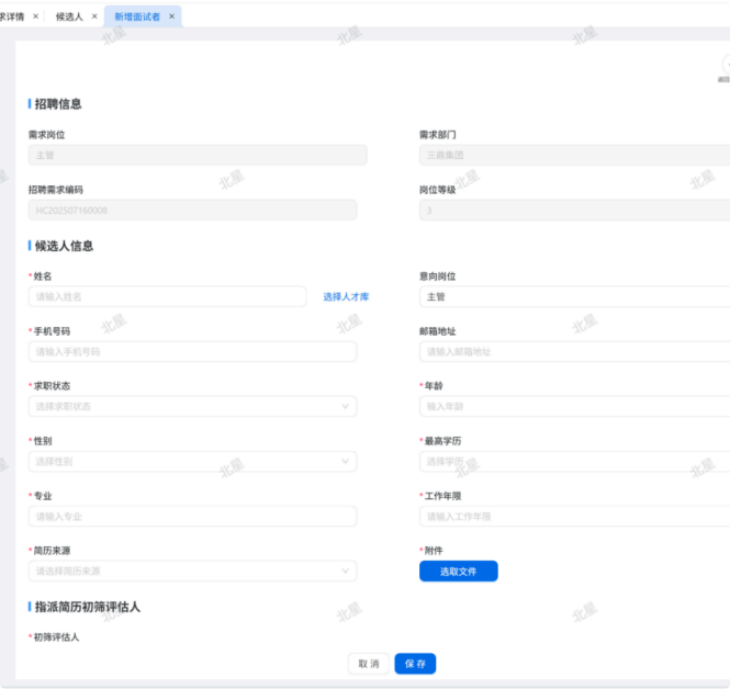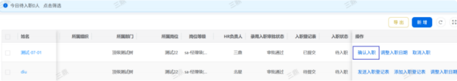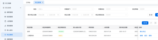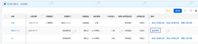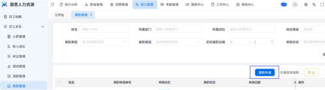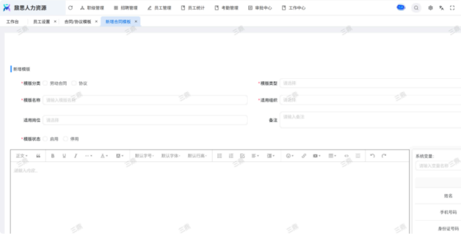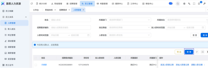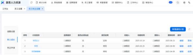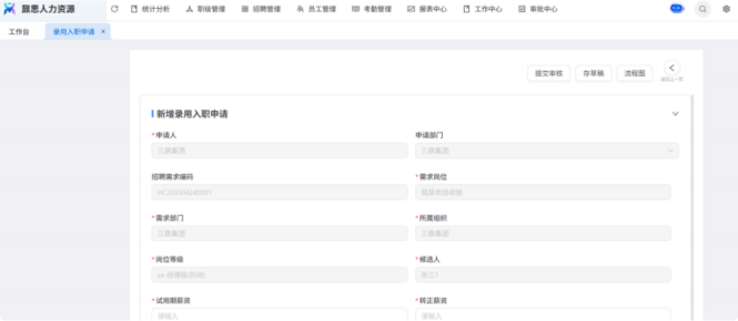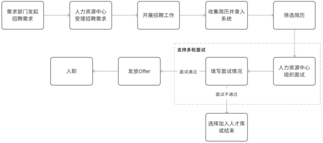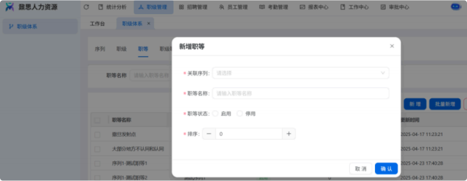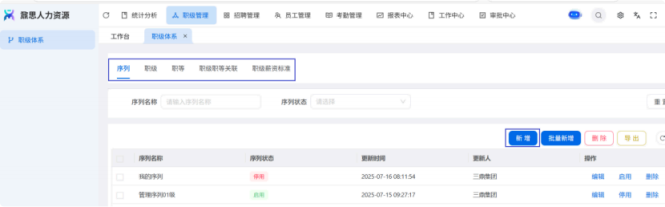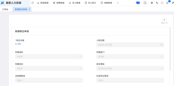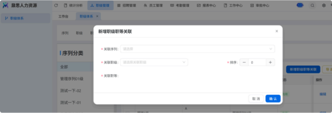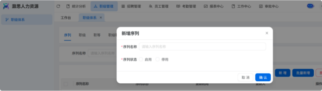 人力资源系统操作流程 ● 系统功能组成: 职级管理 ,招聘管理 ,员工管理 ,考勤管理 ,绩效管理 ,薪酬管理 ,培训管理 职级管理 职级体系通过整合序列、职级和职等信息 ,构建起标准化的员工职业发展通道 ,同时为薪酬核算提供等级依据 ,保障薪酬分配的公平性与合理性。  1\.新增序列 点击 “ 职级管理 \- 薪酬职级体系 \- 序列” 进入序列信息管理界面。 添加序列信息的方式有两种:①点击 【新增】 按钮逐条添加 ,②点击 【批量新增】 进行批量添加。   2\.新增职级 点击 “ 职级管理 \- 薪酬职级体系 \- 职级” 进入职级信息管理界面。 添加职级信息的方式有两种:①点击 【新增】 按钮逐条添加 ,②点击 【批量新增】 进行批量添加。  3\.新增职等 点击 “ 职级管理 \- 薪酬职级体系 \- 职等” 进入职等信息管理界面。 添加职等信息的方式有两种:①点击 【新增】 按钮逐条添加 ,②点击 【批量新增】 进行批量添加。  4\.职级职等关联 点击 “ 职级管理 \- 薪酬职级体系 \- 职级职等关联” ,进入职级职等关联数据界面。点击 【新增职级职等】,选择对应的序列、职级和职等数据 ,完成关联操作。  5\.执行对应薪酬 点击 “ 职级管理 \- 薪酬职级体系 \- 职级薪资标准” ,进入界面。点击 【同步序列职级表】 按钮以更新序列职级及职等信息。  招聘管理 招聘管理涵盖招聘需求、候选人和人才库三大模块。 当出现岗位空缺或产生招聘需求时 ,可通过系统发起申请 ,经审批通过后 , 由人力资源相关人员负责受理并组织开展相关招聘工作。  1\.新增招聘需求 点击 【新增招聘】,填写招聘需求申请信息 ,并提交审批流程。  2\.指派招聘负责人 审批通过后 ,点击 【指派招聘负责人】 按钮 ,可指定负责人跟进相应的招聘事务。  3\.新增面试者 点击 【新增面试者】 按钮 ,填写面试者信息并保存 ,候选人模块将自动生成对应的面试者信息记录。  4\.初筛评估 简历初筛评估人点击 【姓名】 进入详情页面 ,查看候选人信息并进行评估。    5\.面试邀请 简历初筛通过后 ,可点击 【邀请面试】 按钮 ,填写相关信息并发送面试邀请。   6\.面试评估 主面试官点击 【面试评估】 按钮 ,填写并提交面试结果。  7\.复试邀请 初试通过后 ,如需安排复试 ,可点击 【邀请复试】 填写相关信息;复试结束后需再次提交面试评估结果(支持多轮面试 ,直至面试结束)   8\.录用入职申请 点击 【录用入职申请】,填写申请信息并发起录用审批。   9\.发送 offer 录用申请审批通过后 ,点击 【发送 offer】,填写发送内容。   10\.确认录用 候选人接受 Offer 并最终决定录用后 ,点击 【确认录用】 按钮完成确认操作。  11\.停止应聘 点击 【停止招聘】 后 ,系统将终止后续的招聘流程。  员工管理 | A | 新入职人员: | | | --- | --- | --- | 1\.新增入职人员 在新增待入职人员数据时 ,点击 【新增】 按钮并填写人员信息后 ,即可生成对应的待入职记录。   2\.填写入职登记表 待入职人员需要登记基本信息 ,可通过以下两种方式完成:①向待入职人员发送入职登记表,由其自行填写;②由有权限的用户直接代为填写 ,直至完成信息登记。 向待入职人员发送入职登记表:  代为填写入职登记表:  3\.确认入职 点击 【确认入职】 按钮并填写相关信息 ,完成填写后 ,入职状态将从 “待入职” 变更为 “ 已入职”   4\.指派导师 点击 【指派导师】 按钮 ,即可指定导师负责相应业务的跟进工作   5\.新增成长计划 根据实际情况在通用计划的基础上灵活新增成长计划 ,点击 【新增计划】 按钮 ,选择新员工并填写计划任务信息后 ,即可生成个性化的成长任务。  6\.填写新人计划信息 根据新人计划内设定的阶段性步骤 ,逐步填写计划信息 ,内容包括:新员工填写计划完成情况、导师评价、直属上级评价及人力资源中心建议。  7\.设置转正通用计划 在当前页面可设置转正通用计划 ,启用该计划后 , 当 【入职管理】 完成入职确认操作 ,系统将根据设定的适用组织生成对应的新员工通用计划 ,并自动添加至其个人成长计划列表中。  8\.设置转正申请条件 在当前页面可设置转正申请的条件信息 ,开启设置后 ,系统将根据设定的申请规则自动执行相关的业务操作。  9\.设置合同 / 协议模版 点击 “ 员工设置 \- 合同 / 协议模版” ,进入合同 / 协议模版管理界面 点击 【新增模版】 按钮 ,根据实际需求创建合同或协议的模版 ,供 【合同协议】 模块调用; 支持编辑、停用 / 启用 、预览和删除功能。   10\.转正申请 员工试用期即将结束且已完成新人成长计划(若有) 时 ,有权限的用户可通过系统发起员工转正申请 ,上传相关的转正材料 ,并根据员工信息及试用期间的表现情况 ,完善转正信息后提交审批  11\.确认转正 转正审批通过后 ,员工本人(即转正对象) 需要点击 【确认转正】 按钮完成确认 ,至此转正流程结束。   | A | 原公司人员: | | | --- | --- | --- | 1\.新增档案 在新增员工档案数据时 ,点击 【新增】 按钮并填写相关档案信息 ,系统将自动生成对应的员工档案记录。   2\.查看员工档案 点击员工姓名 ,进入员工档案详情页面进行查阅。   3\.调动申请 有权限的用户可选择调动对象 ,完善调动信息后提交审批。   4\.申请离职 员工本人通过系统发起离职申请 ,需填写离职原因、期望离职日期等信息后提交审批。   考勤管理 考勤管理