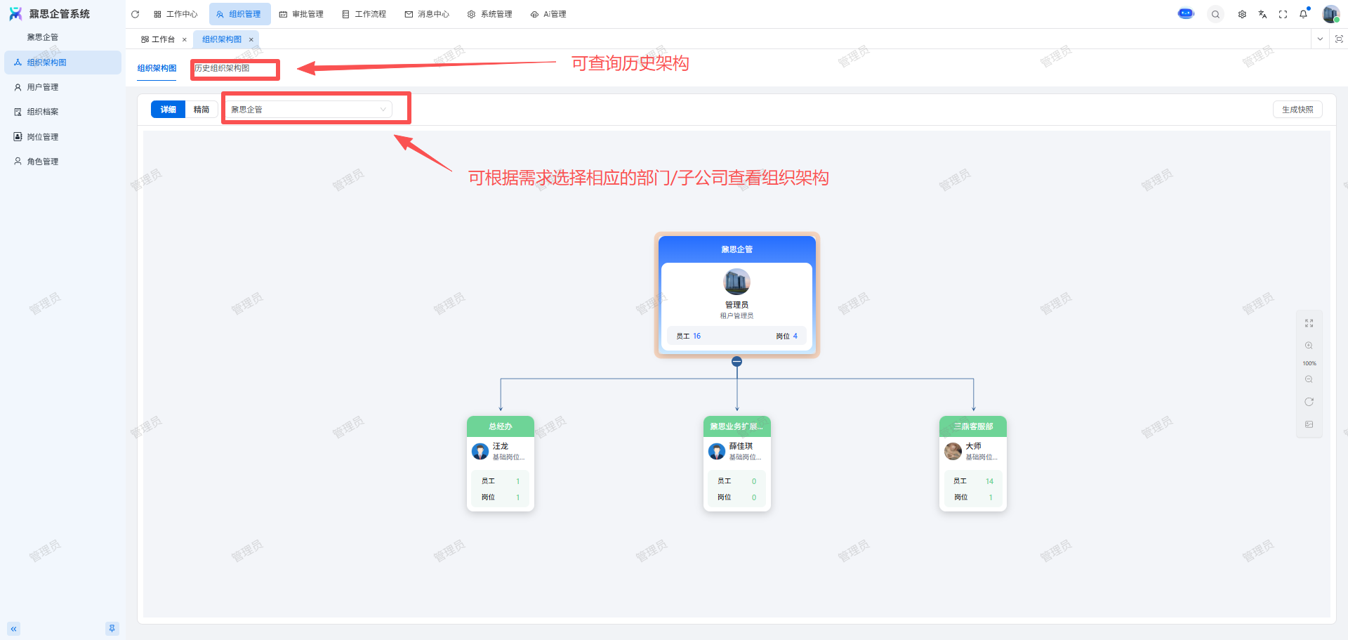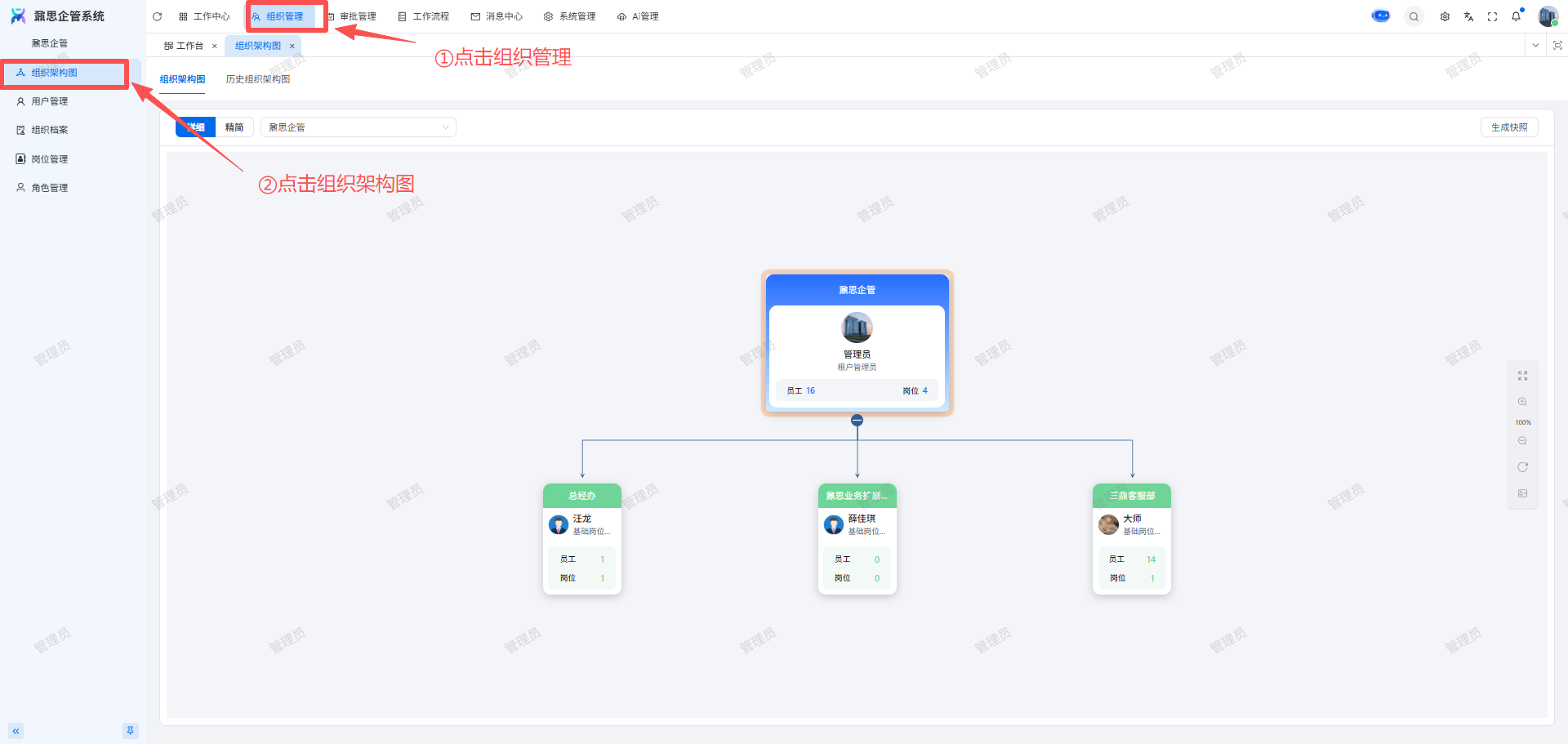 第一步: 依次点击“组织管理”—— “组织架构图”  第二步: 根据需求查询架构