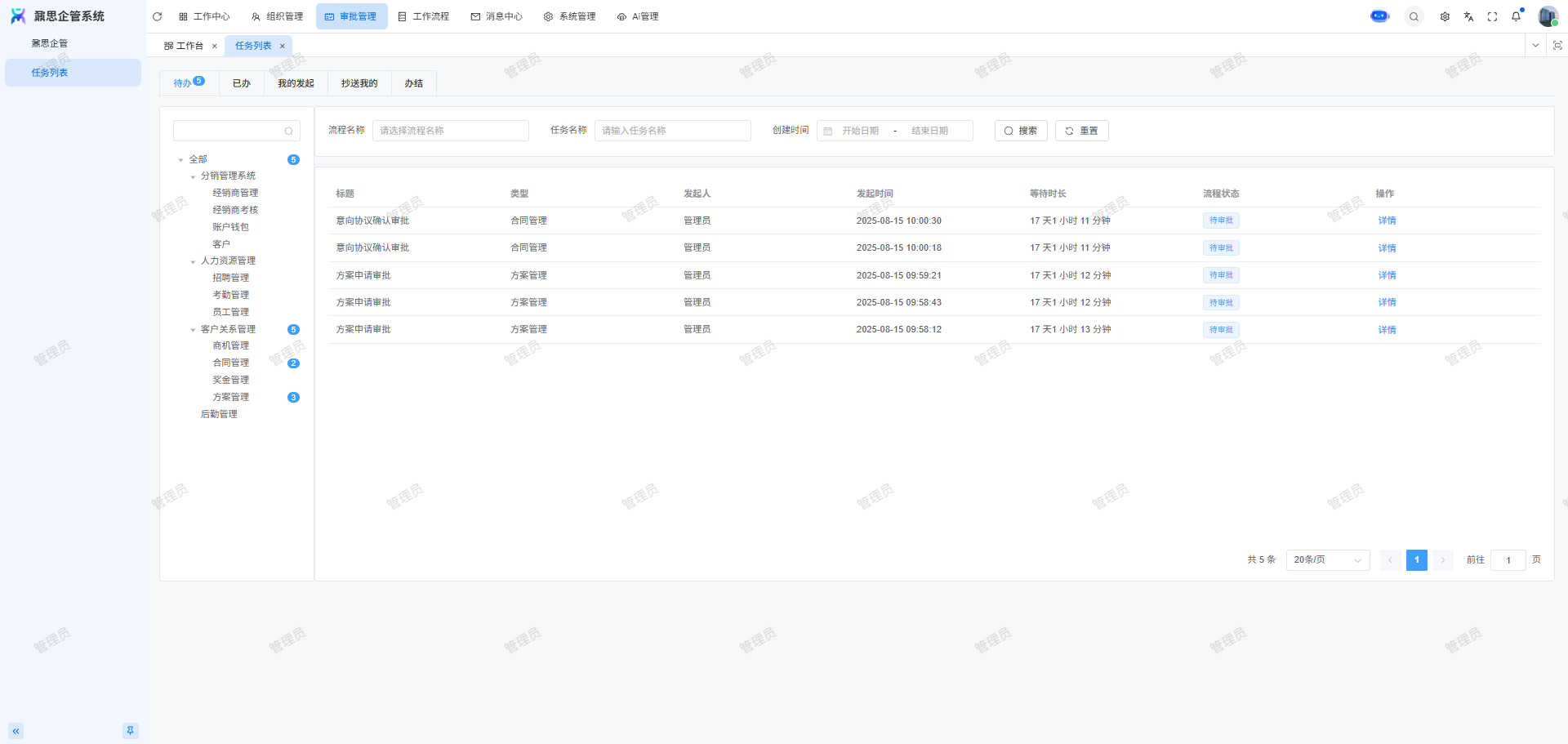 审批管理-工作任务 1、任务列表 分类:待办、已办、我的发起、抄送我的、办结