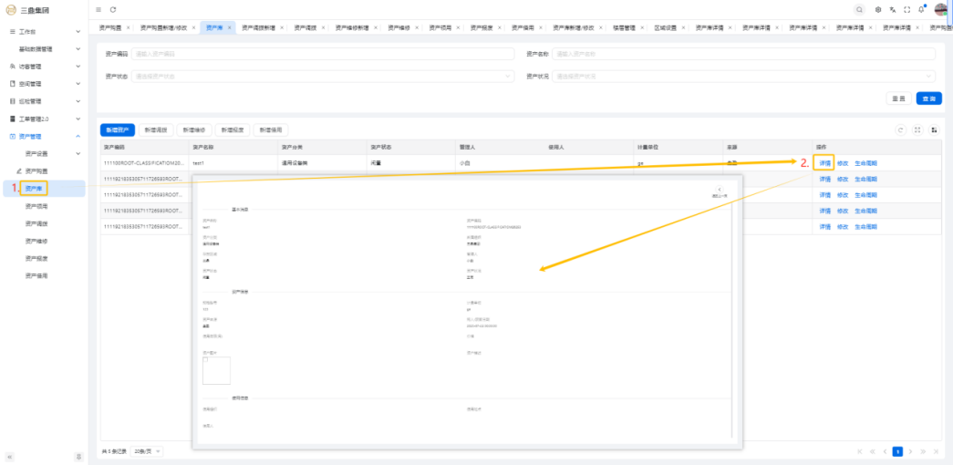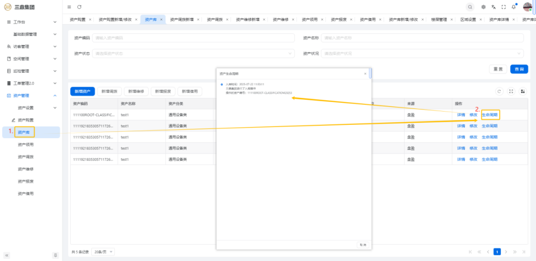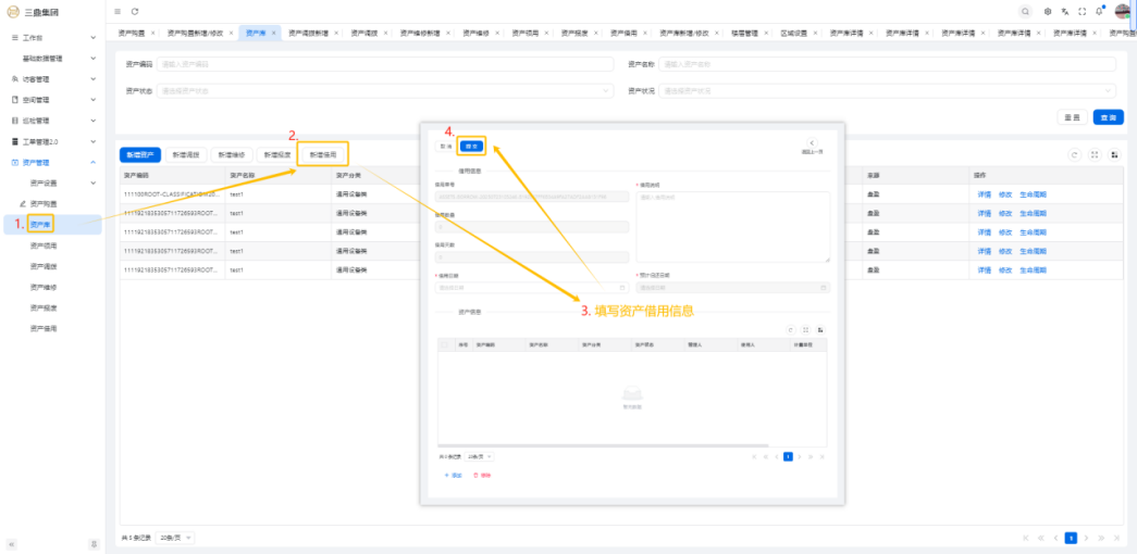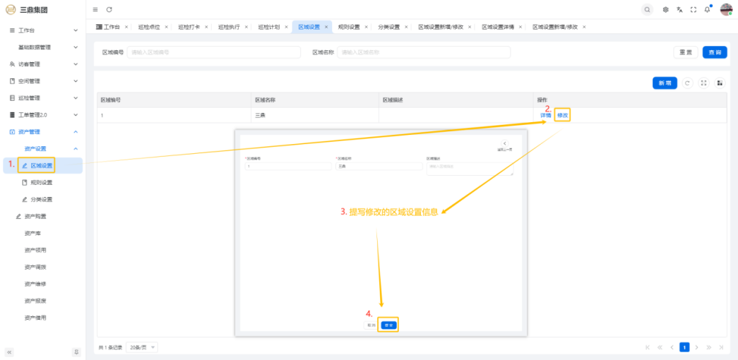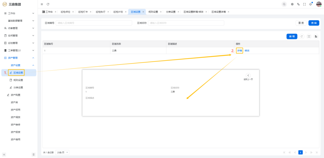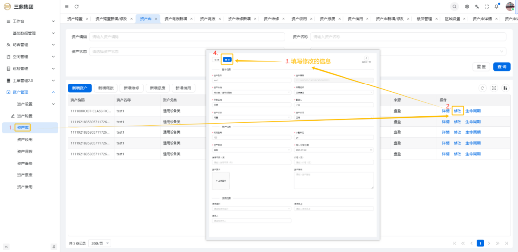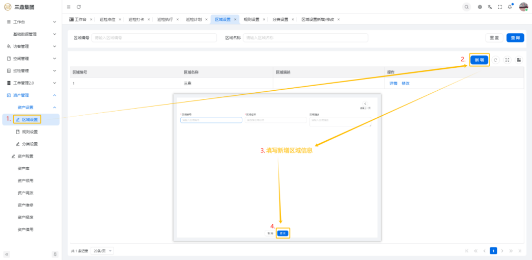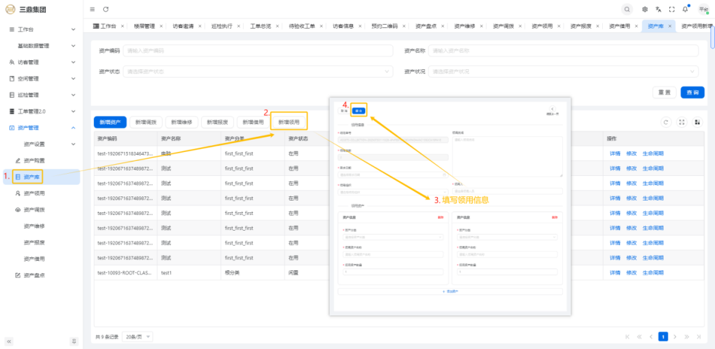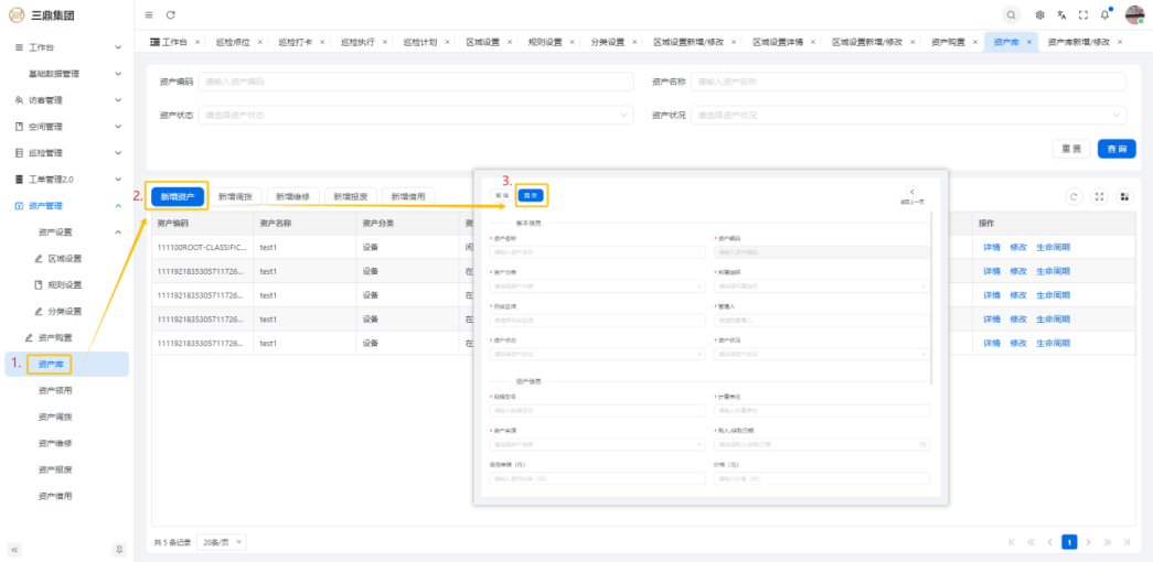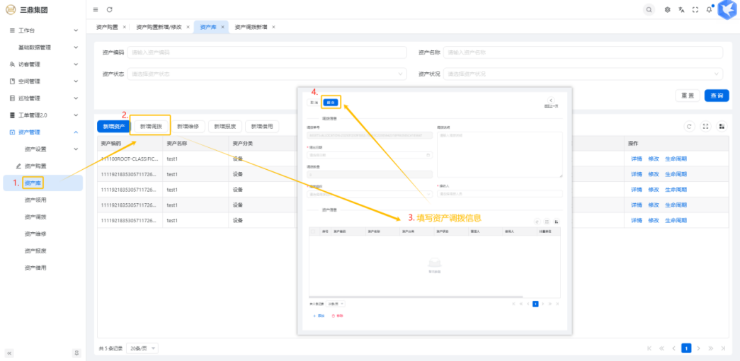 4\. 资产管理 4\.1资产设置 4\.1\.1区域设置 * 新增区域设置  * 查看区域设置详情  * 修改区域设置信息  4\.1\.2规则设置  4\.1\.3分类设置 * 新增分类设置  * 查看分类设置详情  * 修改分类设置  4\.2资产购置 4\.2\.1新增资产购置  4\.2\.2完成采购 审批通过后,可以进行完成采购操作。  4\.2\.3入库 购置资产采购完成后方可进行入库操作,数据同步到资产库列表。  4\.3资产库 4\.3\.1新增资产  4\.3\.2新增调拨 新增调拨成功后,数据同步到资产调拨页面列表。  4\.3\.3新增维修 新增维修成功后,数据同步到资产维修页面列表。  4\.3\.4新增报废 新增报废成功后,数据同步到资产报废页面列表。  4\.3\.5新增借用 新增借用成功后,数据同步到资产借用页面列表。  4\.3\.6新增领用 新增借用成功后,数据同步到资产借用页面列表。  4\.3\.7查看资产库详情  4\.3\.8修改资产库详情  4\.3\.9查看资产库生命周期  4\.4资产领用 4\.4\.1新增资产领用 **** 4\.4\.2资产分配 资产领用审批通过后,分配相应资产被领用。  4\.4\.3资产退还  4\.4\.4资产验收 验收退还的资产。  4\.5资产调拨 4\.5\.1创建调拨申请  4\.5\.2调拨 调拨申请审核通过后,点击调拨,表单选择存放区域,提交即可。  4\.6资产维修 4\.6\.1创建资产维修  4\.6\.2完成工单 审批通过后,点击完成工单。  4\.6\.3验收 工单完成后,可对其进行验收。  4\.7资产报废 4\.7\.1资产报废申请  4\.7\.2资产退库 报废审核通过后,可进行退库操作。  4\.8资产借用 4\.8\.1资产借用申请  4\.8\.2资产归还 借用申请审核通过,使用后进行归还。  4\.8\.3资产验收 对退还的资产进行验收。  4\.9资产盘点