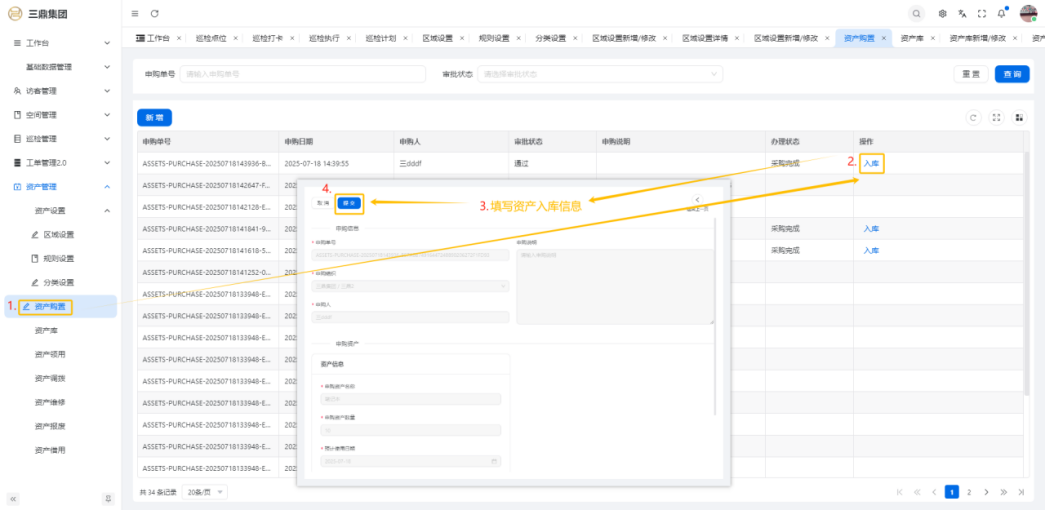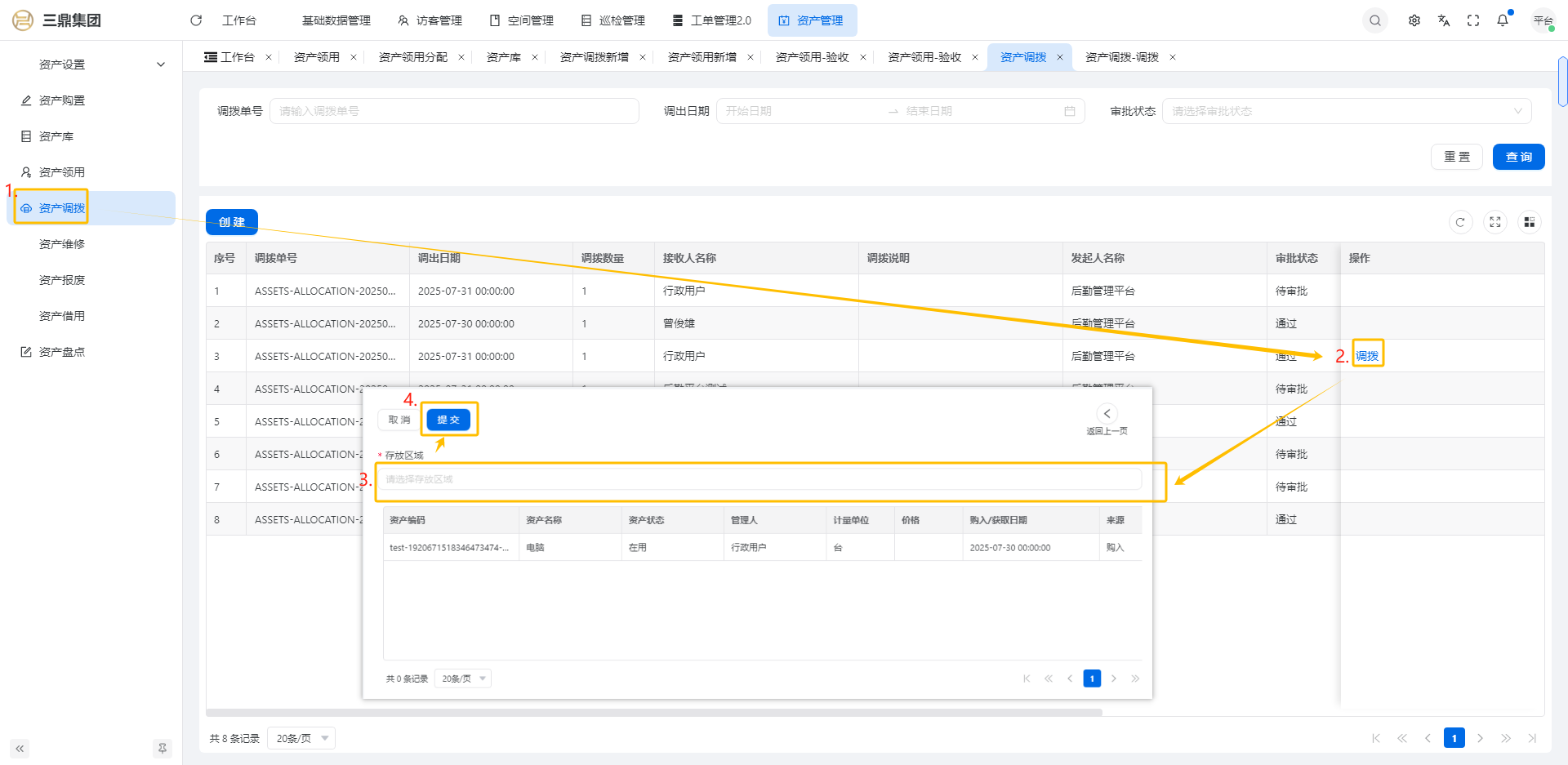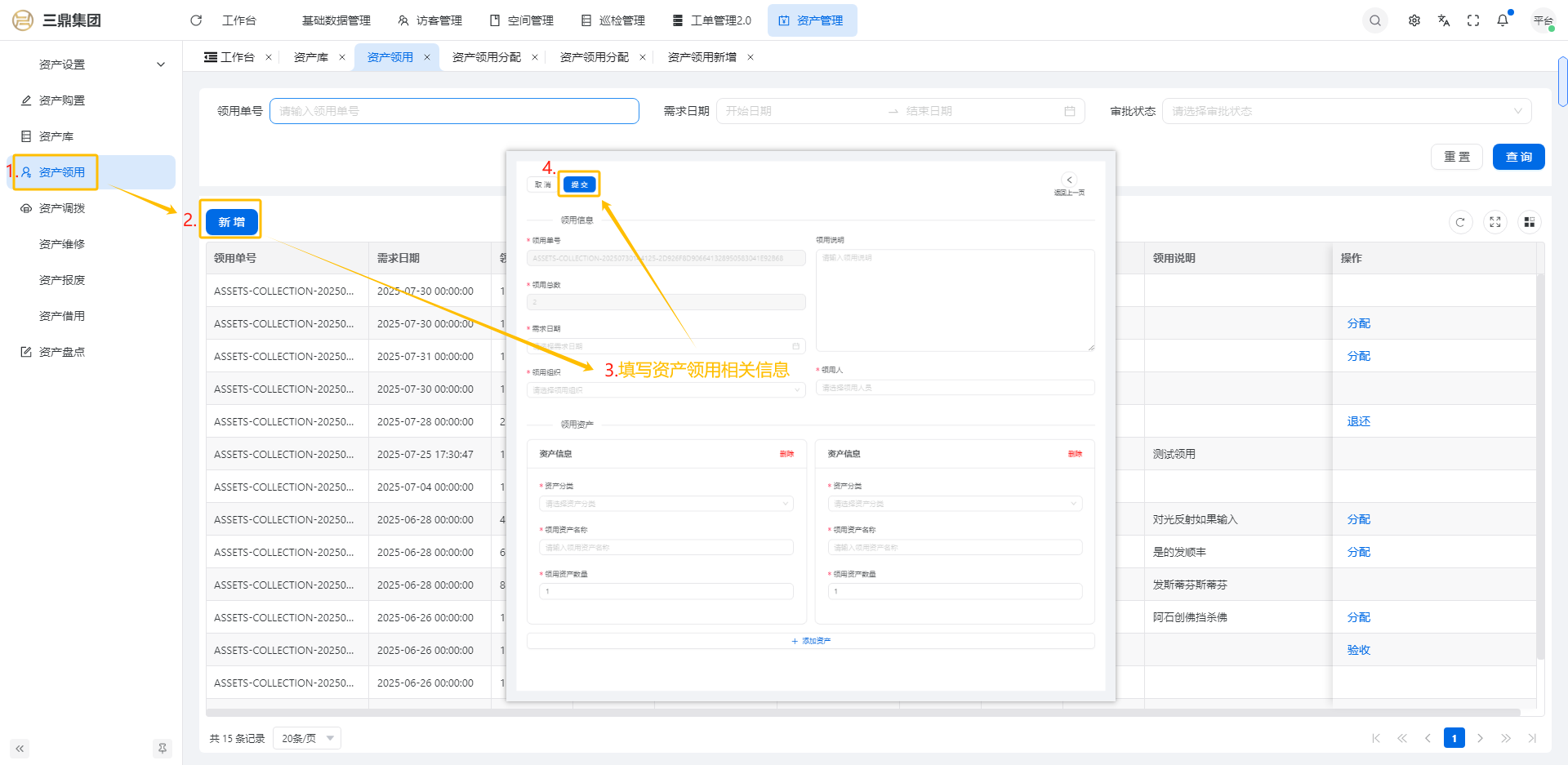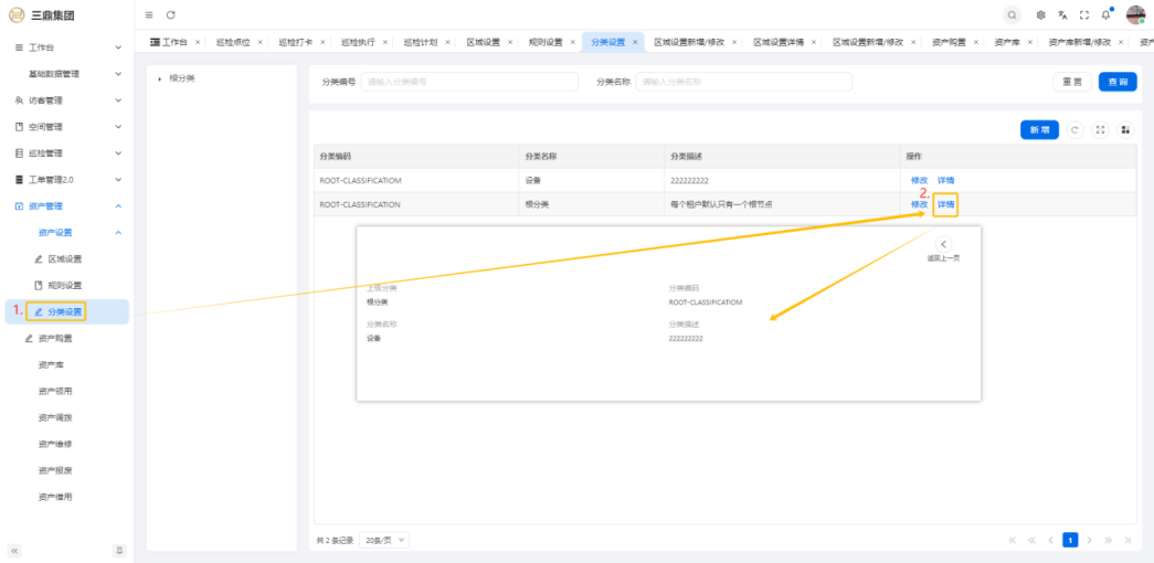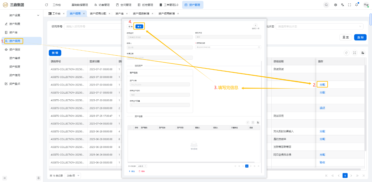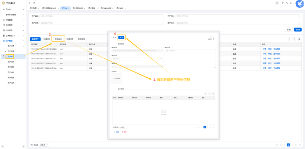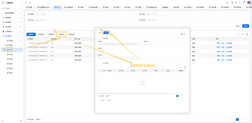 4\. 资产管理 4\.1资产设置 4\.1\.1区域设置 * 新增区域设置  * 查看区域设置详情  * 修改区域设置信息  4\.1\.2规则设置  4\.1\.3分类设置 * 新增分类设置  * 查看分类设置详情  * 修改分类设置  4\.2资产购置 4\.2\.1新增资产购置  4\.2\.2完成采购 审批通过后,可以进行完成采购操作。  4\.2\.3入库 购置资产采购完成后方可进行入库操作,数据同步到资产库列表。  4\.3资产库 4\.3\.1新增资产  4\.3\.2新增调拨 新增调拨成功后,数据同步到资产调拨页面列表。  4\.3\.3新增维修 新增维修成功后,数据同步到资产维修页面列表。  4\.3\.4新增报废 新增报废成功后,数据同步到资产报废页面列表。  4\.3\.5新增借用 新增借用成功后,数据同步到资产借用页面列表。  4\.3\.6新增领用 新增借用成功后,数据同步到资产借用页面列表。  4\.3\.7查看资产库详情  4\.3\.8修改资产库详情  4\.3\.9查看资产库生命周期  4\.4资产领用 4\.4\.1新增资产领用 **** 4\.4\.2资产分配 资产领用审批通过后,分配相应资产被领用。  4\.4\.3资产退还  4\.4\.4资产验收 验收退还的资产。  4\.5资产调拨 4\.5\.1创建调拨申请  4\.5\.2调拨 调拨申请审核通过后,点击调拨,表单选择存放区域,提交即可。  4\.6资产维修 4\.6\.1创建资产维修  4\.6\.2完成工单 审批通过后,点击完成工单。  4\.6\.3验收 工单完成后,可对其进行验收。  4\.7资产报废 4\.7\.1资产报废申请  4\.7\.2资产退库 报废审核通过后,可进行退库操作。  4\.8资产借用 4\.8\.1资产借用申请  4\.8\.2资产归还 借用申请审核通过,使用后进行归还。  4\.8\.3资产验收 对退还的资产进行验收。  4\.9资产盘点