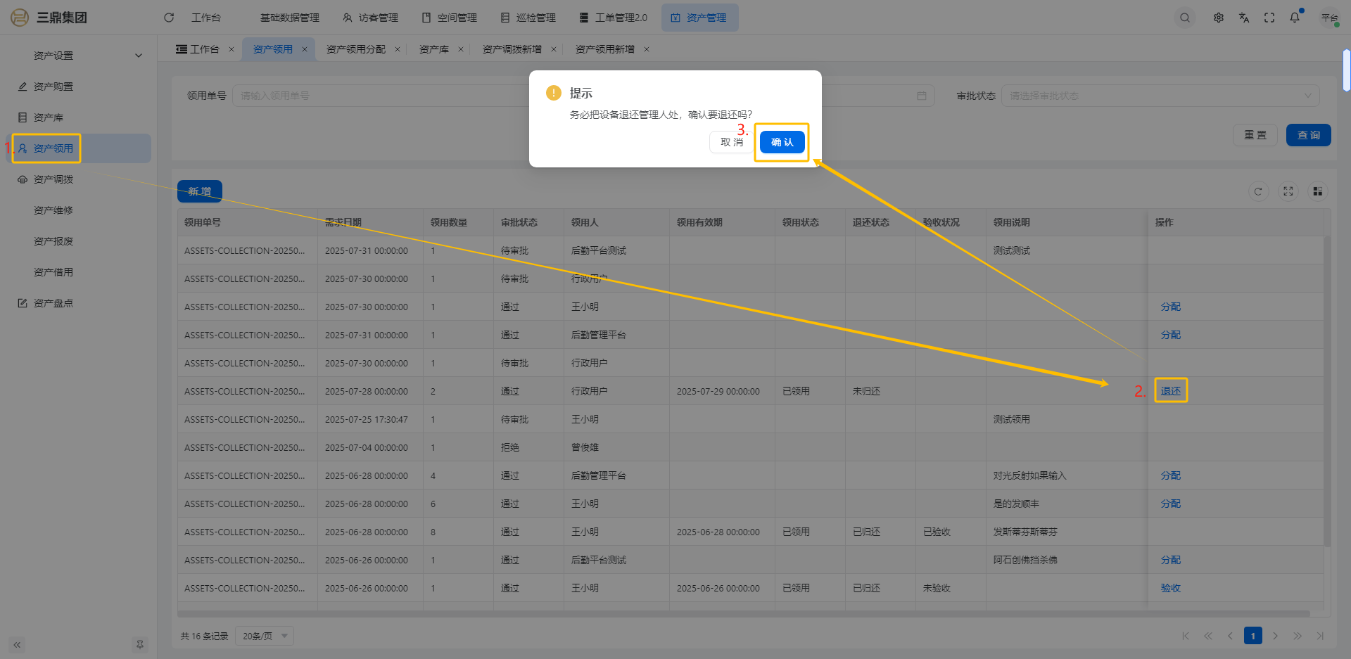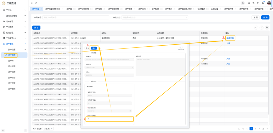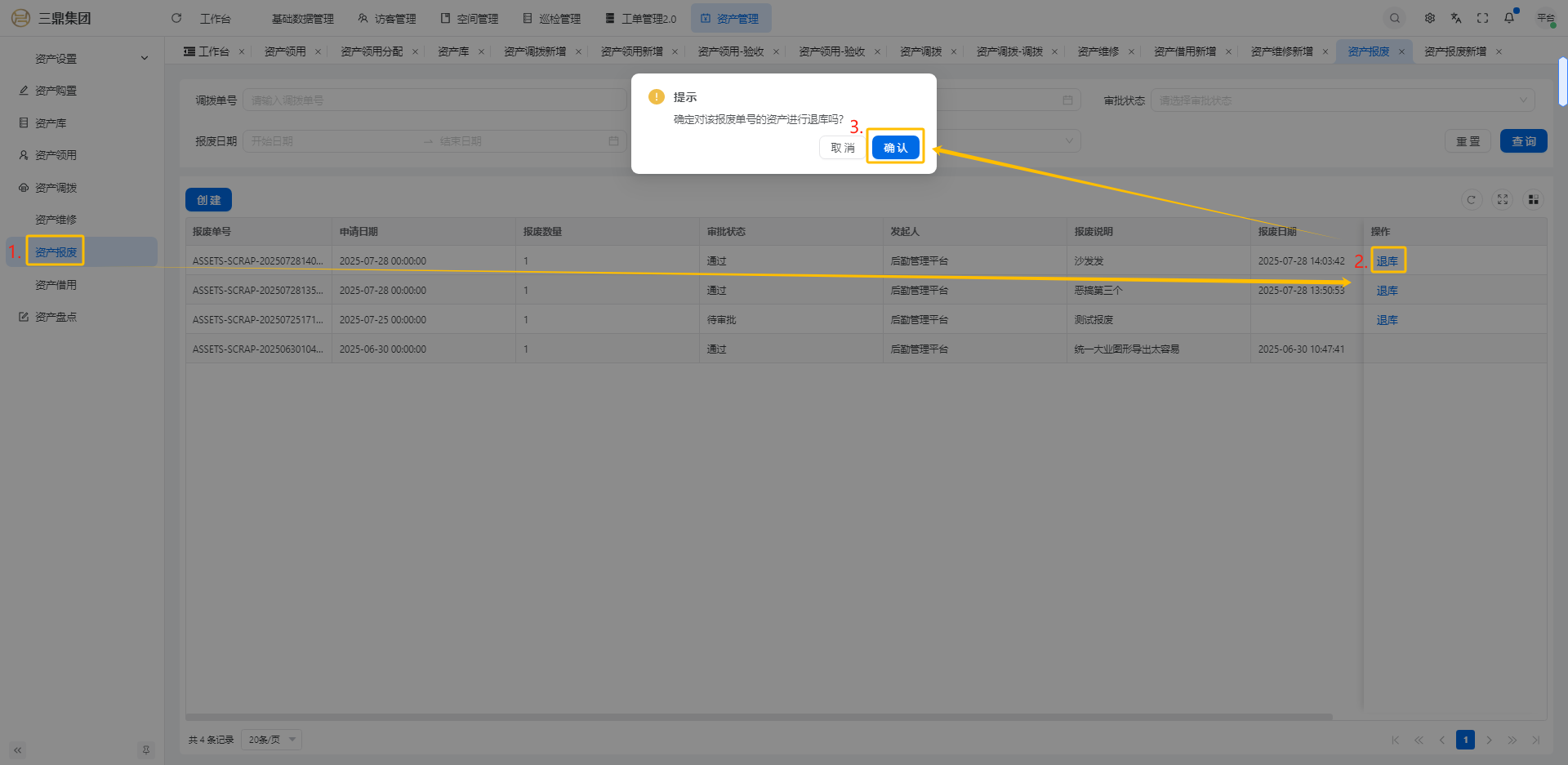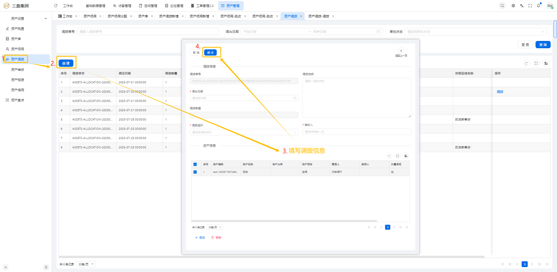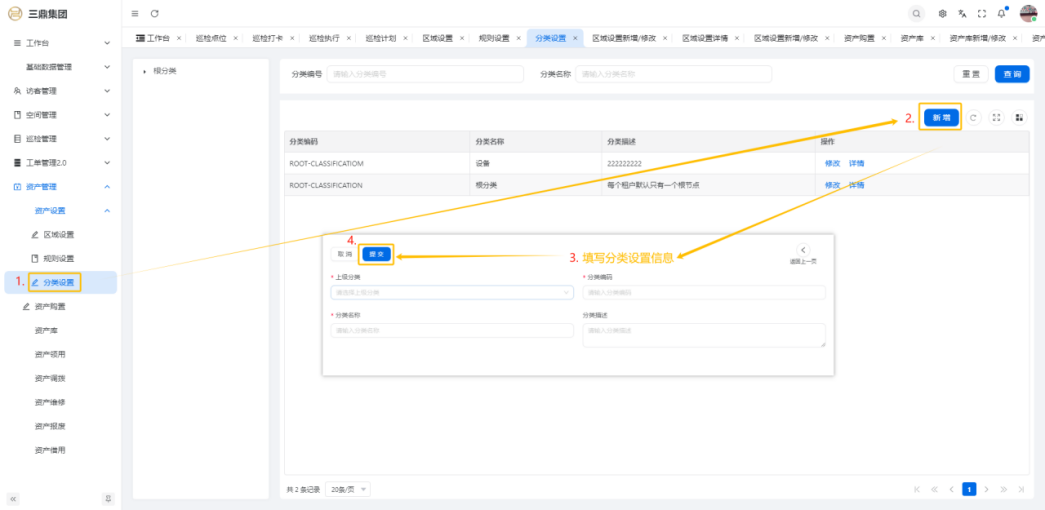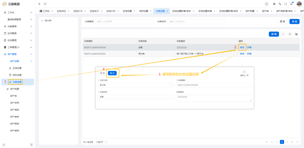 4\. 资产管理 4\.1资产设置 4\.1\.1区域设置 * 新增区域设置  * 查看区域设置详情  * 修改区域设置信息  4\.1\.2规则设置  4\.1\.3分类设置 * 新增分类设置  * 查看分类设置详情  * 修改分类设置  4\.2资产购置 4\.2\.1新增资产购置  4\.2\.2完成采购 审批通过后,可以进行完成采购操作。  4\.2\.3入库 购置资产采购完成后方可进行入库操作,数据同步到资产库列表。  4\.3资产库 4\.3\.1新增资产  4\.3\.2新增调拨 新增调拨成功后,数据同步到资产调拨页面列表。  4\.3\.3新增维修 新增维修成功后,数据同步到资产维修页面列表。  4\.3\.4新增报废 新增报废成功后,数据同步到资产报废页面列表。  4\.3\.5新增借用 新增借用成功后,数据同步到资产借用页面列表。  4\.3\.6新增领用 新增借用成功后,数据同步到资产借用页面列表。  4\.3\.7查看资产库详情  4\.3\.8修改资产库详情  4\.3\.9查看资产库生命周期  4\.4资产领用 4\.4\.1新增资产领用 **** 4\.4\.2资产分配 资产领用审批通过后,分配相应资产被领用。  4\.4\.3资产退还  4\.4\.4资产验收 验收退还的资产。  4\.5资产调拨 4\.5\.1创建调拨申请  4\.5\.2调拨 调拨申请审核通过后,点击调拨,表单选择存放区域,提交即可。  4\.6资产维修 4\.6\.1创建资产维修  4\.6\.2完成工单 审批通过后,点击完成工单。  4\.6\.3验收 工单完成后,可对其进行验收。  4\.7资产报废 4\.7\.1资产报废申请  4\.7\.2资产退库 报废审核通过后,可进行退库操作。  4\.8资产借用 4\.8\.1资产借用申请  4\.8\.2资产归还 借用申请审核通过,使用后进行归还。  4\.8\.3资产验收 对退还的资产进行验收。  4\.9资产盘点