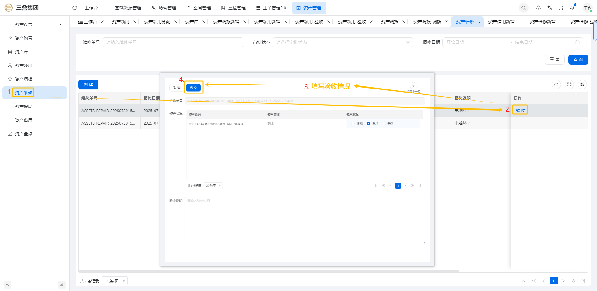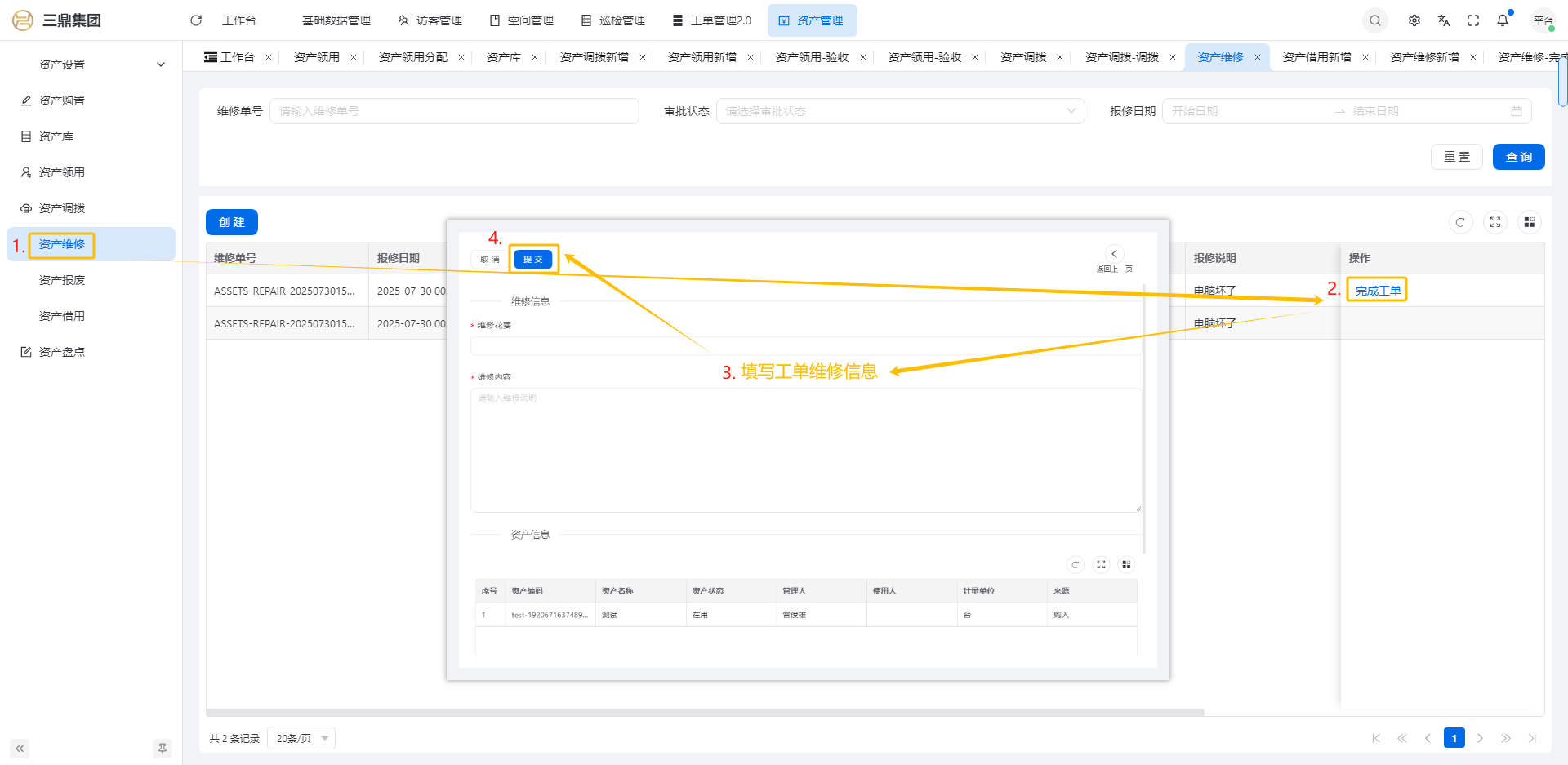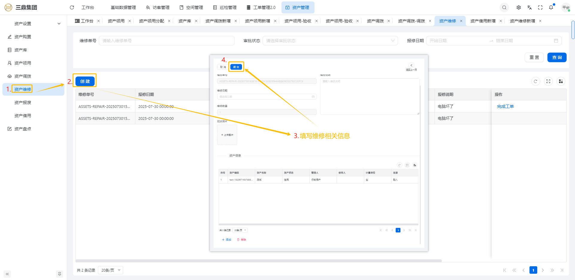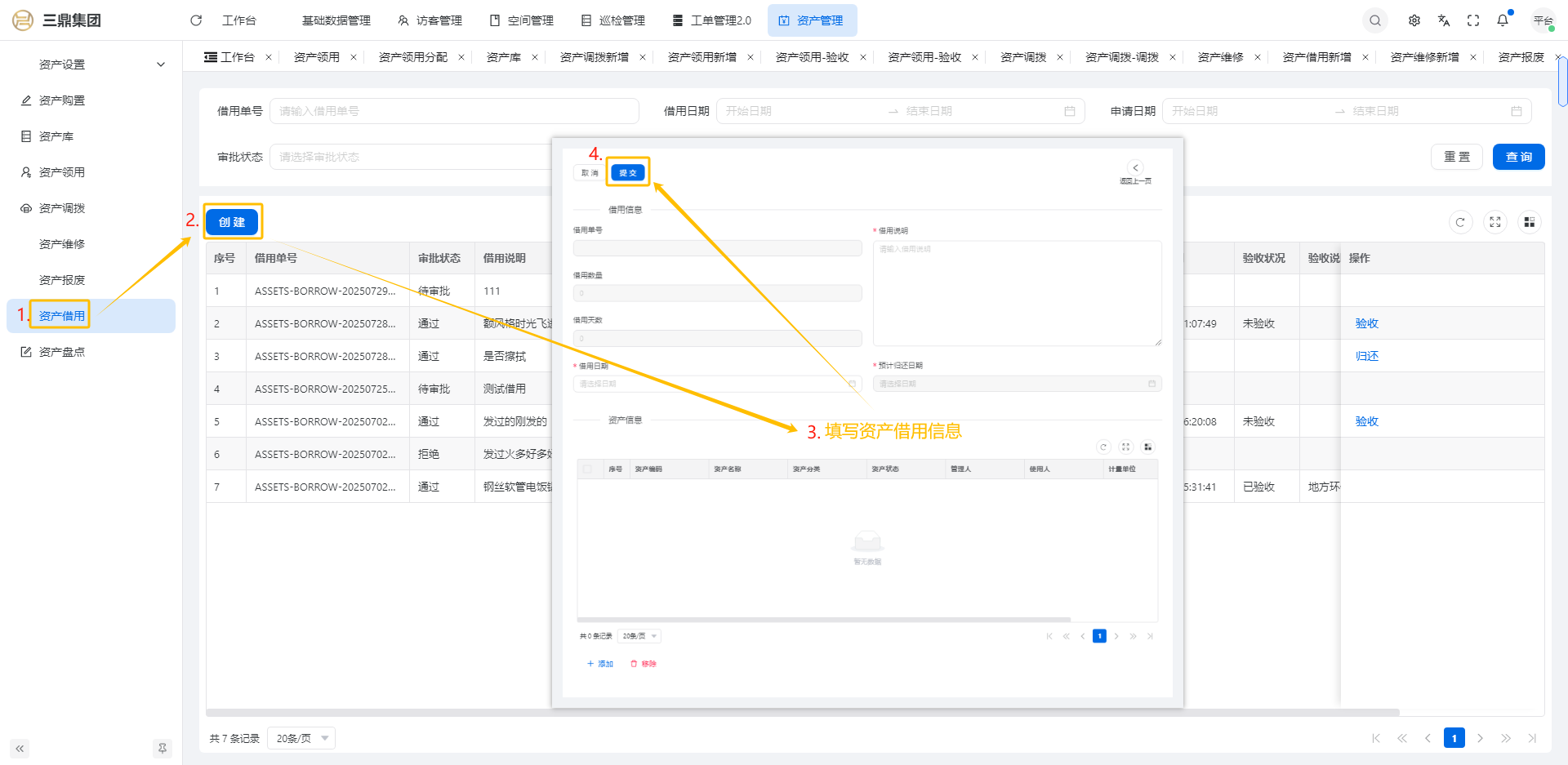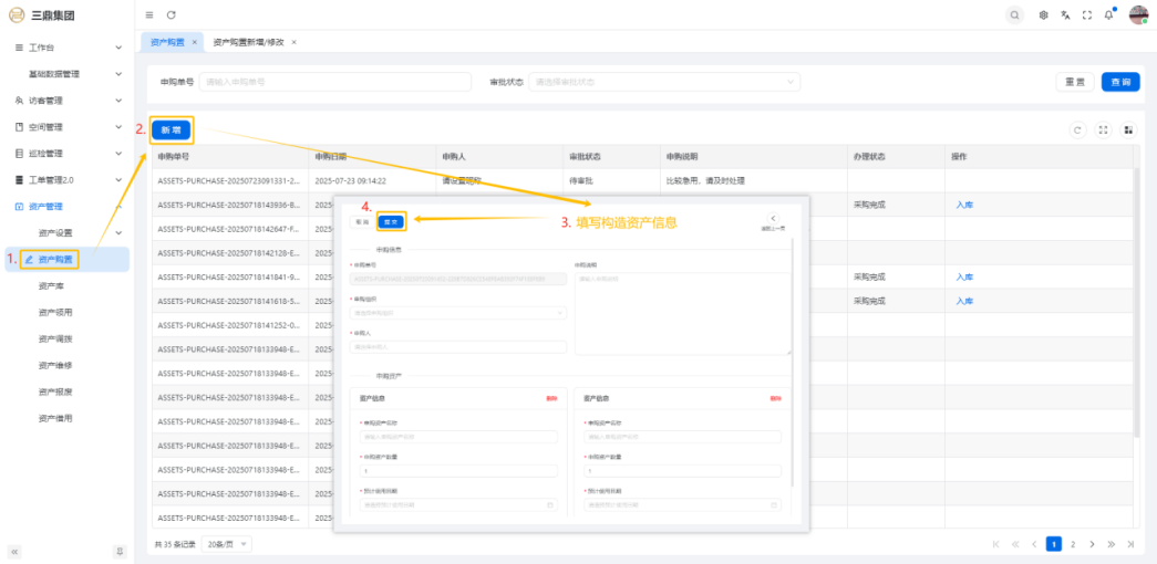 4\. 资产管理 4\.1资产设置 4\.1\.1区域设置 * 新增区域设置  * 查看区域设置详情  * 修改区域设置信息  4\.1\.2规则设置  4\.1\.3分类设置 * 新增分类设置  * 查看分类设置详情  * 修改分类设置  4\.2资产购置 4\.2\.1新增资产购置  4\.2\.2完成采购 审批通过后,可以进行完成采购操作。  4\.2\.3入库 购置资产采购完成后方可进行入库操作,数据同步到资产库列表。  4\.3资产库 4\.3\.1新增资产  4\.3\.2新增调拨 新增调拨成功后,数据同步到资产调拨页面列表。  4\.3\.3新增维修 新增维修成功后,数据同步到资产维修页面列表。  4\.3\.4新增报废 新增报废成功后,数据同步到资产报废页面列表。  4\.3\.5新增借用 新增借用成功后,数据同步到资产借用页面列表。  4\.3\.6新增领用 新增借用成功后,数据同步到资产借用页面列表。  4\.3\.7查看资产库详情  4\.3\.8修改资产库详情  4\.3\.9查看资产库生命周期  4\.4资产领用 4\.4\.1新增资产领用 **** 4\.4\.2资产分配 资产领用审批通过后,分配相应资产被领用。  4\.4\.3资产退还  4\.4\.4资产验收 验收退还的资产。  4\.5资产调拨 4\.5\.1创建调拨申请  4\.5\.2调拨 调拨申请审核通过后,点击调拨,表单选择存放区域,提交即可。  4\.6资产维修 4\.6\.1创建资产维修  4\.6\.2完成工单 审批通过后,点击完成工单。  4\.6\.3验收 工单完成后,可对其进行验收。  4\.7资产报废 4\.7\.1资产报废申请  4\.7\.2资产退库 报废审核通过后,可进行退库操作。  4\.8资产借用 4\.8\.1资产借用申请  4\.8\.2资产归还 借用申请审核通过,使用后进行归还。  4\.8\.3资产验收 对退还的资产进行验收。  4\.9资产盘点