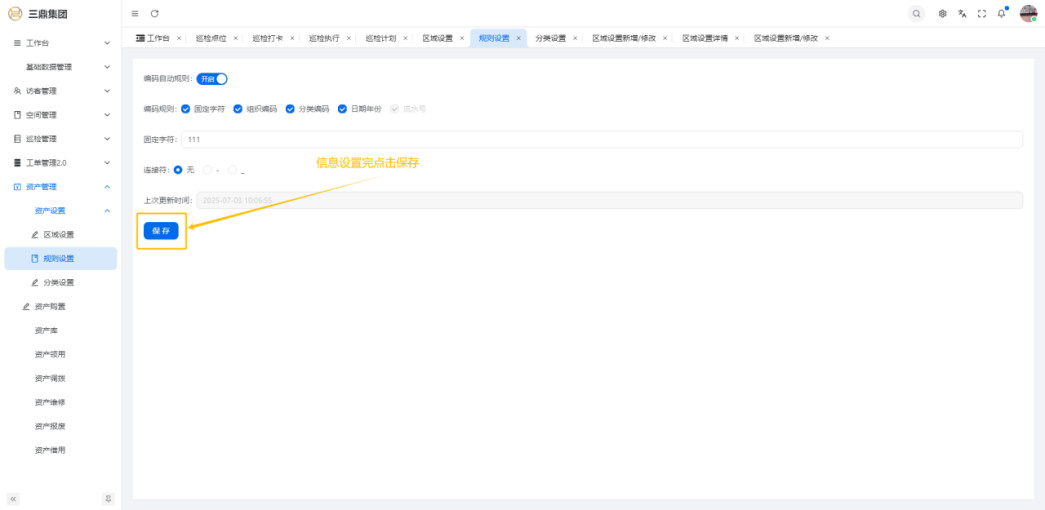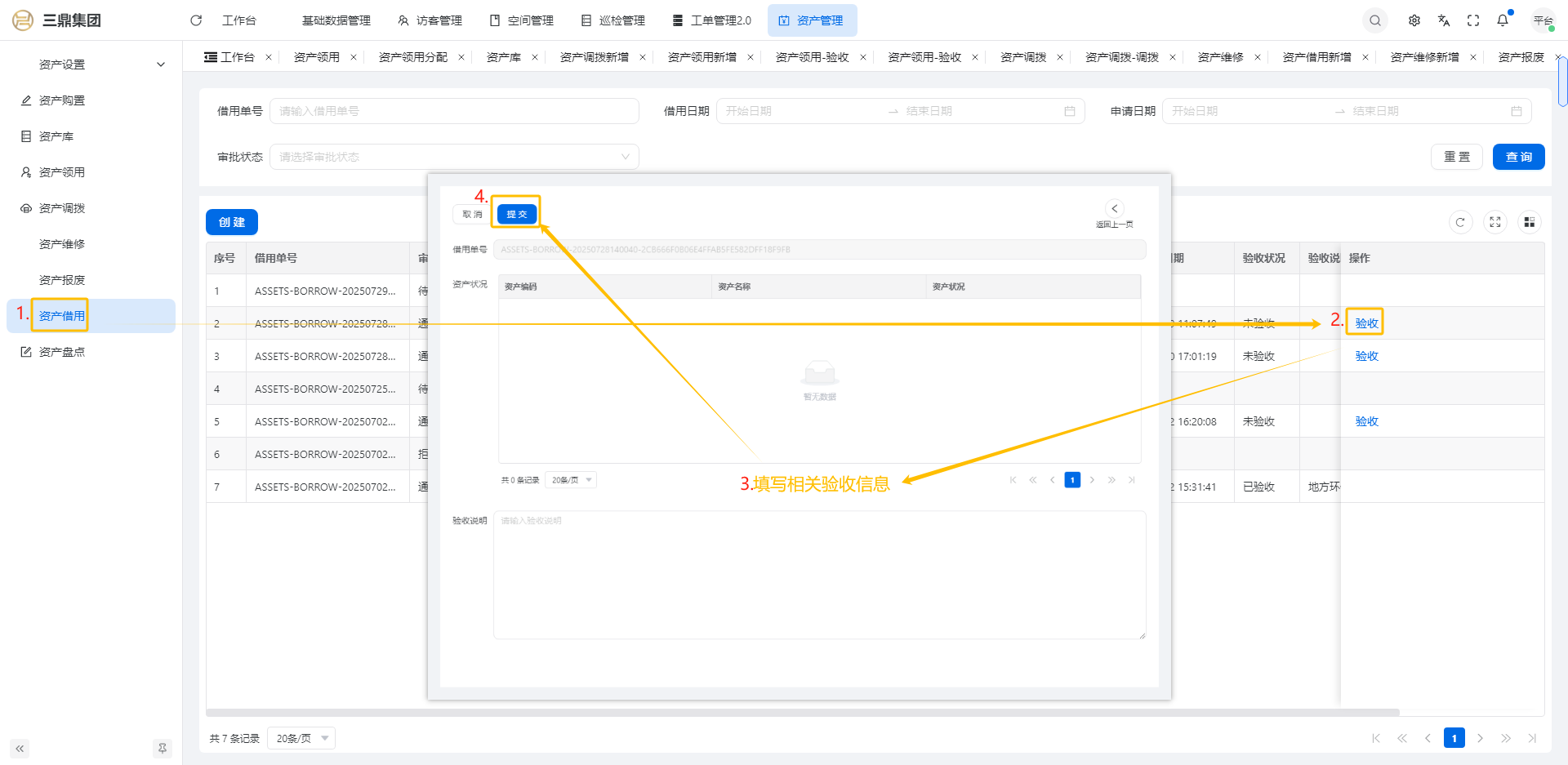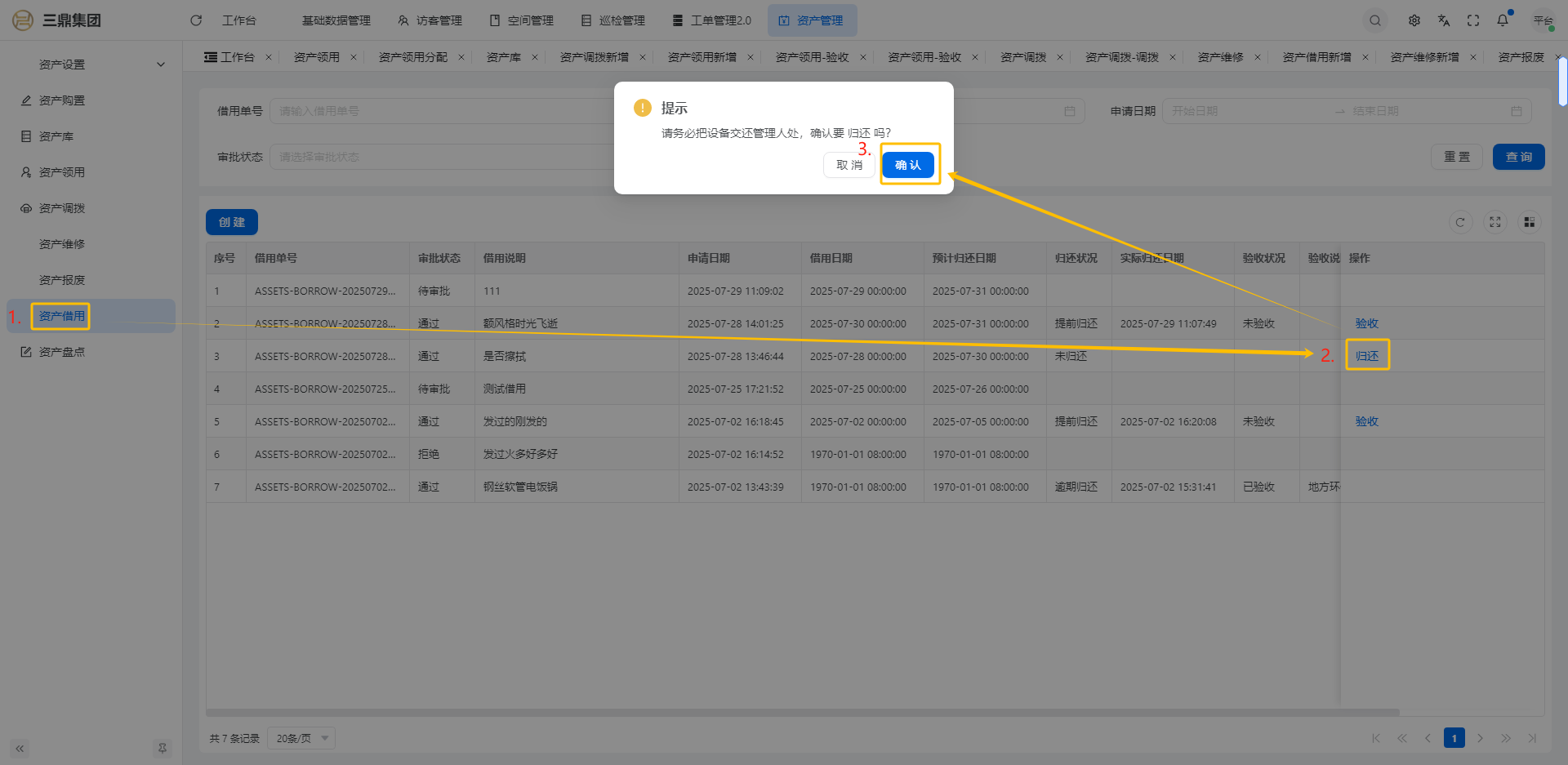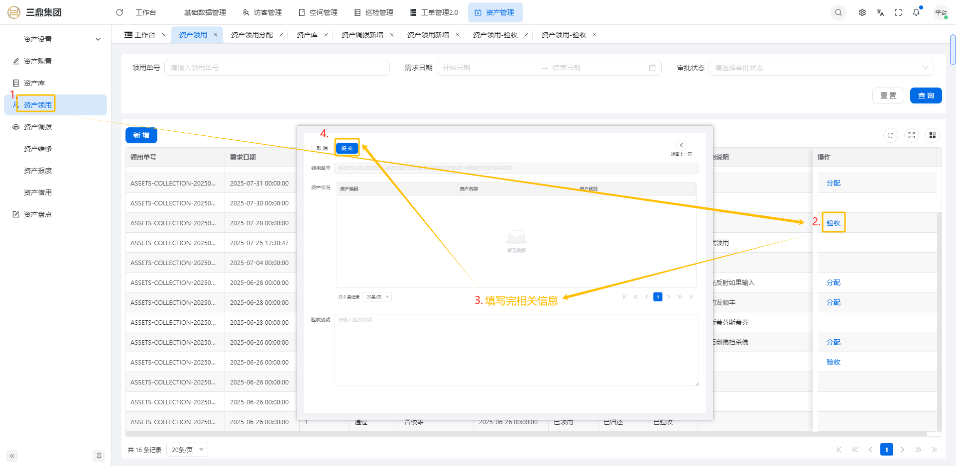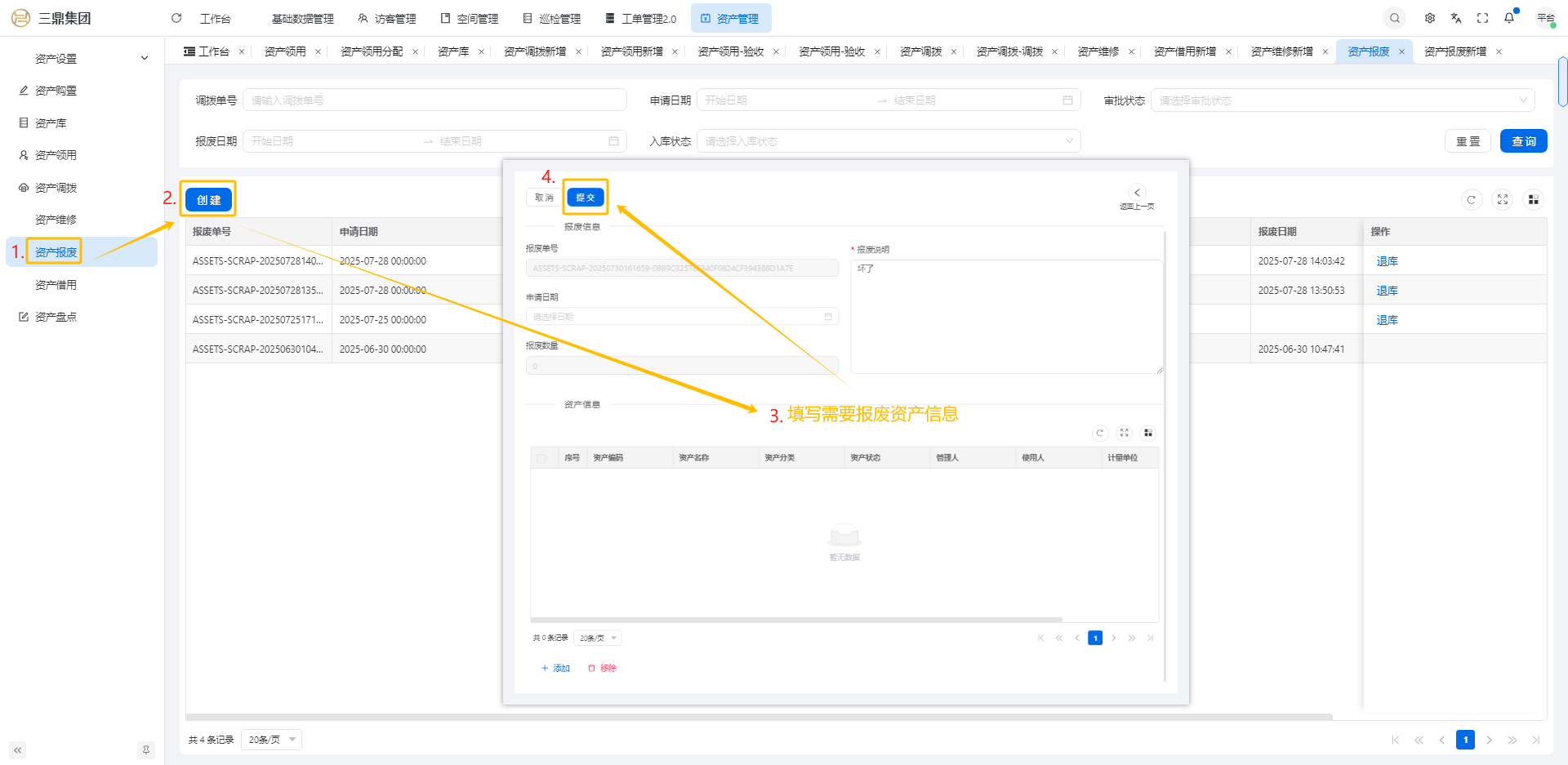 4\. 资产管理 4\.1资产设置 4\.1\.1区域设置 * 新增区域设置  * 查看区域设置详情  * 修改区域设置信息  4\.1\.2规则设置  4\.1\.3分类设置 * 新增分类设置  * 查看分类设置详情  * 修改分类设置  4\.2资产购置 4\.2\.1新增资产购置  4\.2\.2完成采购 审批通过后,可以进行完成采购操作。  4\.2\.3入库 购置资产采购完成后方可进行入库操作,数据同步到资产库列表。  4\.3资产库 4\.3\.1新增资产  4\.3\.2新增调拨 新增调拨成功后,数据同步到资产调拨页面列表。  4\.3\.3新增维修 新增维修成功后,数据同步到资产维修页面列表。  4\.3\.4新增报废 新增报废成功后,数据同步到资产报废页面列表。  4\.3\.5新增借用 新增借用成功后,数据同步到资产借用页面列表。  4\.3\.6新增领用 新增借用成功后,数据同步到资产借用页面列表。  4\.3\.7查看资产库详情  4\.3\.8修改资产库详情  4\.3\.9查看资产库生命周期  4\.4资产领用 4\.4\.1新增资产领用 **** 4\.4\.2资产分配 资产领用审批通过后,分配相应资产被领用。  4\.4\.3资产退还  4\.4\.4资产验收 验收退还的资产。  4\.5资产调拨 4\.5\.1创建调拨申请  4\.5\.2调拨 调拨申请审核通过后,点击调拨,表单选择存放区域,提交即可。  4\.6资产维修 4\.6\.1创建资产维修  4\.6\.2完成工单 审批通过后,点击完成工单。  4\.6\.3验收 工单完成后,可对其进行验收。  4\.7资产报废 4\.7\.1资产报废申请  4\.7\.2资产退库 报废审核通过后,可进行退库操作。  4\.8资产借用 4\.8\.1资产借用申请  4\.8\.2资产归还 借用申请审核通过,使用后进行归还。  4\.8\.3资产验收 对退还的资产进行验收。  4\.9资产盘点