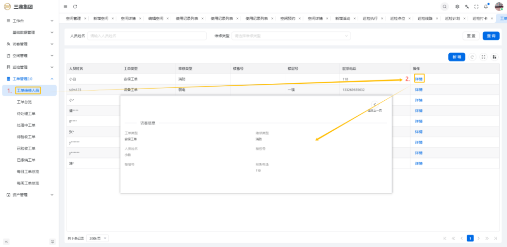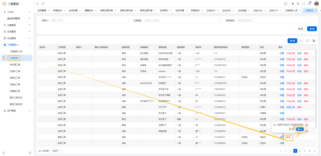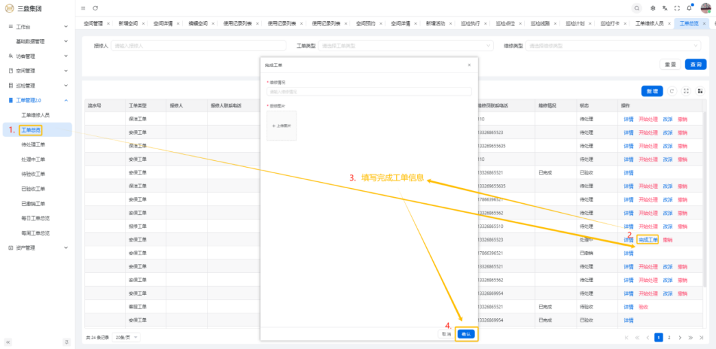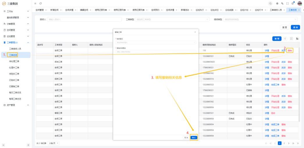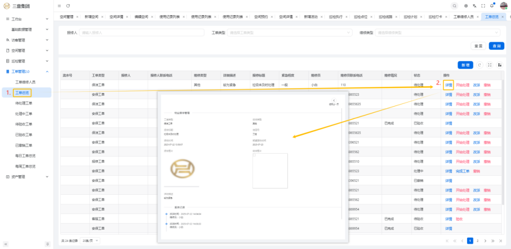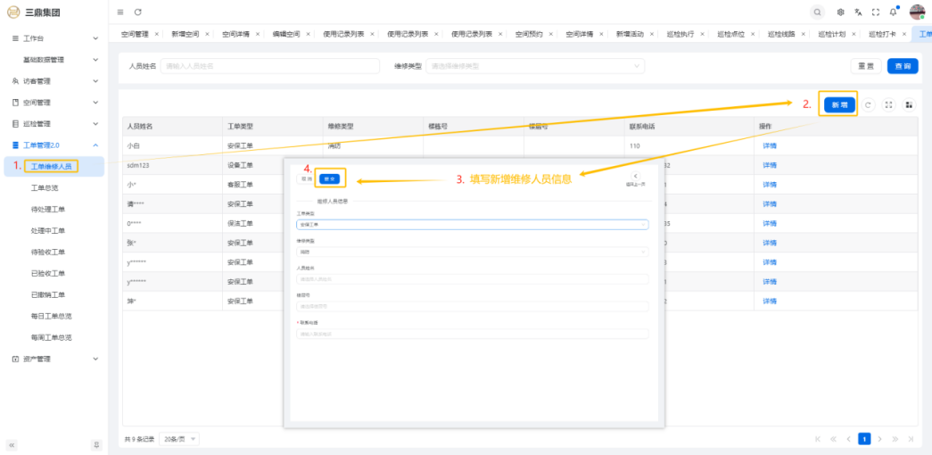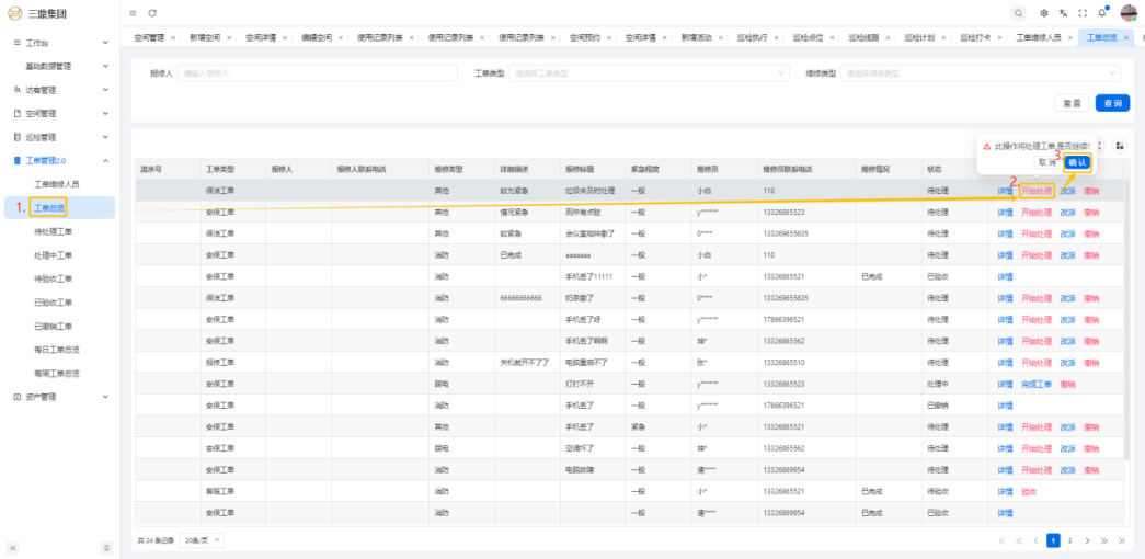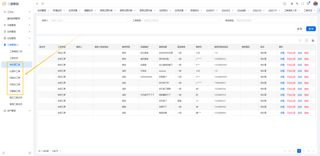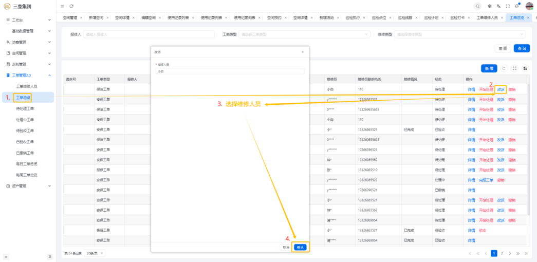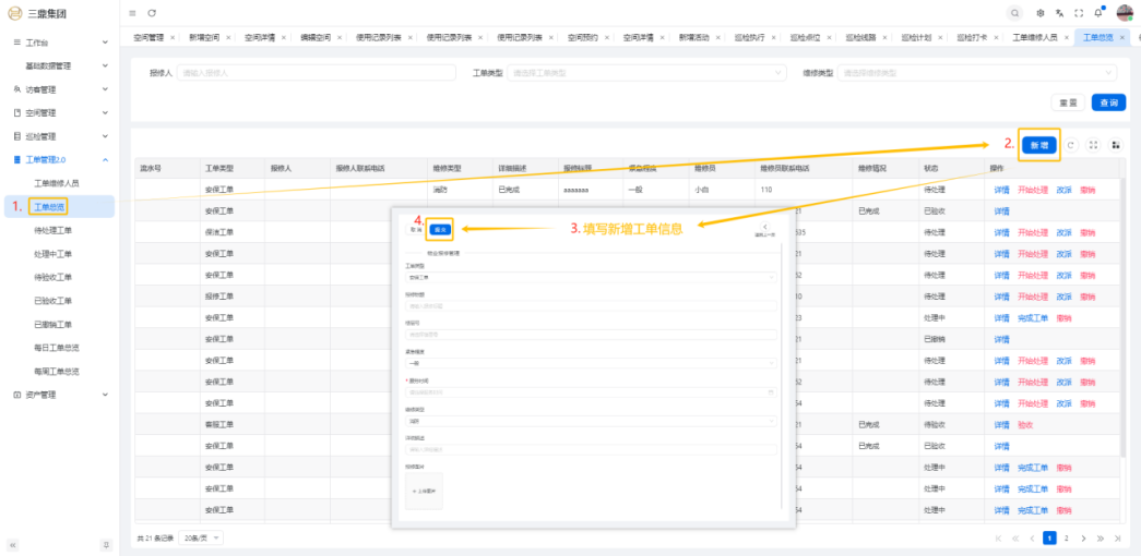 7\.工单管理 7\.1工单维修人员 7\.1\.1维修人员信息录入  7\.1\.2维修人员详情信息  7\.2工单总览 7\.2\.1新增工单 新增工单后,生成一条“未处理”工单,数据同步到待处理工单列表。  7\.2\.2撤销报修工单 可对待处理/处理中的工单进行撤销,数据同步到已撤销工单列表。  7\.2\.3改派工单 可对待处理的工单进行撤销。  7\.2\.4开始处理工单 点击开始工单后,工单状态从“待处理”变为“处理中”,待处理工单列表该条数据同步到处理中工单列表。 7\.2\.5完成工单 对处理中的工单进行完成工单操作,工单状态从“处理中”变成“待验收”,处理中工单列表该条数据同步到待验收工单列表。  7\.2\.6验收报修工单 维修完成后,对“待验收”的工单进行验收操作,待验收工单列表该条数据同步到已验收工单列表。  7\.2\.7查看工单详情  7\.3工单(待处理、处理中、待验收、已验收、已撤销) 下图所圈页面,操作类似如上: