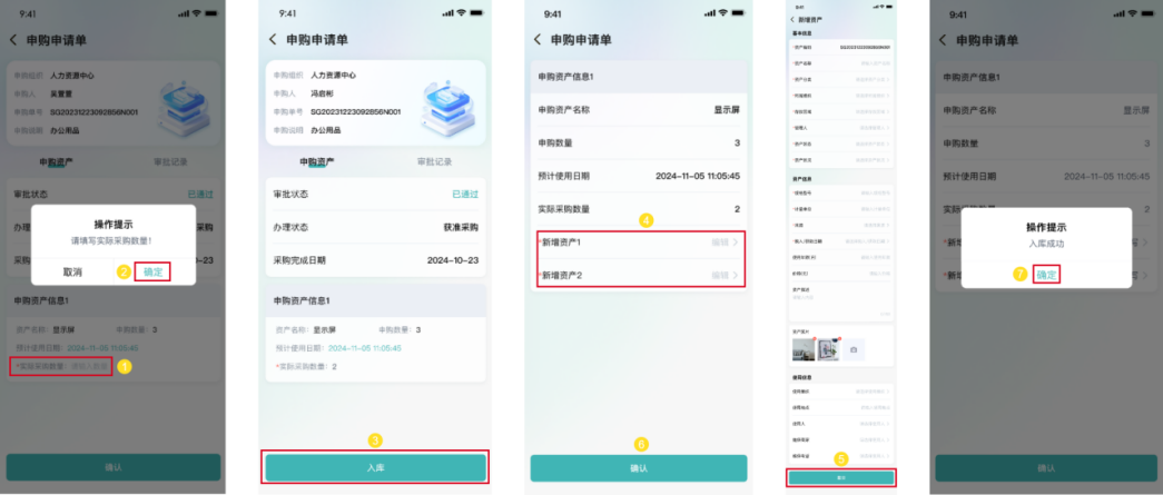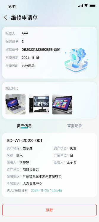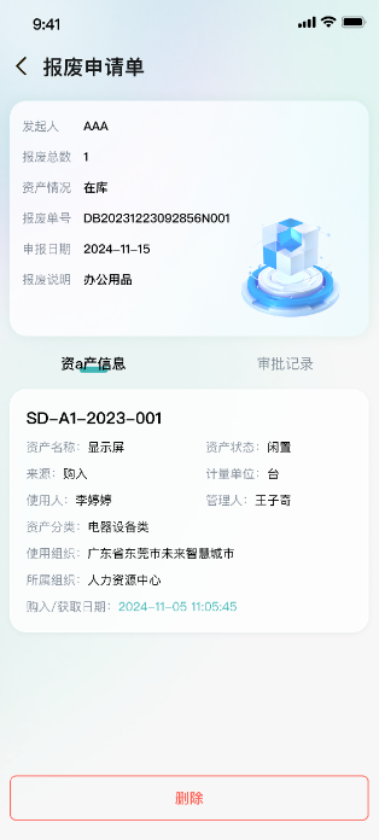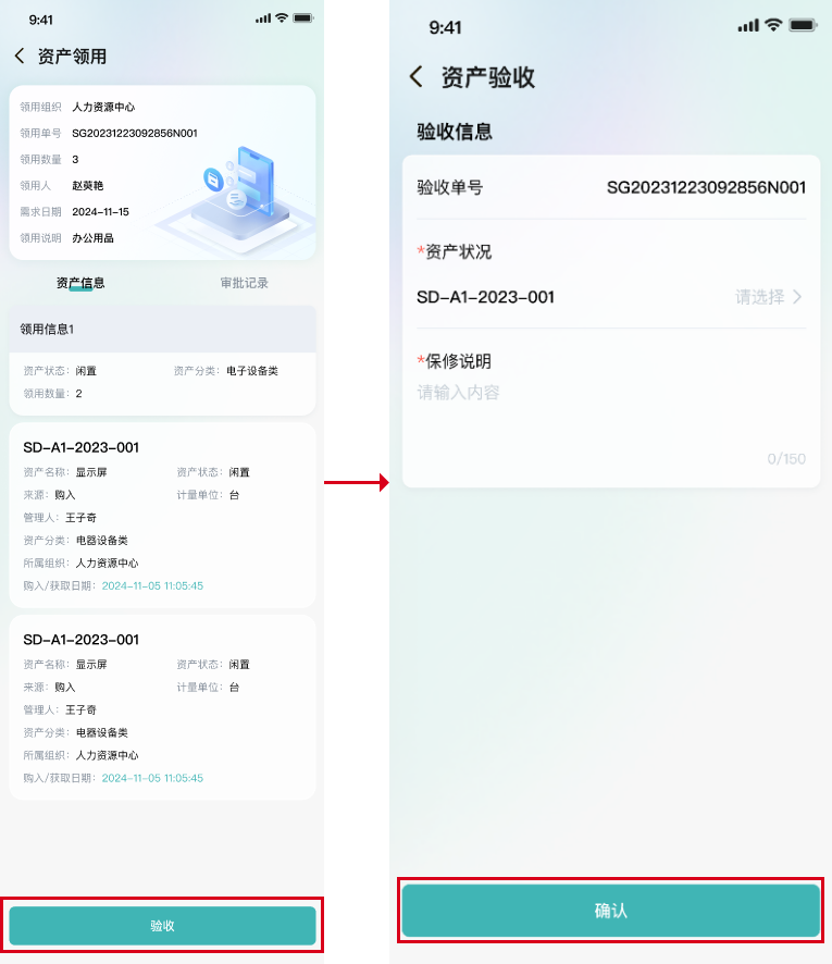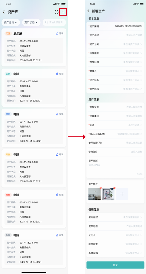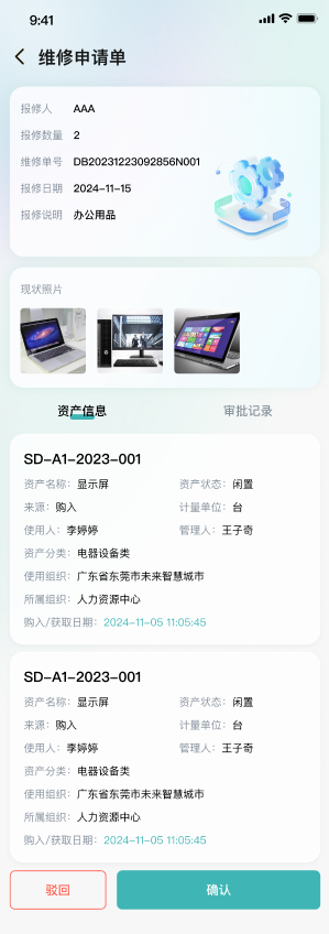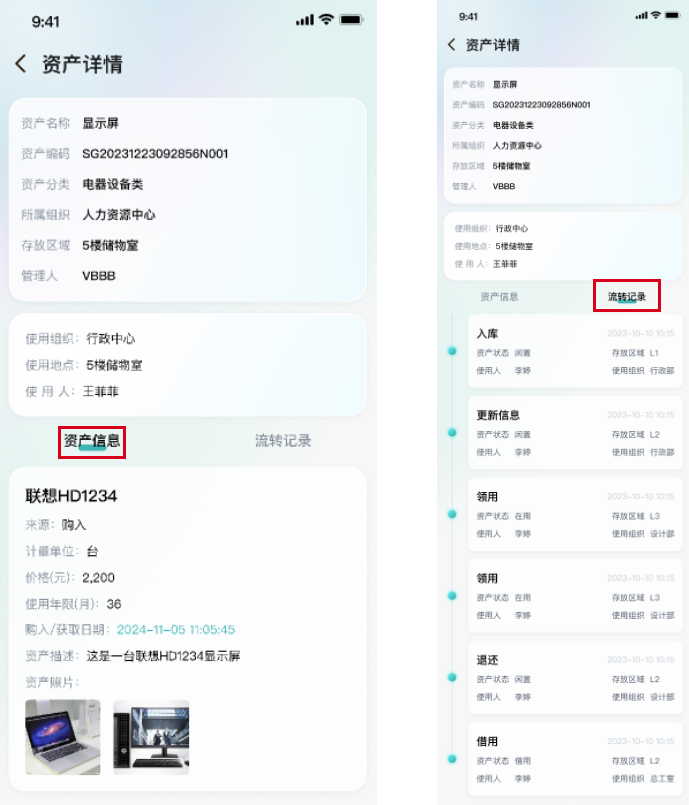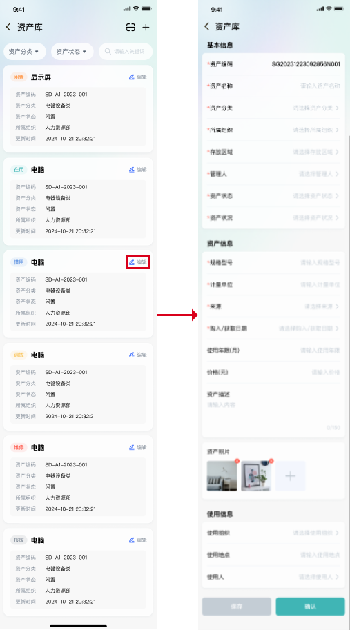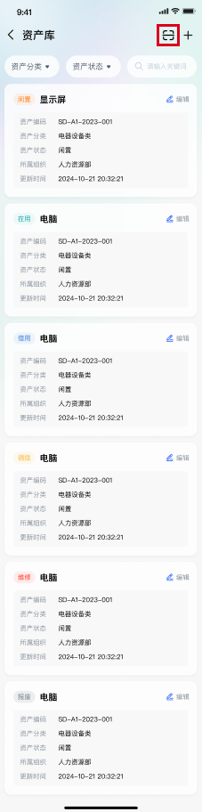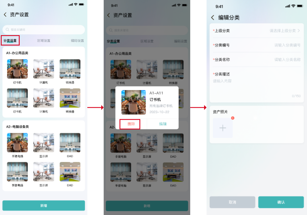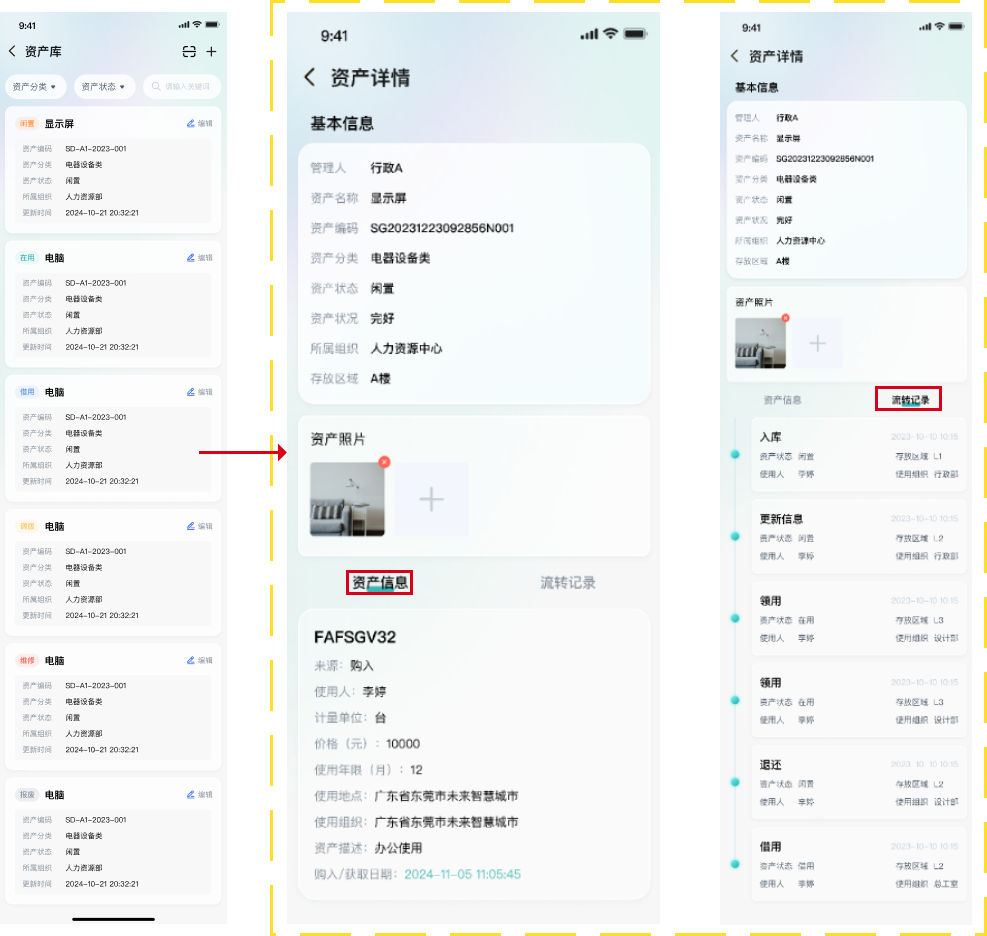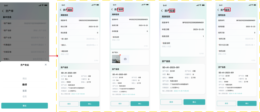 4\. 资产管理 4\.1资产设置 进入路径:  4\.1\.1新增资产分类  4\.1\.2编辑资产分类  4\.1\.3删除资产分类  4\.1\.4新增资产区域  4\.1\.5编辑资产区域  4\.1\.6删除资产区域  4\.1\.7资产编码设置  4\.2资产库 进入路径:  4\.2\.1资产入库 【闲置】状态下无使用信息 【在用】状态下有使用信息  4\.2\.2资产扫码入库  4\.2\.3资产编辑  4\.2\.4查看资产详情  4\.2\.5资产发起 进入路径:  可发起调拨、维修、报废、借用  4\.3资产购置 进入路径:  4\.3\.1新增资产购置  4\.3\.2查看资产购置详情 普通用户只能对资产进行查看  以下是管理员身份,除了查看外,还能对资产进行驳回、删除、入库操作。 驳回、删除申购申请。  已通过申购申请进行确认采购数量后方可入库,点击入库后填写具体购置新增资产信息。  4\.4资产调拨 进入路径:  4\.4\.1资产调拨申请  4\.4\.2确认调拨存放区域 接收人对调拨申请进行查看并对已通过的调拨申请确认存放区域。  以下是管理员身份,能对调拨申请进行驳回、删除操作。  4\.5资产领用 进入路径:  4\.5\.1资产领用申请  4\.5\.2查看资产申请领用详情(普通用户)  4\.5\.3驳回资产领用申请(管理员)  4\.5\.4资产分配(管理员)  4\.5\.5资产领用(领用人) 对已通过/已分配的资产领用申请,进行领用。  4\.5\.6退还资产(领用人)  4\.5\.7验收资产(管理员) 验收退还的资产。  4\.6资产借用 进入路径:  4\.6\.1资产借用申请  4\.6\.2查看资产借用申请详情(普通用户)  4\.6\.3删除资产借用申请(管理员) 管理员可对已驳回的资产借用申请进行删除。  4\.6\.4归还资产 借用人归还借用资产。  4\.6\.5验收资产 管理人验收借用资产。  4\.7资产维修 进入路径:  4\.7\.1资产维修申请  4\.7\.2资产维修编辑  4\.7\.3资产维修审批  4\.7\.4资产维修删除 管理员可对已驳回的资产维修申请进行删除。  4\.7\.5填写维修信息 维修人员完成维修后填写维修信息  4\.7\.2验收资产 申请人验收资产  4\.8资产报废 进入路径:  4\.8\.1资产报废申请  4\.8\.2资产报废审批  4\.8\.3资产维修删除 管理员可对已驳回的资产报废申请进行删除。  4\.8\.4资产退库 发起人可对已通过报废申请的资产进行退库,退库后该部分资产记录到退库资产列表。  4\.9资产盘点 4\.10退库资产 进入路径:  4\.10\.1资产还原  4\.10\.1查看退库资产详情