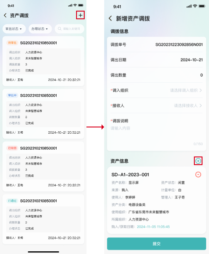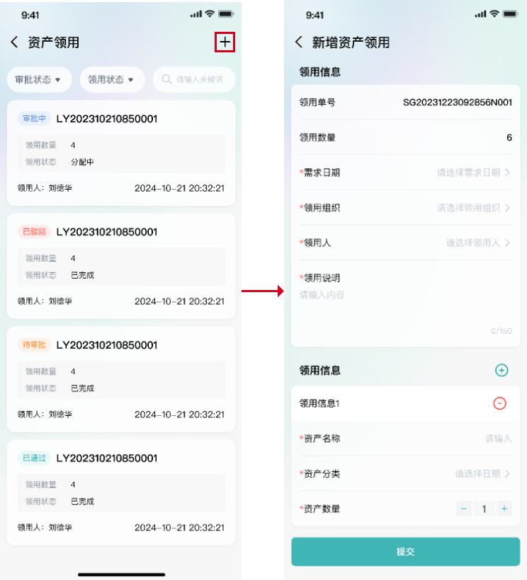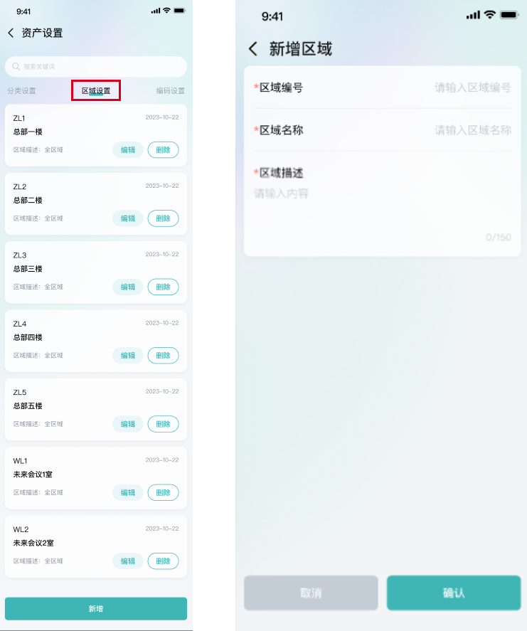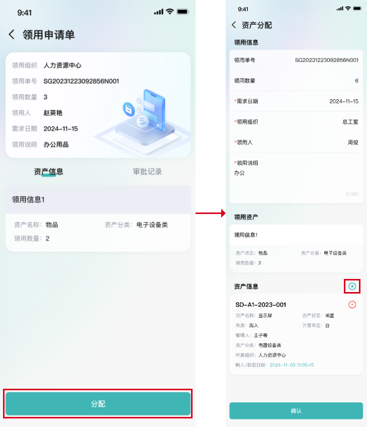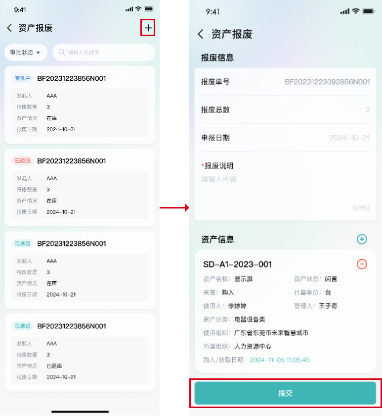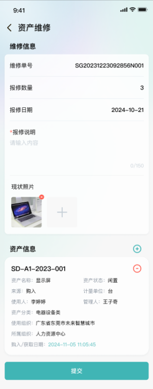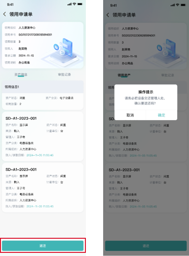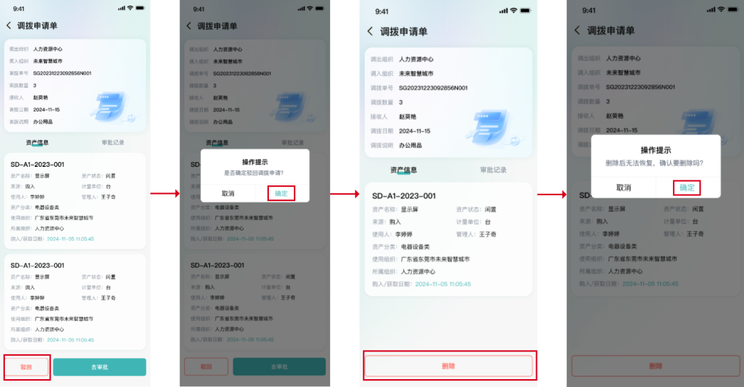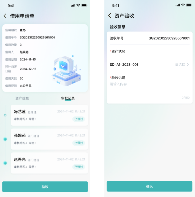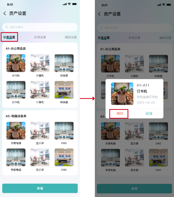 4\. 资产管理 4\.1资产设置 进入路径:  4\.1\.1新增资产分类  4\.1\.2编辑资产分类  4\.1\.3删除资产分类  4\.1\.4新增资产区域  4\.1\.5编辑资产区域  4\.1\.6删除资产区域  4\.1\.7资产编码设置  4\.2资产库 进入路径:  4\.2\.1资产入库 【闲置】状态下无使用信息 【在用】状态下有使用信息  4\.2\.2资产扫码入库  4\.2\.3资产编辑  4\.2\.4查看资产详情  4\.2\.5资产发起 进入路径:  可发起调拨、维修、报废、借用  4\.3资产购置 进入路径:  4\.3\.1新增资产购置  4\.3\.2查看资产购置详情 普通用户只能对资产进行查看  以下是管理员身份,除了查看外,还能对资产进行驳回、删除、入库操作。 驳回、删除申购申请。  已通过申购申请进行确认采购数量后方可入库,点击入库后填写具体购置新增资产信息。  4\.4资产调拨 进入路径:  4\.4\.1资产调拨申请  4\.4\.2确认调拨存放区域 接收人对调拨申请进行查看并对已通过的调拨申请确认存放区域。  以下是管理员身份,能对调拨申请进行驳回、删除操作。  4\.5资产领用 进入路径:  4\.5\.1资产领用申请  4\.5\.2查看资产申请领用详情(普通用户)  4\.5\.3驳回资产领用申请(管理员)  4\.5\.4资产分配(管理员)  4\.5\.5资产领用(领用人) 对已通过/已分配的资产领用申请,进行领用。  4\.5\.6退还资产(领用人)  4\.5\.7验收资产(管理员) 验收退还的资产。  4\.6资产借用 进入路径:  4\.6\.1资产借用申请  4\.6\.2查看资产借用申请详情(普通用户)  4\.6\.3删除资产借用申请(管理员) 管理员可对已驳回的资产借用申请进行删除。  4\.6\.4归还资产 借用人归还借用资产。  4\.6\.5验收资产 管理人验收借用资产。  4\.7资产维修 进入路径:  4\.7\.1资产维修申请  4\.7\.2资产维修编辑  4\.7\.3资产维修审批  4\.7\.4资产维修删除 管理员可对已驳回的资产维修申请进行删除。  4\.7\.5填写维修信息 维修人员完成维修后填写维修信息  4\.7\.2验收资产 申请人验收资产  4\.8资产报废 进入路径:  4\.8\.1资产报废申请  4\.8\.2资产报废审批  4\.8\.3资产维修删除 管理员可对已驳回的资产报废申请进行删除。  4\.8\.4资产退库 发起人可对已通过报废申请的资产进行退库,退库后该部分资产记录到退库资产列表。  4\.9资产盘点 4\.10退库资产 进入路径:  4\.10\.1资产还原  4\.10\.1查看退库资产详情