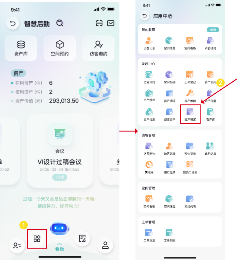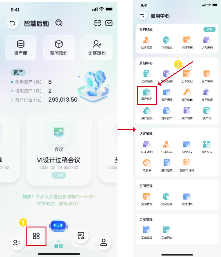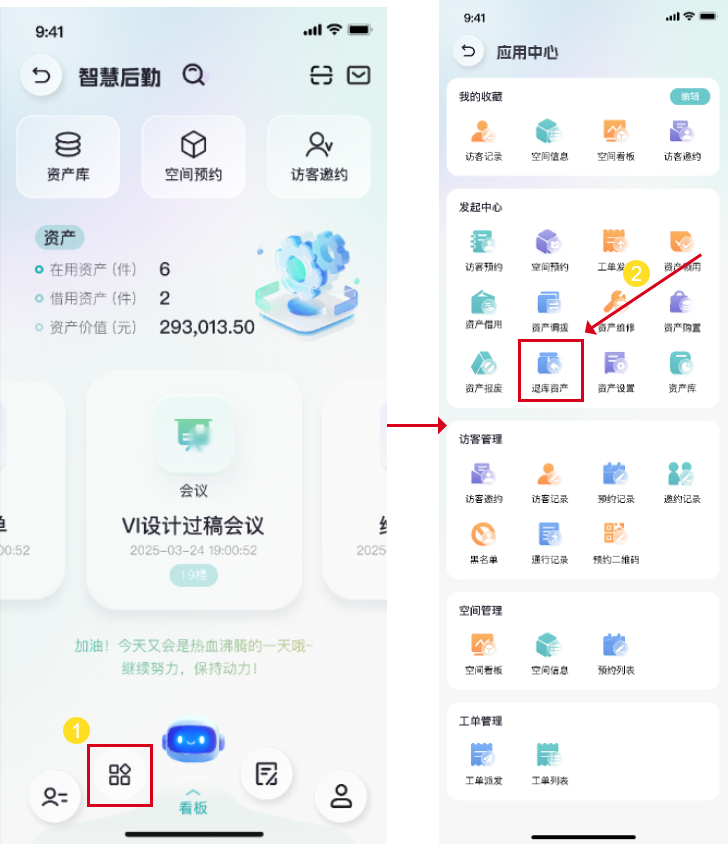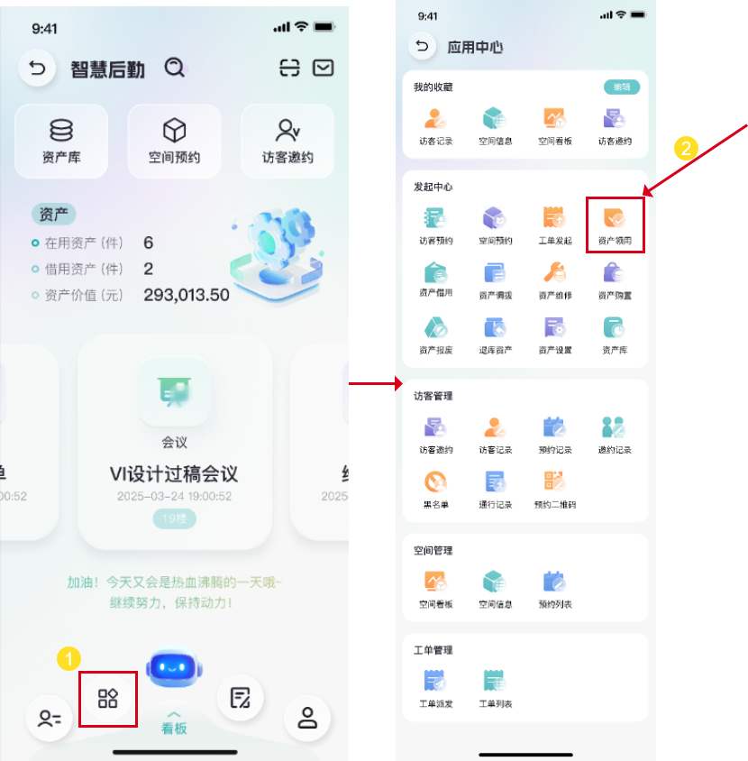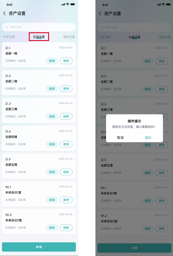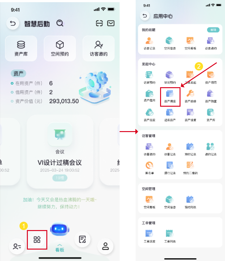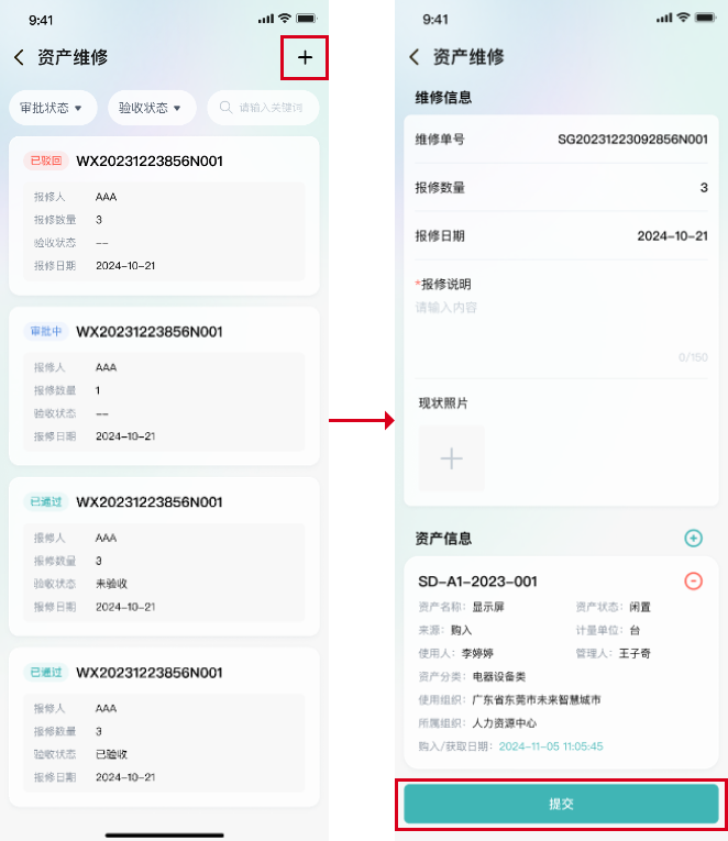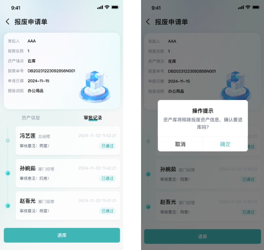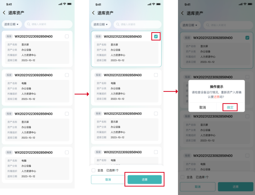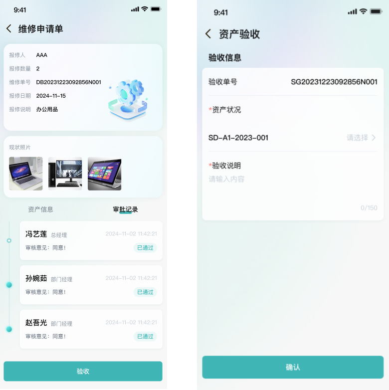 4\. 资产管理 4\.1资产设置 进入路径:  4\.1\.1新增资产分类  4\.1\.2编辑资产分类  4\.1\.3删除资产分类  4\.1\.4新增资产区域  4\.1\.5编辑资产区域  4\.1\.6删除资产区域  4\.1\.7资产编码设置  4\.2资产库 进入路径:  4\.2\.1资产入库 【闲置】状态下无使用信息 【在用】状态下有使用信息  4\.2\.2资产扫码入库  4\.2\.3资产编辑  4\.2\.4查看资产详情  4\.2\.5资产发起 进入路径:  可发起调拨、维修、报废、借用  4\.3资产购置 进入路径:  4\.3\.1新增资产购置  4\.3\.2查看资产购置详情 普通用户只能对资产进行查看  以下是管理员身份,除了查看外,还能对资产进行驳回、删除、入库操作。 驳回、删除申购申请。  已通过申购申请进行确认采购数量后方可入库,点击入库后填写具体购置新增资产信息。  4\.4资产调拨 进入路径:  4\.4\.1资产调拨申请  4\.4\.2确认调拨存放区域 接收人对调拨申请进行查看并对已通过的调拨申请确认存放区域。  以下是管理员身份,能对调拨申请进行驳回、删除操作。  4\.5资产领用 进入路径:  4\.5\.1资产领用申请  4\.5\.2查看资产申请领用详情(普通用户)  4\.5\.3驳回资产领用申请(管理员)  4\.5\.4资产分配(管理员)  4\.5\.5资产领用(领用人) 对已通过/已分配的资产领用申请,进行领用。  4\.5\.6退还资产(领用人)  4\.5\.7验收资产(管理员) 验收退还的资产。  4\.6资产借用 进入路径:  4\.6\.1资产借用申请  4\.6\.2查看资产借用申请详情(普通用户)  4\.6\.3删除资产借用申请(管理员) 管理员可对已驳回的资产借用申请进行删除。  4\.6\.4归还资产 借用人归还借用资产。  4\.6\.5验收资产 管理人验收借用资产。  4\.7资产维修 进入路径:  4\.7\.1资产维修申请  4\.7\.2资产维修编辑  4\.7\.3资产维修审批  4\.7\.4资产维修删除 管理员可对已驳回的资产维修申请进行删除。  4\.7\.5填写维修信息 维修人员完成维修后填写维修信息  4\.7\.2验收资产 申请人验收资产  4\.8资产报废 进入路径:  4\.8\.1资产报废申请  4\.8\.2资产报废审批  4\.8\.3资产维修删除 管理员可对已驳回的资产报废申请进行删除。  4\.8\.4资产退库 发起人可对已通过报废申请的资产进行退库,退库后该部分资产记录到退库资产列表。  4\.9资产盘点 4\.10退库资产 进入路径:  4\.10\.1资产还原  4\.10\.1查看退库资产详情
