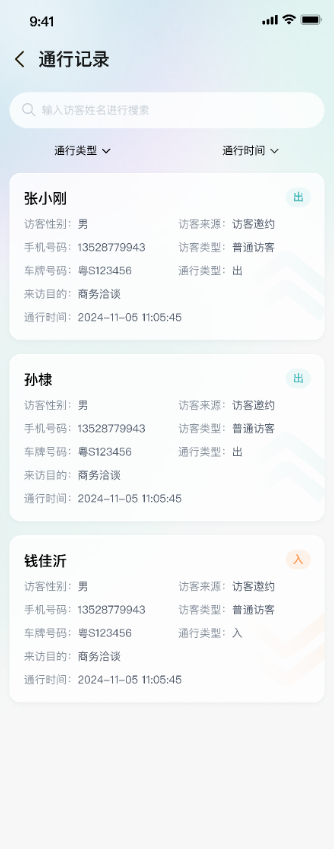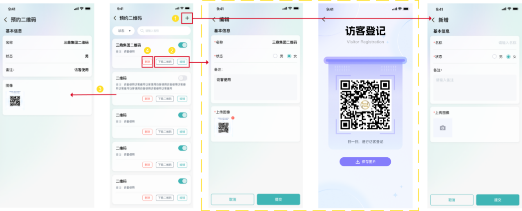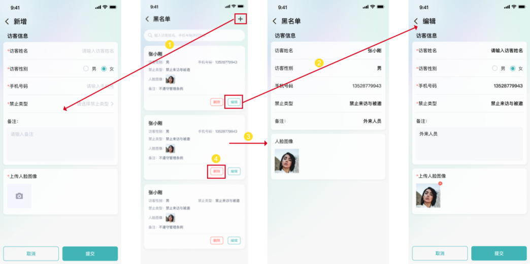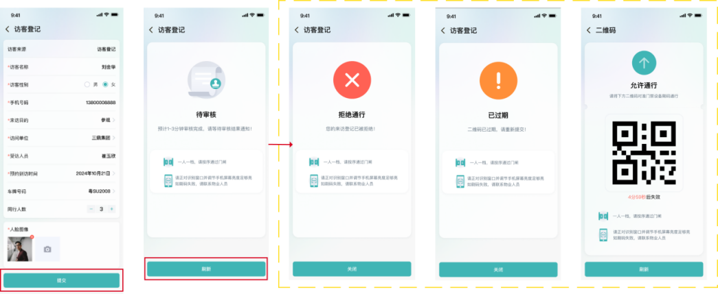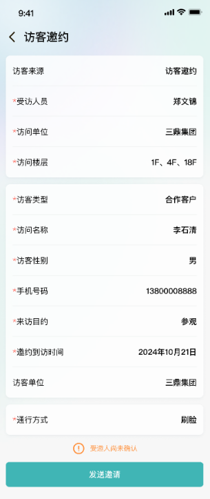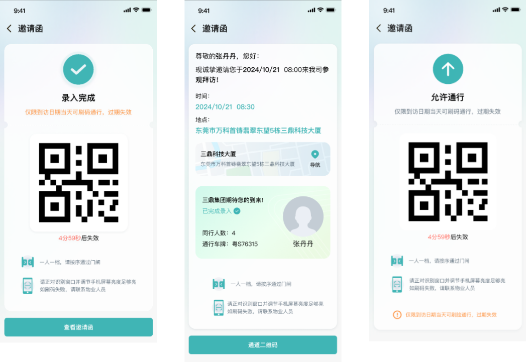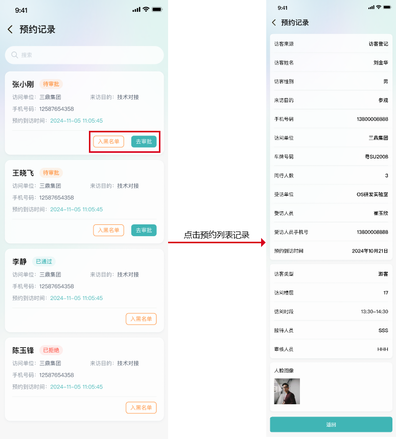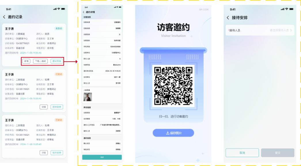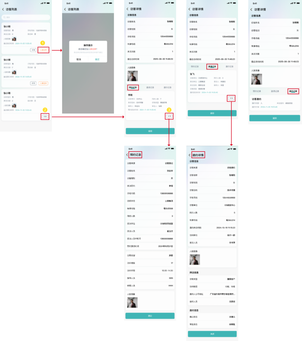 6\.访客管理 6\.1 访客信息 进入路径:  访客列表中查看来访过的所有访客 点击【入黑名单】,禁止访客发起来访申请 点击【详情】,查看访客的基本信息,预约记录,邀请记录,通行记录 点击预约记录中的【详情】,查看访客每次的来访预约信息  6\.2访客邀约 第一条进入路径:应用中心点击访客邀约进入 第二条进入路径:首页扫码进入访客邀约页面  进入访客邀约页面填写好邀约信息,点击【发送邀请】  通过微信或短信,发送URL链接给邀约对象  邀约对象点击打开链接,确认是否应邀  接收方式:点击【接收】邀约,填写出行信息  录入成功,可扫码通行大楼  6\.3 访客登记(访客预约) 第一条进入路径:应用中心点击访客预约进入 第二条进入路径:首页扫码进入访客预约页面  普通用户:到访人员填写登记信息,点击提交可查看到该事项审核情况。如果审核通过,系统生成通行码,扫码即可通行。  内部人员:给到访人员登记信息,点击提交即可,无需审核。  6\.4 预约记录 进入路径:  待审批的预约记录可对其进行入黑名单和去审批,其他状态的预约记录只能对其入黑名单操作。点击预约记录列表卡片,可查看该记录详情。  6\.5邀约记录 进入路径:  针对未到访的访客,可对其邀约记录进行查看详情、下载二维码、接待安排操作; 针对已到访的访客,可对其邀约记录进行查看详情、接待安排操作。  6\.6 通行记录 进入路径:  通过输入访客姓名或选择通行类型/通行时间,查看访客的通行信息  6\.7 黑名单 进入路径:  1. 新增黑名单 2. 编辑黑名单信息 3. 点击黑名单列表卡片,查看黑名单详情 4. 移除黑名单  6\.8 预约二维码 进入路径:  新增预约二维码 下载预约二维码、编辑二维码信息 点击预约二维码列表卡片,查看二维码详情 移除预约二维码