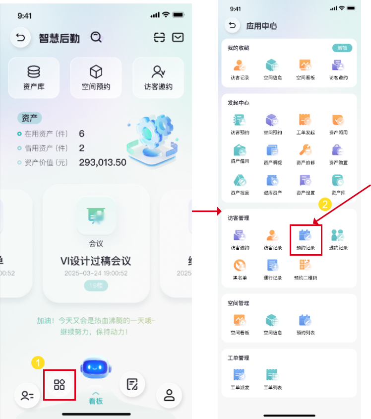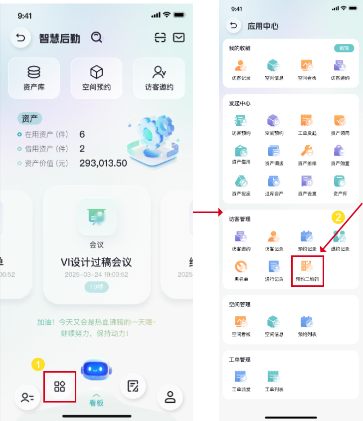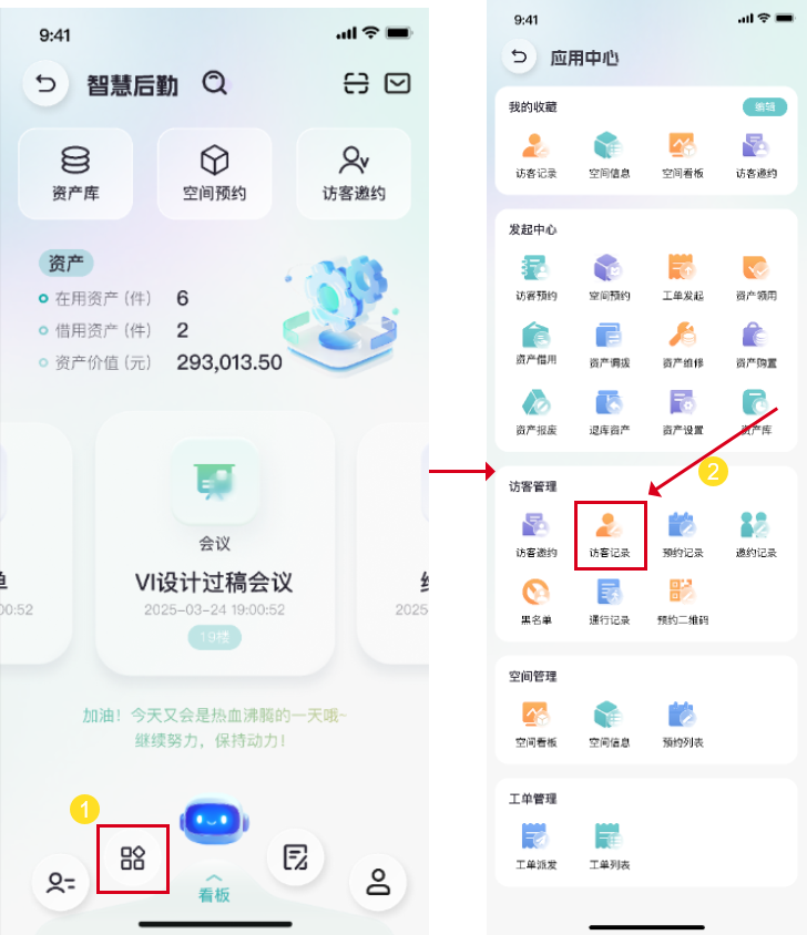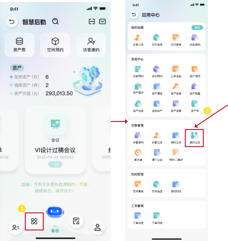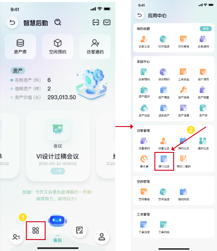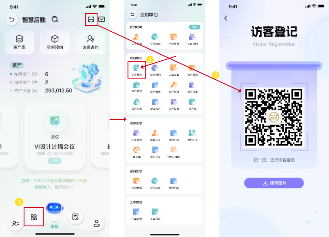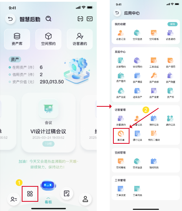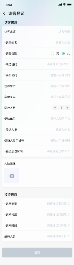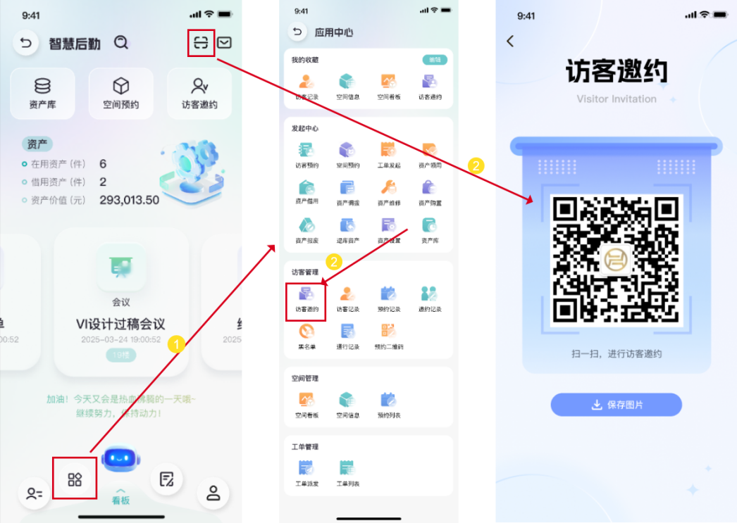 6\.访客管理 6\.1 访客信息 进入路径:  访客列表中查看来访过的所有访客 点击【入黑名单】,禁止访客发起来访申请 点击【详情】,查看访客的基本信息,预约记录,邀请记录,通行记录 点击预约记录中的【详情】,查看访客每次的来访预约信息  6\.2访客邀约 第一条进入路径:应用中心点击访客邀约进入 第二条进入路径:首页扫码进入访客邀约页面  进入访客邀约页面填写好邀约信息,点击【发送邀请】  通过微信或短信,发送URL链接给邀约对象  邀约对象点击打开链接,确认是否应邀  接收方式:点击【接收】邀约,填写出行信息  录入成功,可扫码通行大楼  6\.3 访客登记(访客预约) 第一条进入路径:应用中心点击访客预约进入 第二条进入路径:首页扫码进入访客预约页面  普通用户:到访人员填写登记信息,点击提交可查看到该事项审核情况。如果审核通过,系统生成通行码,扫码即可通行。  内部人员:给到访人员登记信息,点击提交即可,无需审核。  6\.4 预约记录 进入路径:  待审批的预约记录可对其进行入黑名单和去审批,其他状态的预约记录只能对其入黑名单操作。点击预约记录列表卡片,可查看该记录详情。  6\.5邀约记录 进入路径:  针对未到访的访客,可对其邀约记录进行查看详情、下载二维码、接待安排操作; 针对已到访的访客,可对其邀约记录进行查看详情、接待安排操作。  6\.6 通行记录 进入路径:  通过输入访客姓名或选择通行类型/通行时间,查看访客的通行信息  6\.7 黑名单 进入路径:  1. 新增黑名单 2. 编辑黑名单信息 3. 点击黑名单列表卡片,查看黑名单详情 4. 移除黑名单  6\.8 预约二维码 进入路径:  新增预约二维码 下载预约二维码、编辑二维码信息 点击预约二维码列表卡片,查看二维码详情 移除预约二维码